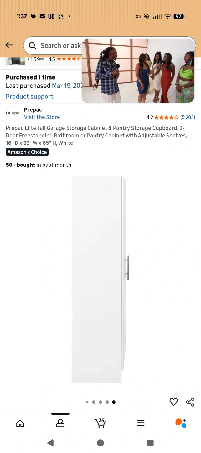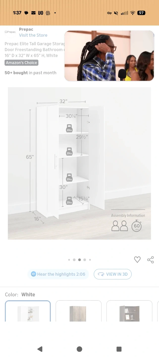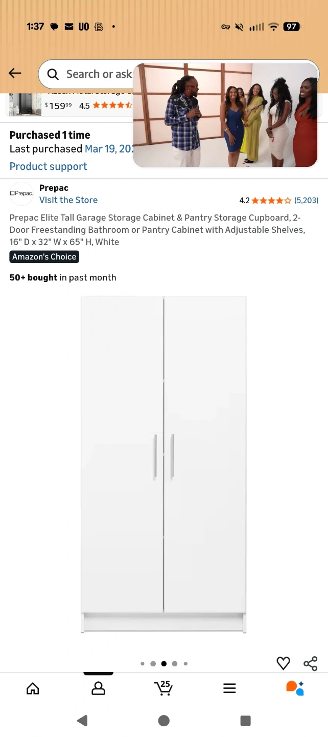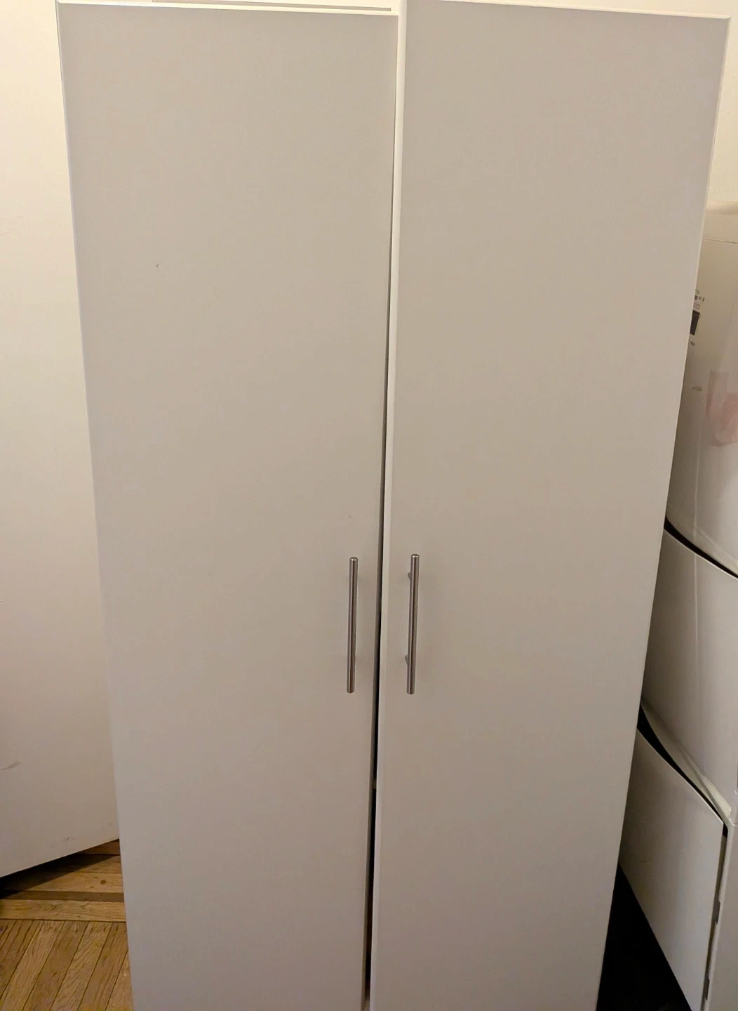 I'm selling a Prepac Elite Tall Garage Storage Cabinet! It's a 2-door freestanding cabinet that's perfect for a bathroom or pantry. It has adjustable shelves, and it's in white. The dimensions are 16" D x 32" W x 65" H. It's been here for two years but I replaced it with another cabinet a year ago that fit my room a little better. So, it's been untouched for about a year. Still in great condition.