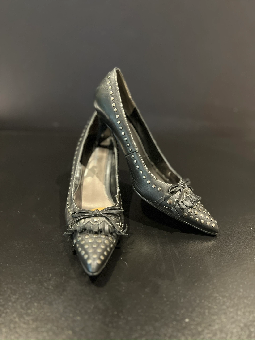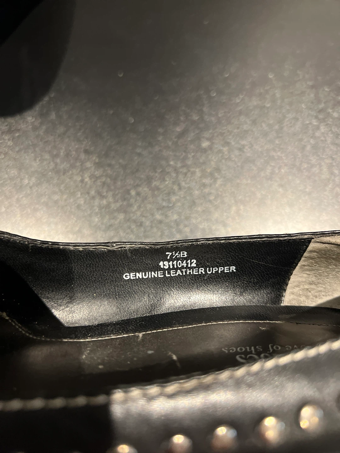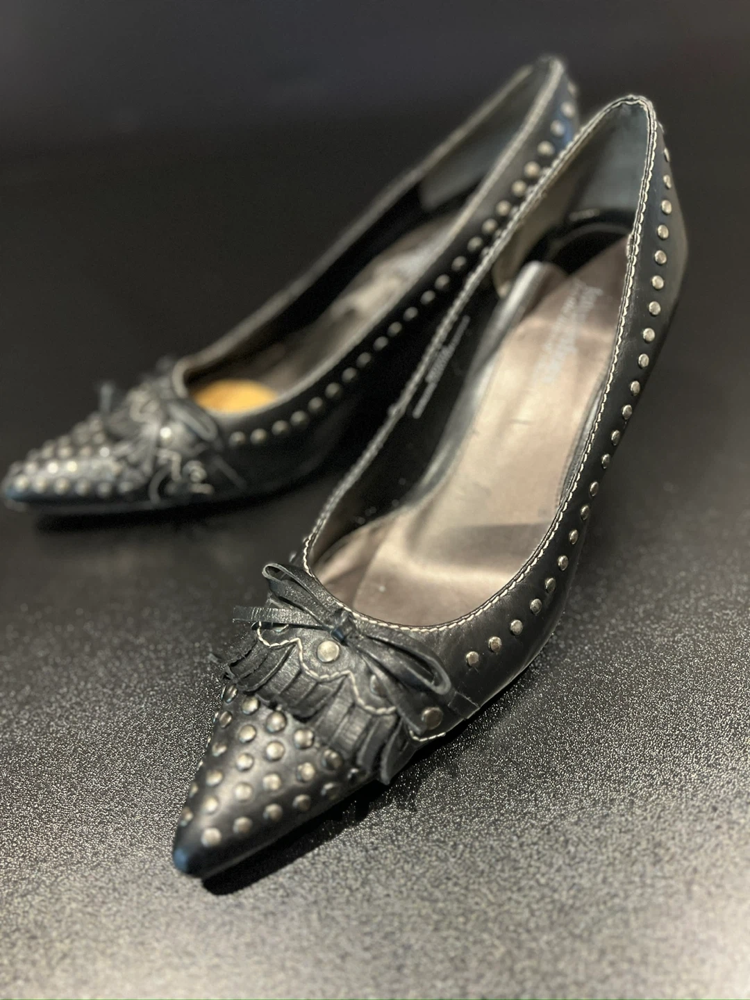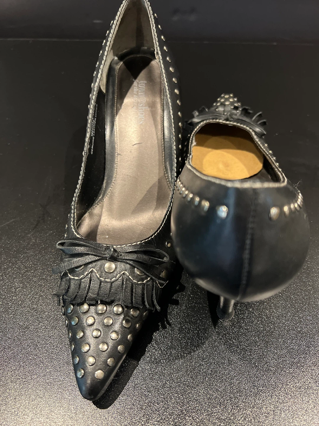 Selling a pair of gorgeous black leather Towne Shoes heels in size 7.5. They have a unique studded design and bow detail. The heel height is approximately 3 inches. They are in excellent condition and ready for a new owner!