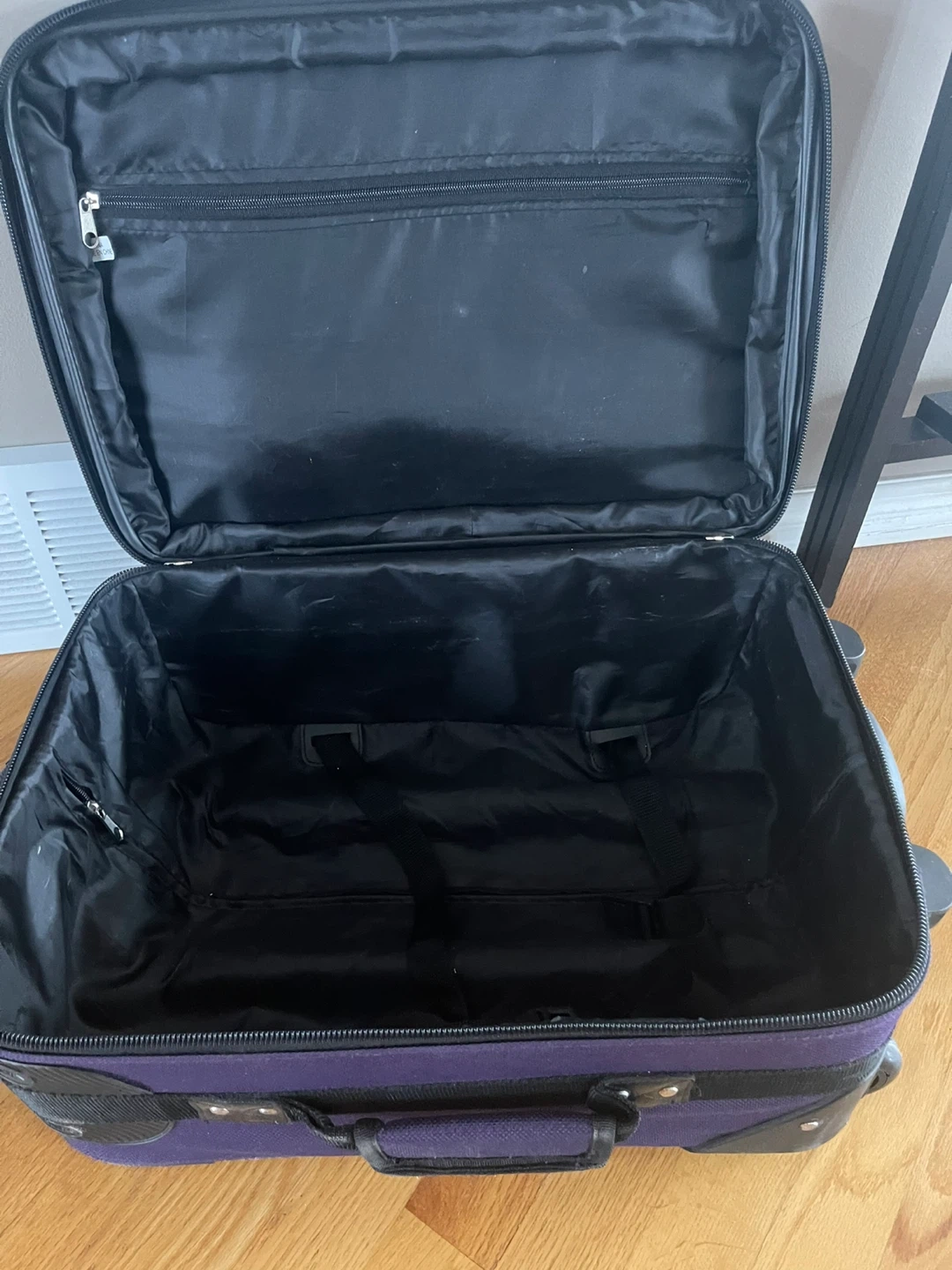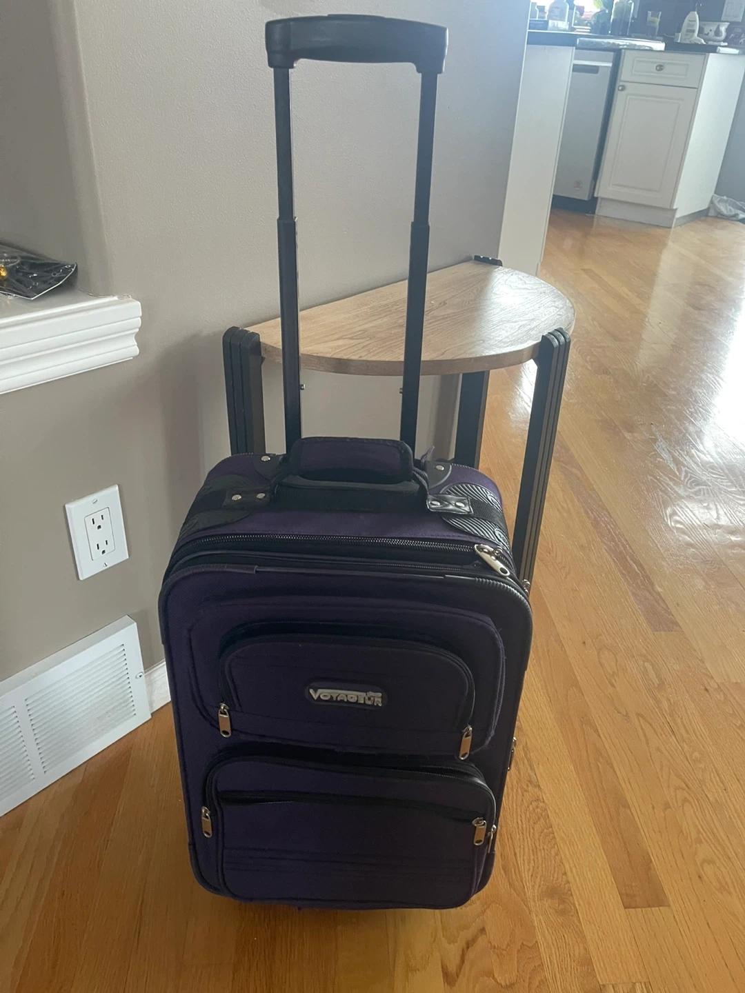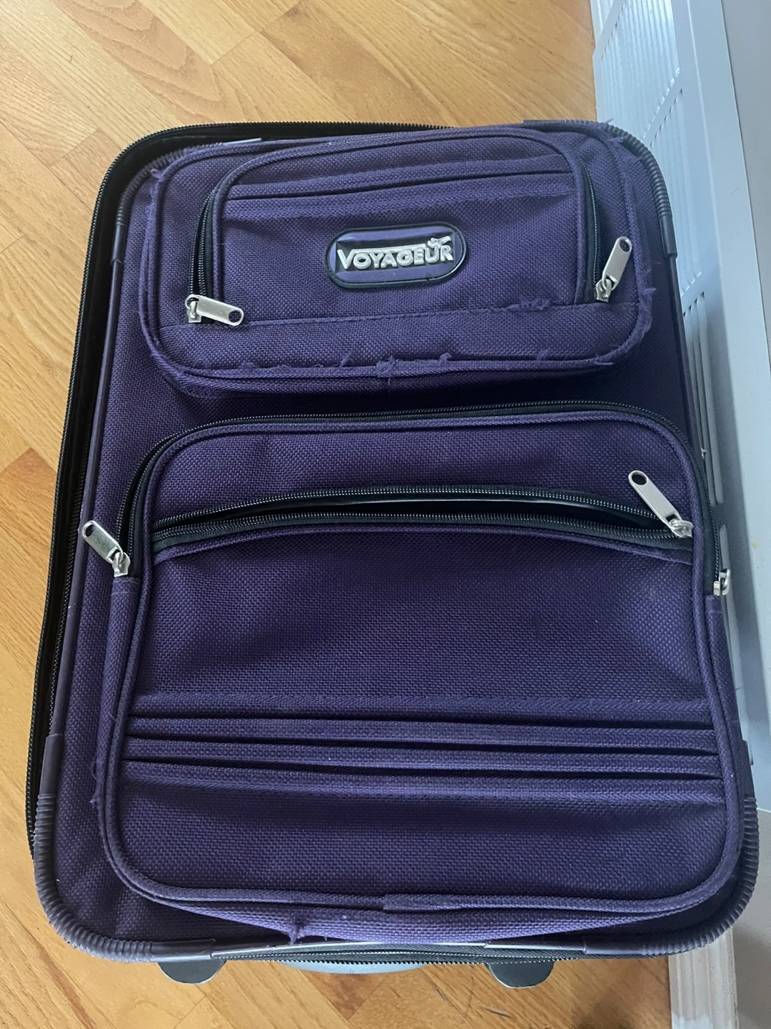 Selling a Voyageur carry-on suitcase in purple. It's a great size for short trips and fits easily into overhead compartments. Shows some signs of use, but still has lots of life left!