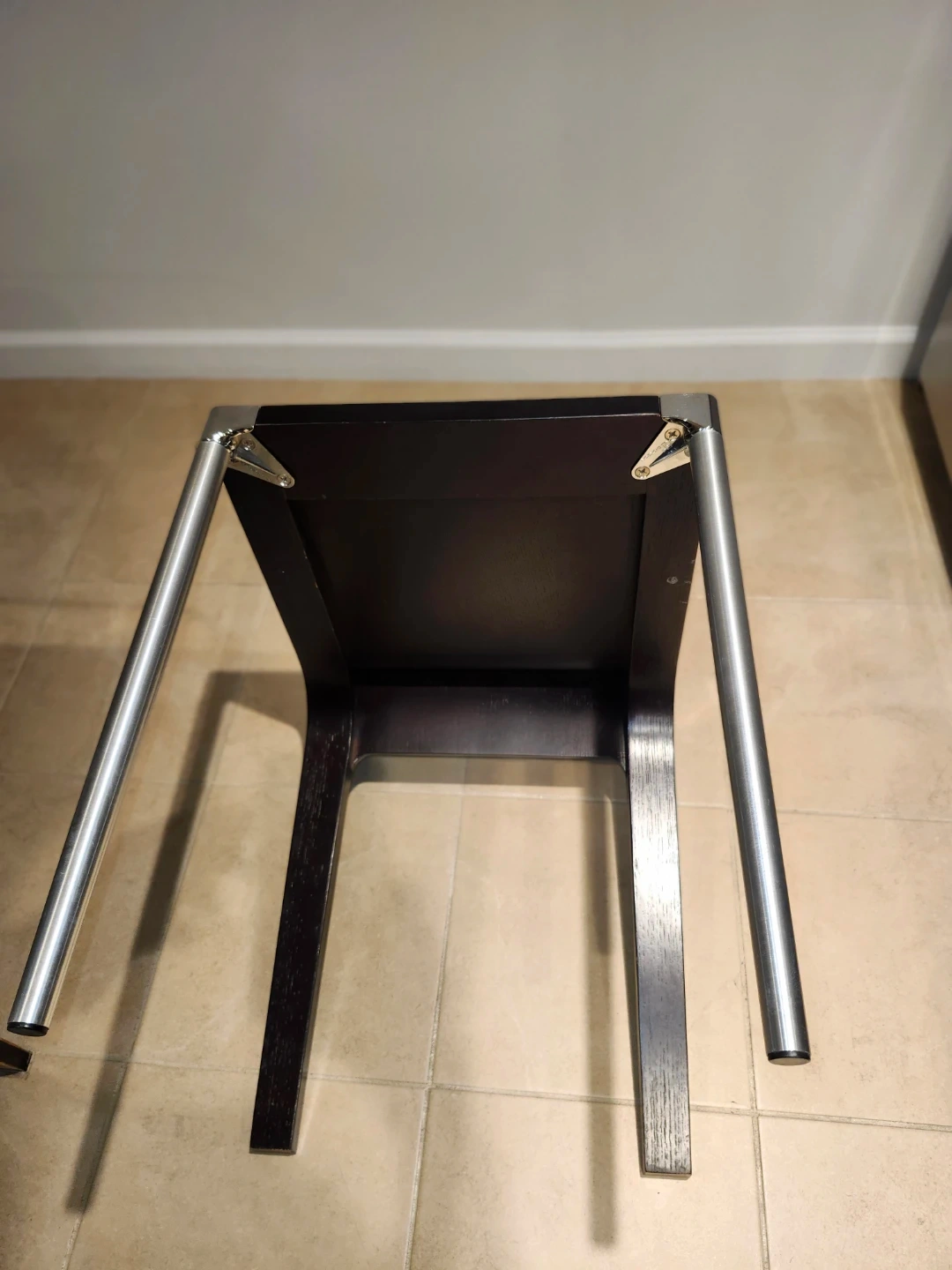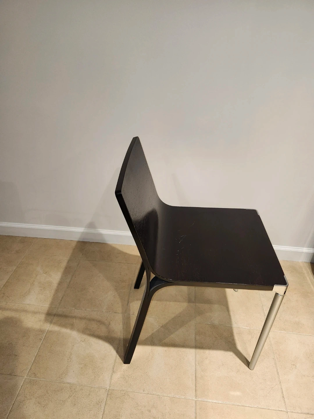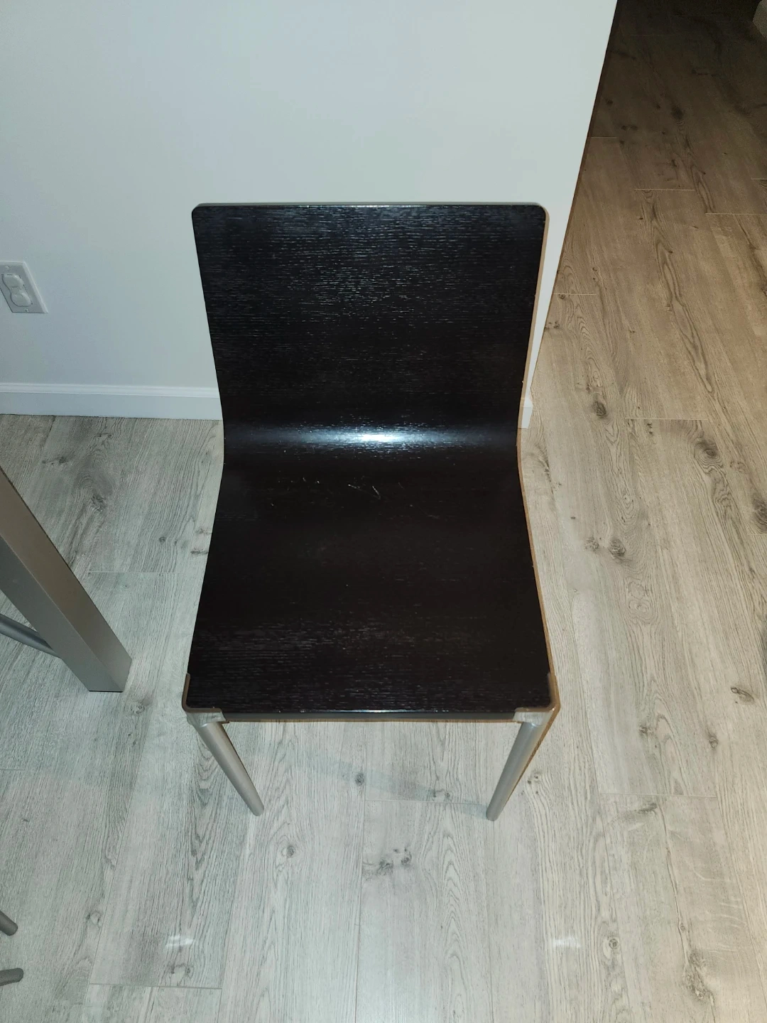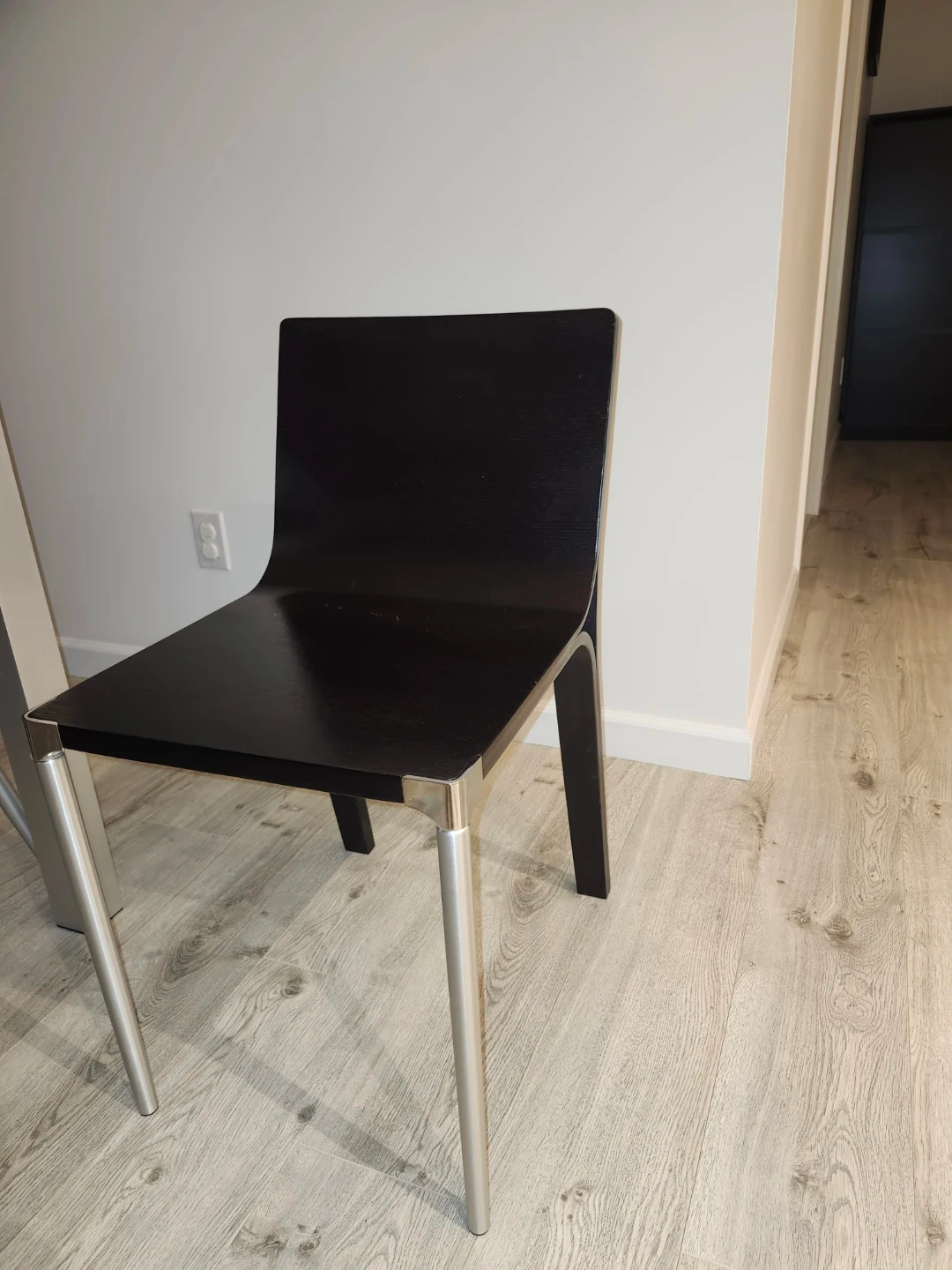 Selling 3 stylish dark brown wooden chairs featuring sleek front silver legs. Two are in great condition one has a minor factory defect, also spare leg. 20per chair or 60for all 3.