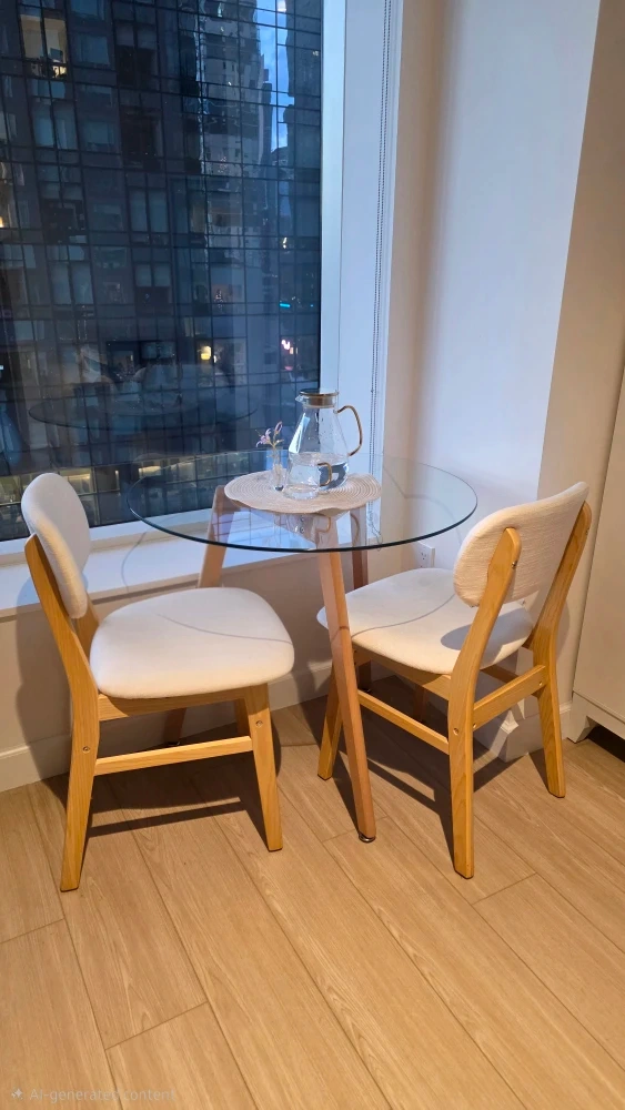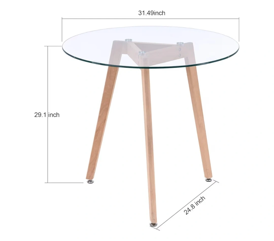 Selling a round glass dining table with two chairs. The chairs have a light-colored fabric seat and a wooden frame. It's perfect for a small dining area or kitchen!