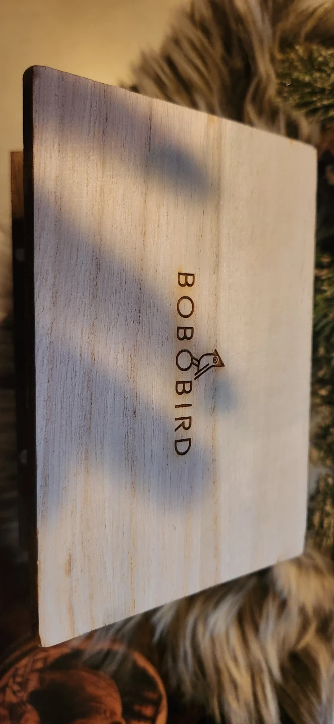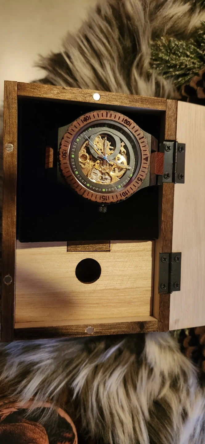 Selling a BOBO BIRD wooden automatic watch. It comes in its original box, making it a great gift or a nice treat for yourself! The watch features a unique skeleton design, showcasing the intricate inner workings. It's a real conversation starter
