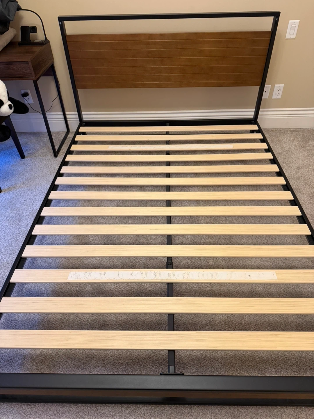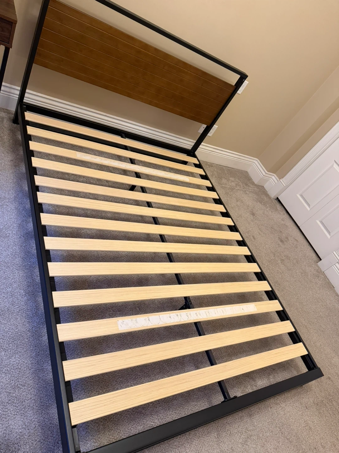 Selling a queen size bed frame. It's made of metal and bamboo, and it's in great shape. Dimensions are 80.00 x 59.50 x 14.00 inches. It's a sturdy and stylish bed frame that's easy to assemble.