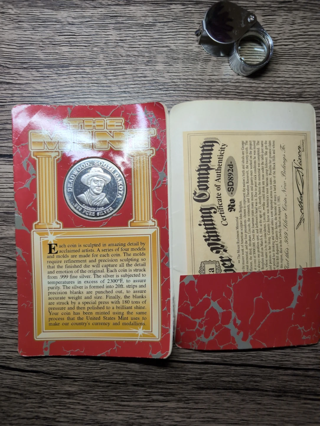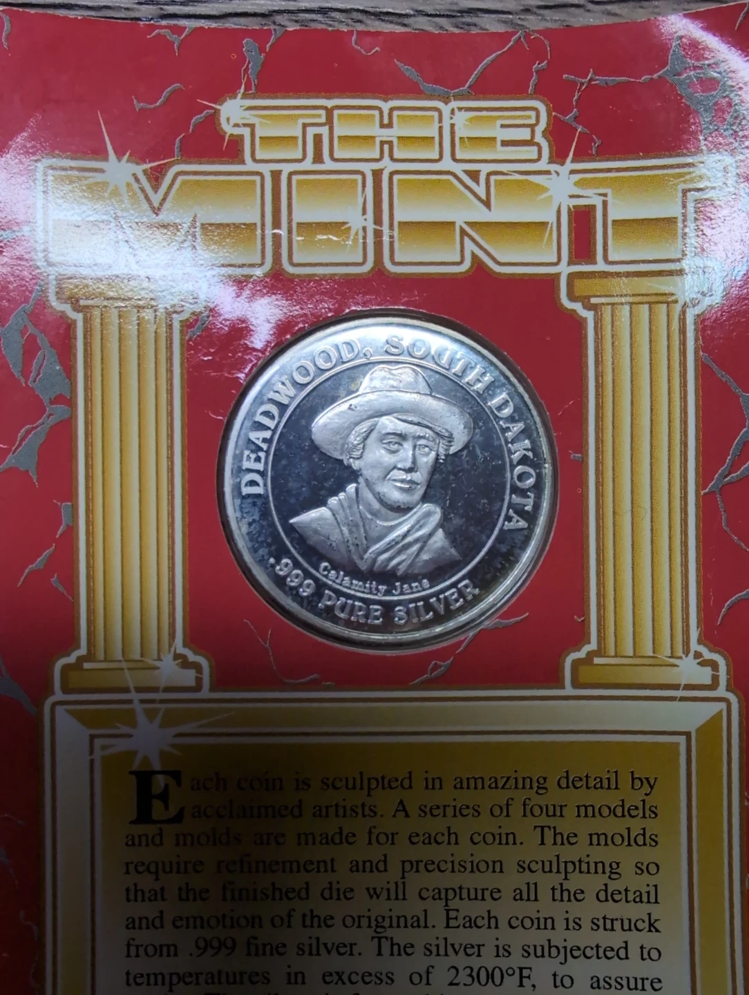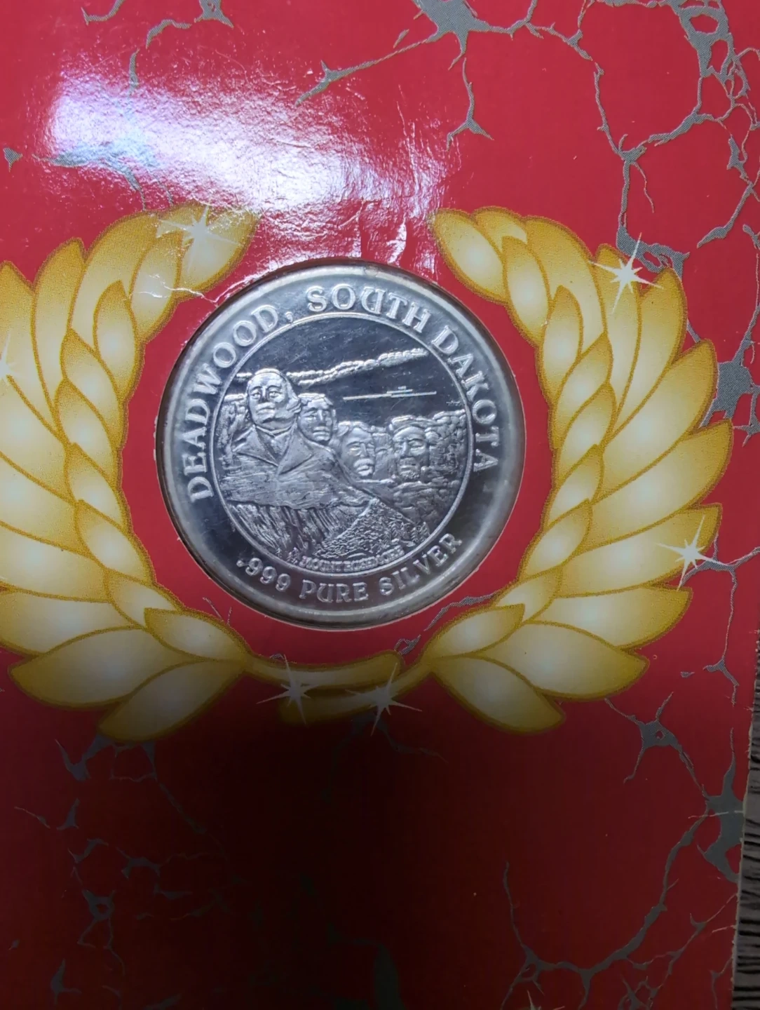 Selling a Deadwood South Dakota .999 pure silver coin. It is sculpted in amazing detail by acclaimed artists. The coin is struck from .999 fine silver. Your coin has been painted using the same process that the United States Mint uses to make our country's currency and medallions. Comes with a certificate of authenticity