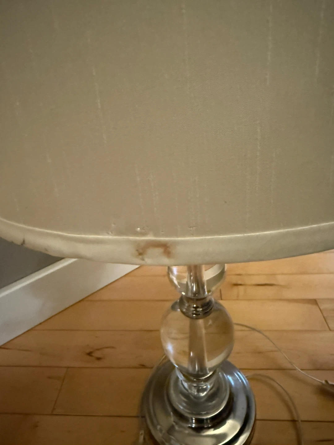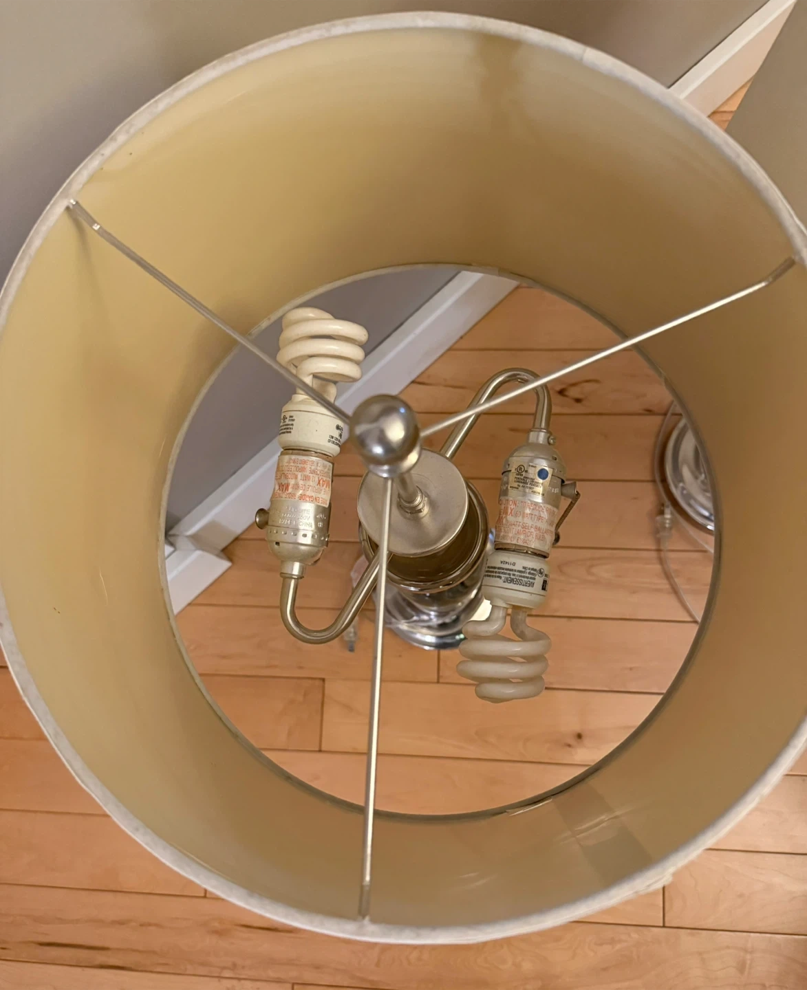 Two double light lamps measuring 33 cm in diameter by 64 cm high. They work great. There is a small amount of damage on each shade - see photos 3 and 4.