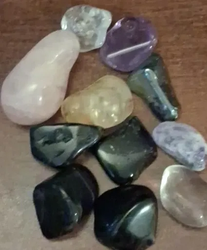 Here's a collection of tumbled gemstones! These include clear quartz, amethyst, rose quartz, citrine, and obsidian. They're perfect for collecting, crafting, or just admiring their natural beauty.