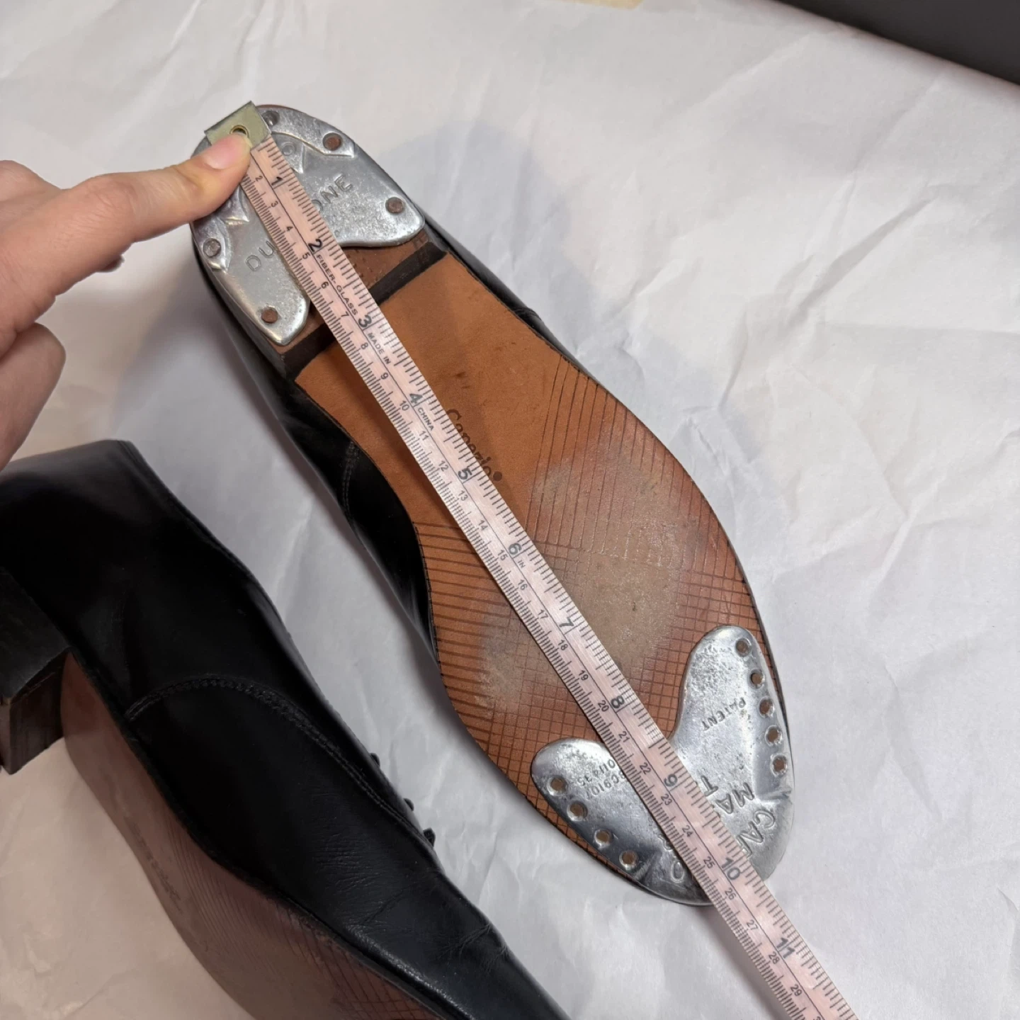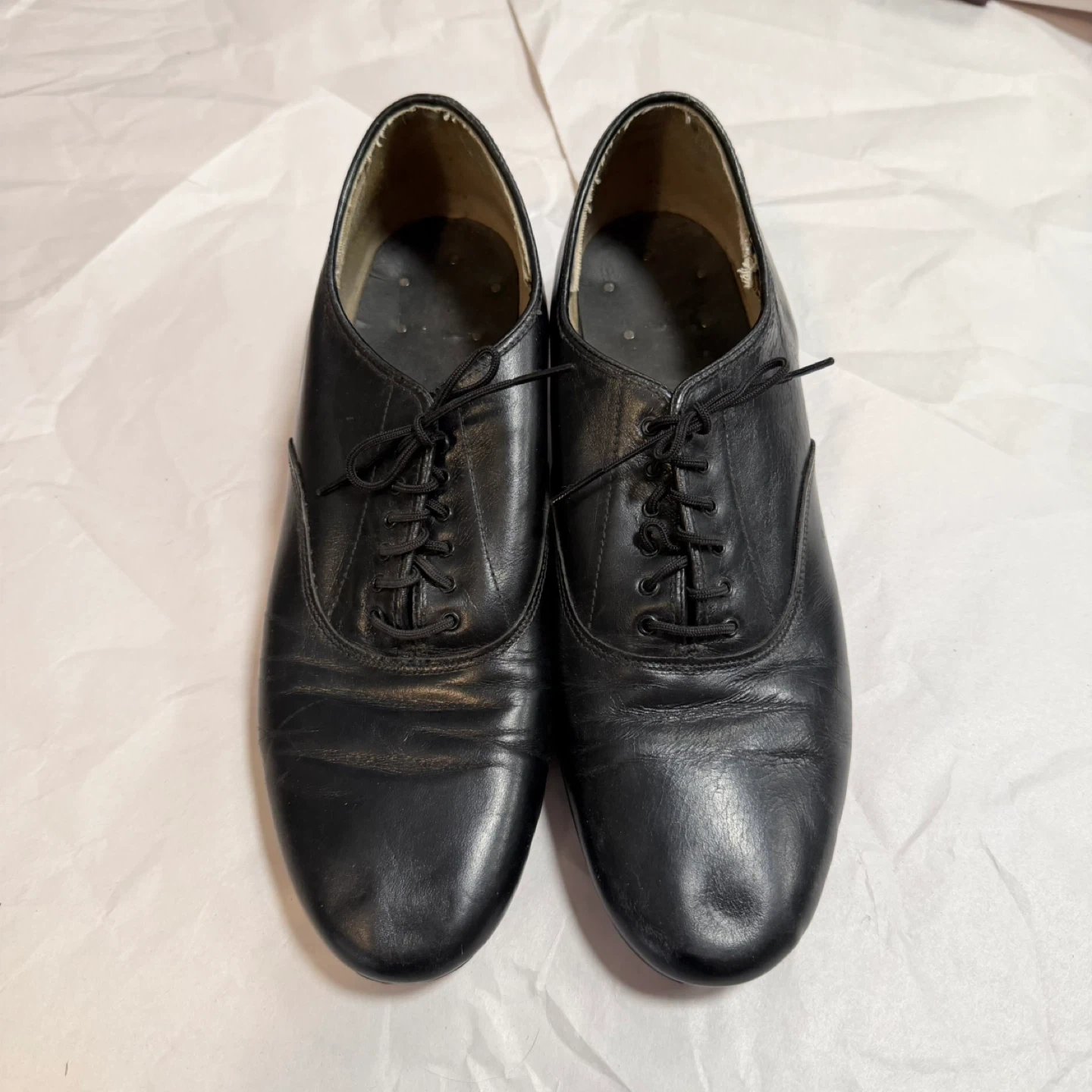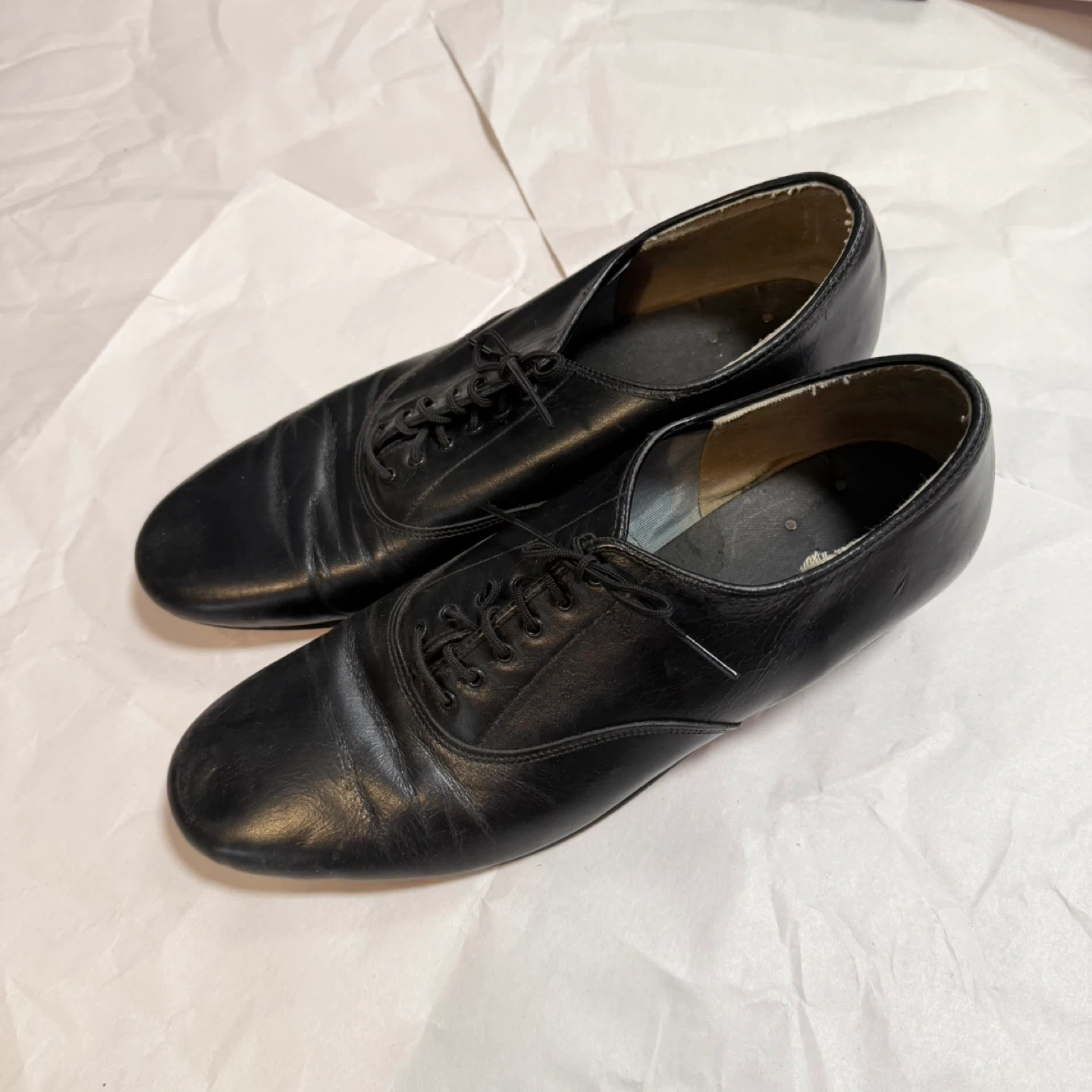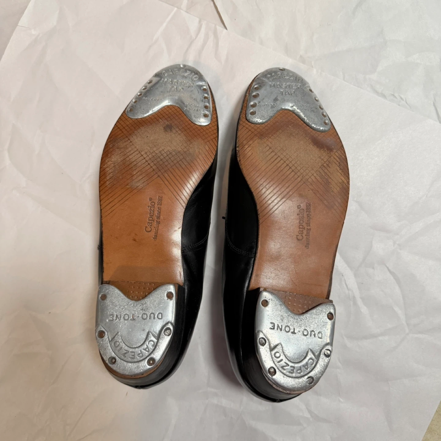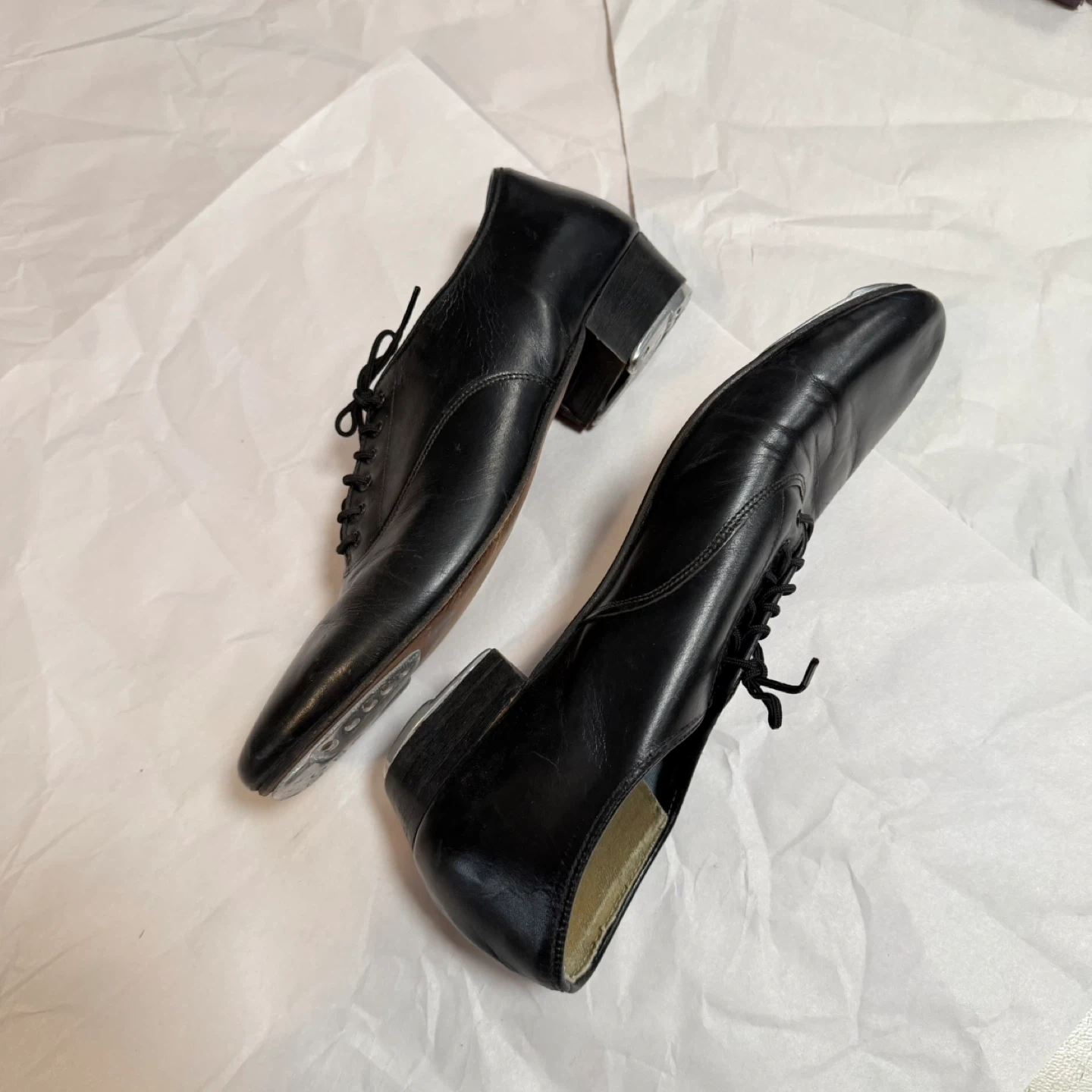 They are black and show signs of wear. Perfect for someone who needs a pair of tap shoes!