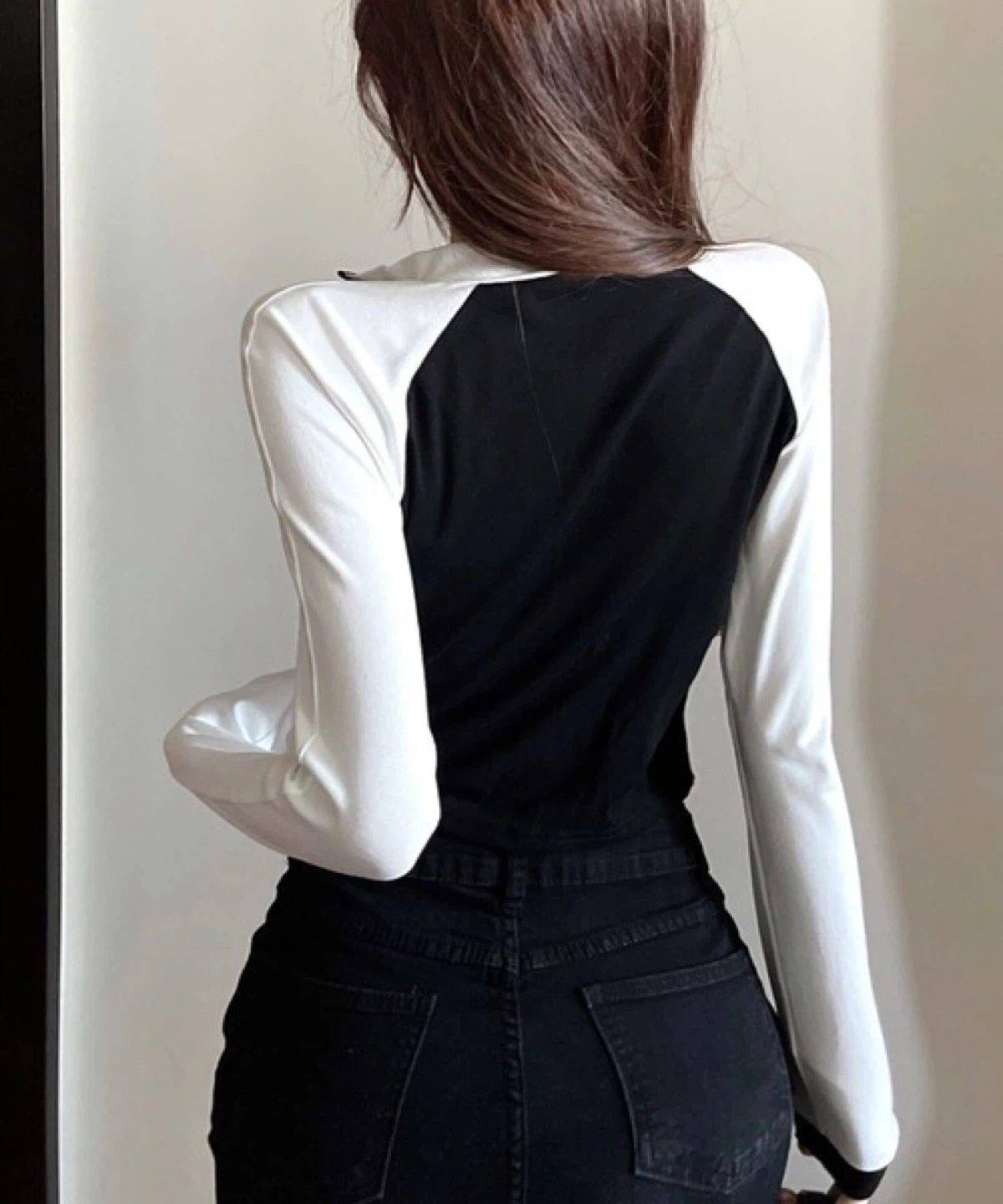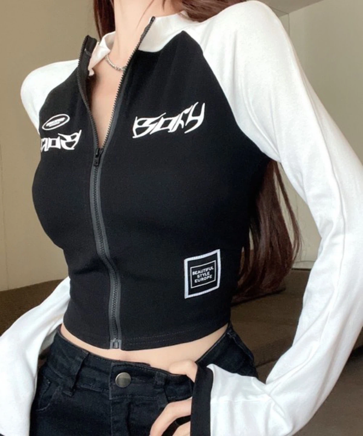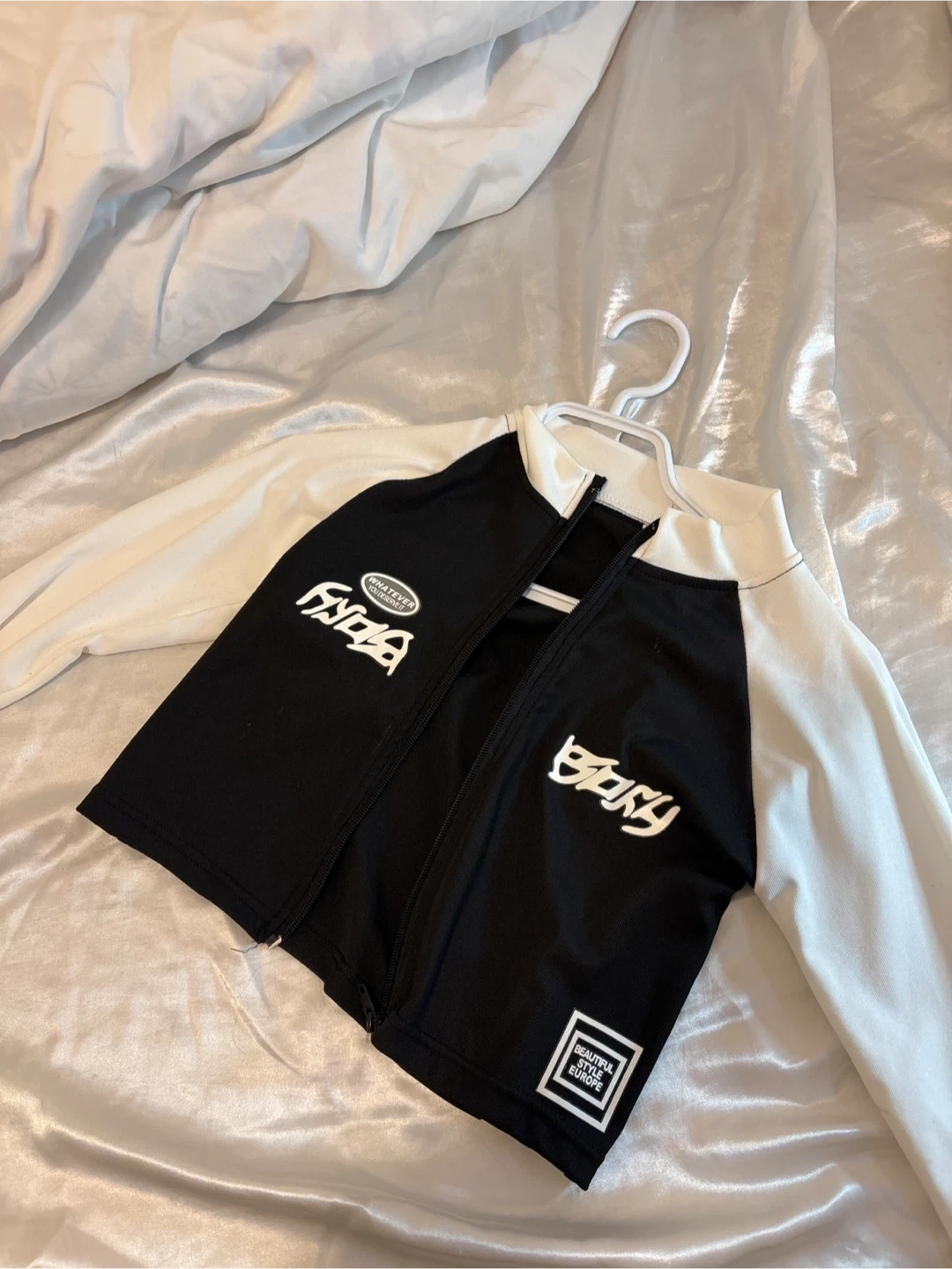 This is a stylish black and white long sleeve zip-up jacket. It features a unique design with lettering on the front. Perfect for adding a trendy touch to your wardrobe!