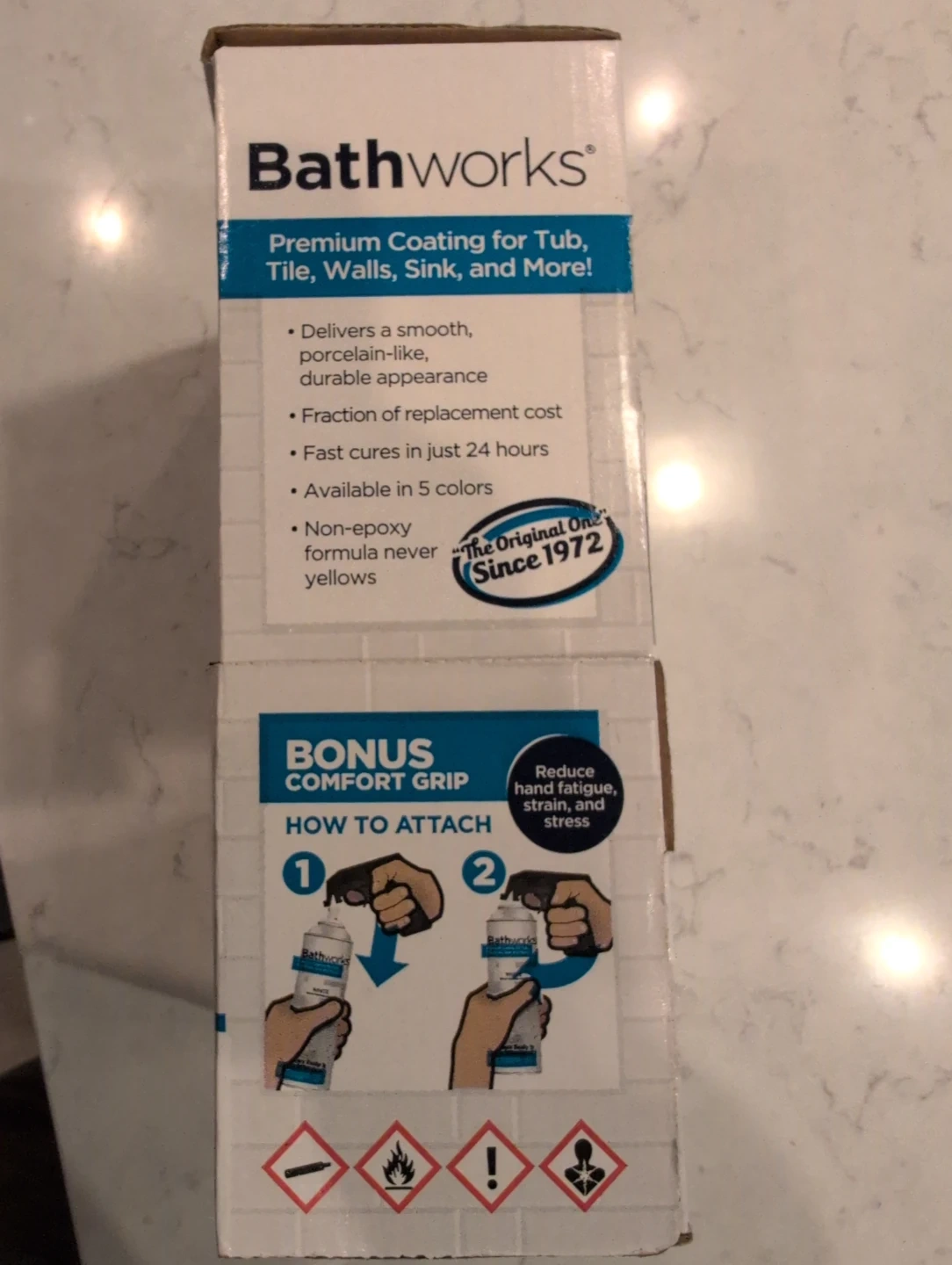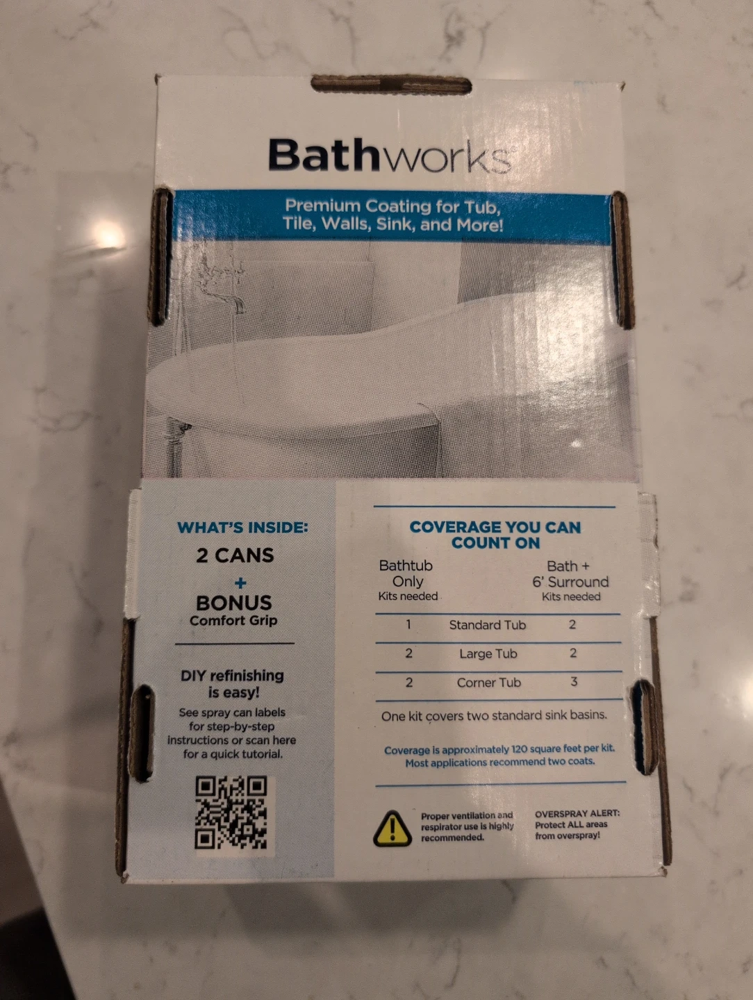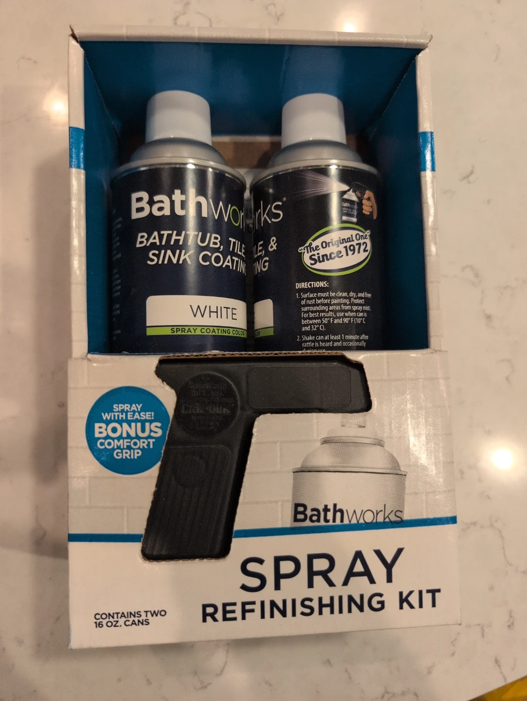 Selling a Bathworks spray refinishing kit for your bathtub, tile, and sink! The kit contains two 10 oz cans and a bonus comfort grip. It delivers a smooth, porcelain-like, durable appearance and cures in just 24 hours. The kit covers approximately 120 square feet, enough for two standard sink basins. The box is included!