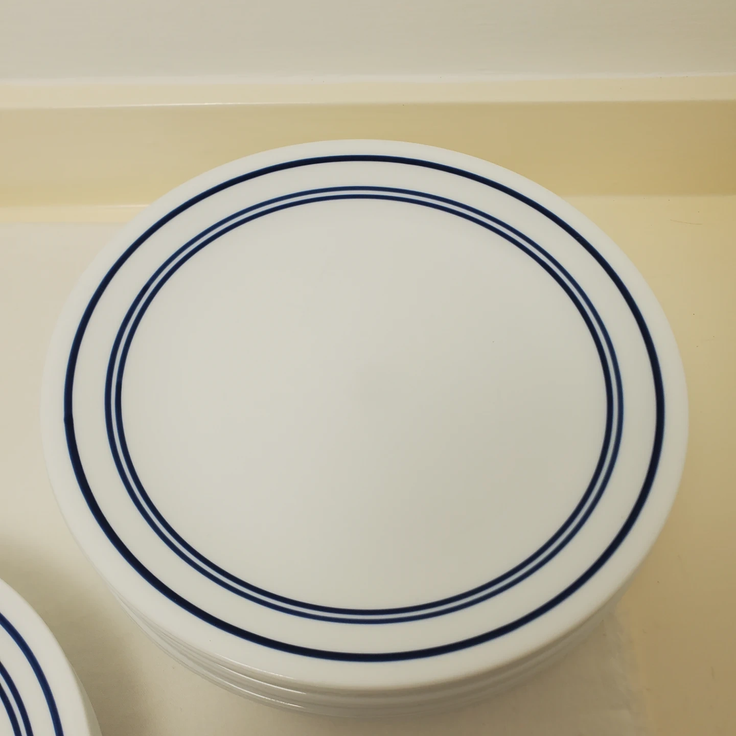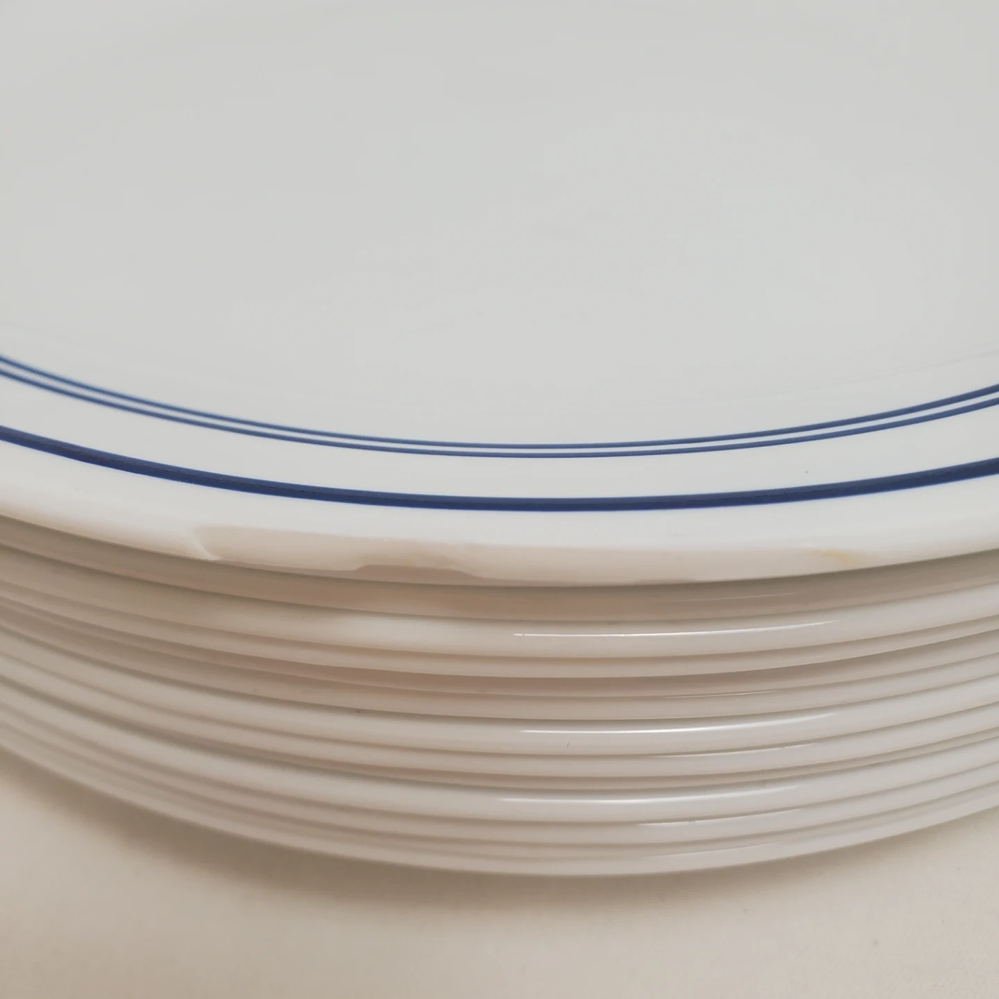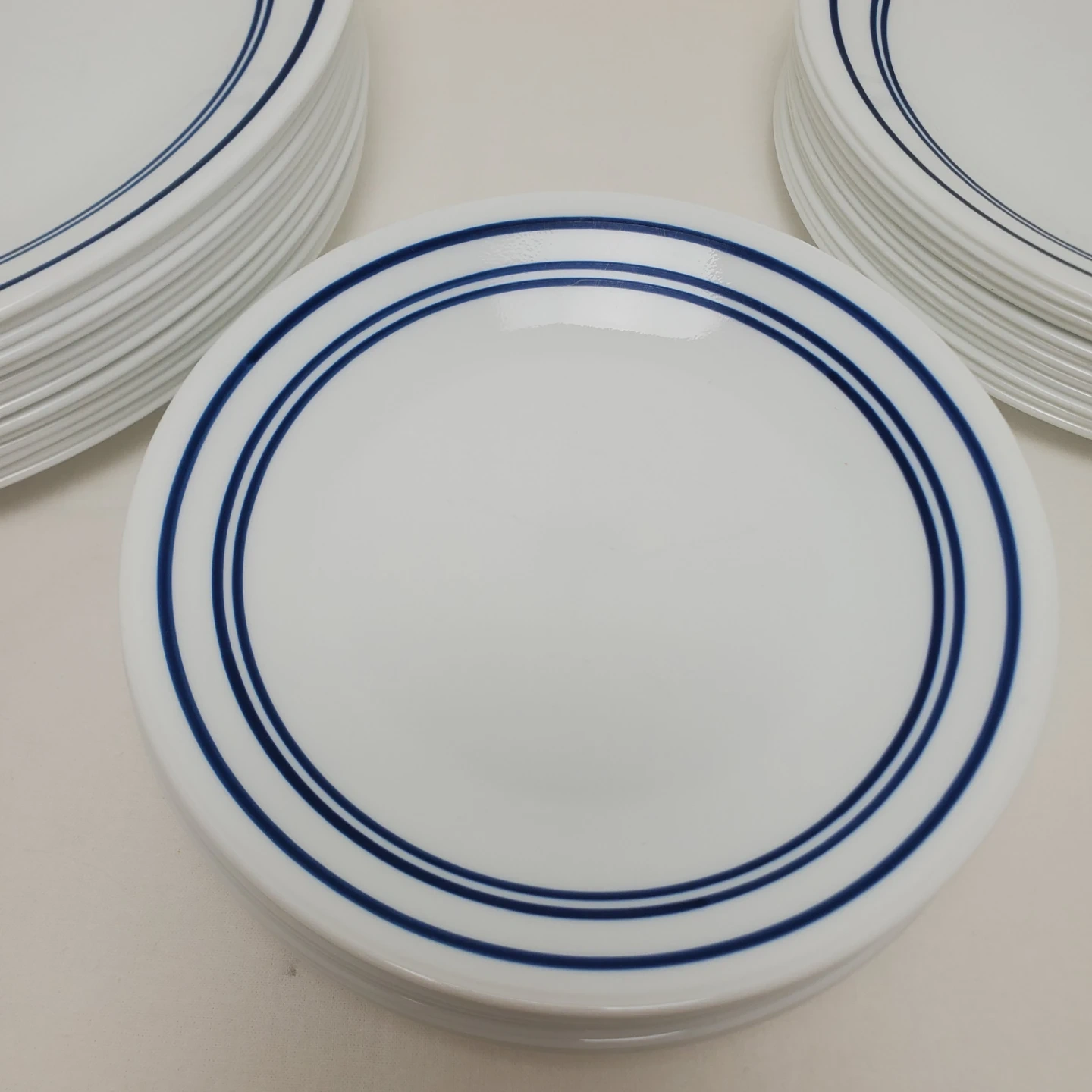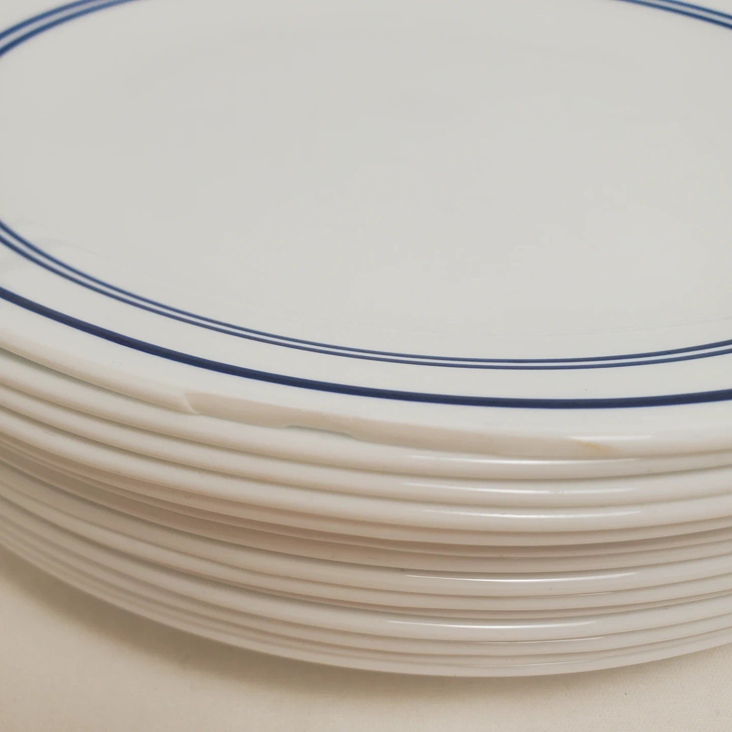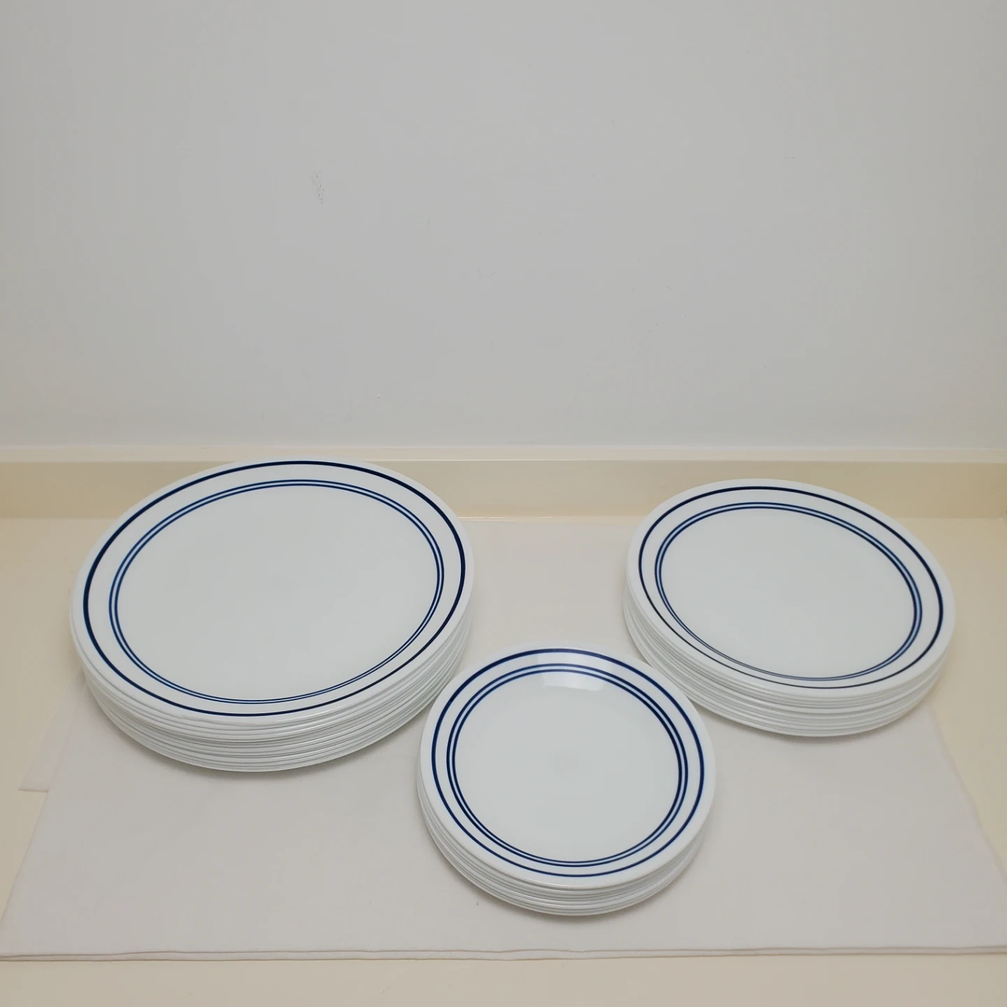 Selling a set of Corelle dinnerware with the classic blue line design! This set includes dinner plates, salad plates, and dessert plates. They're lightweight and durable, perfect for everyday use. There are some signs of wear and tear, but overall they are in good condition.