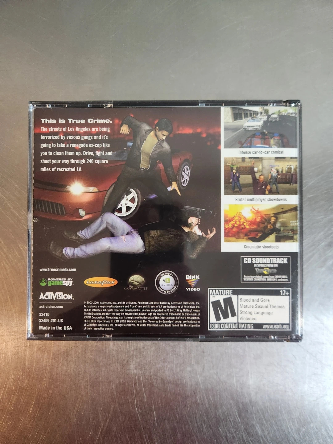 Selling a copy of True Crime: Streets of LA for PC. It's rated Mature 17+ by the ESRB for Blood and Gore, Mature Sexual Themes, Strong Language, and Violence. Enjoy intense car-to-car combat, brutal multiplayer showdowns, and cinematic shootouts in a recreated Los Angeles