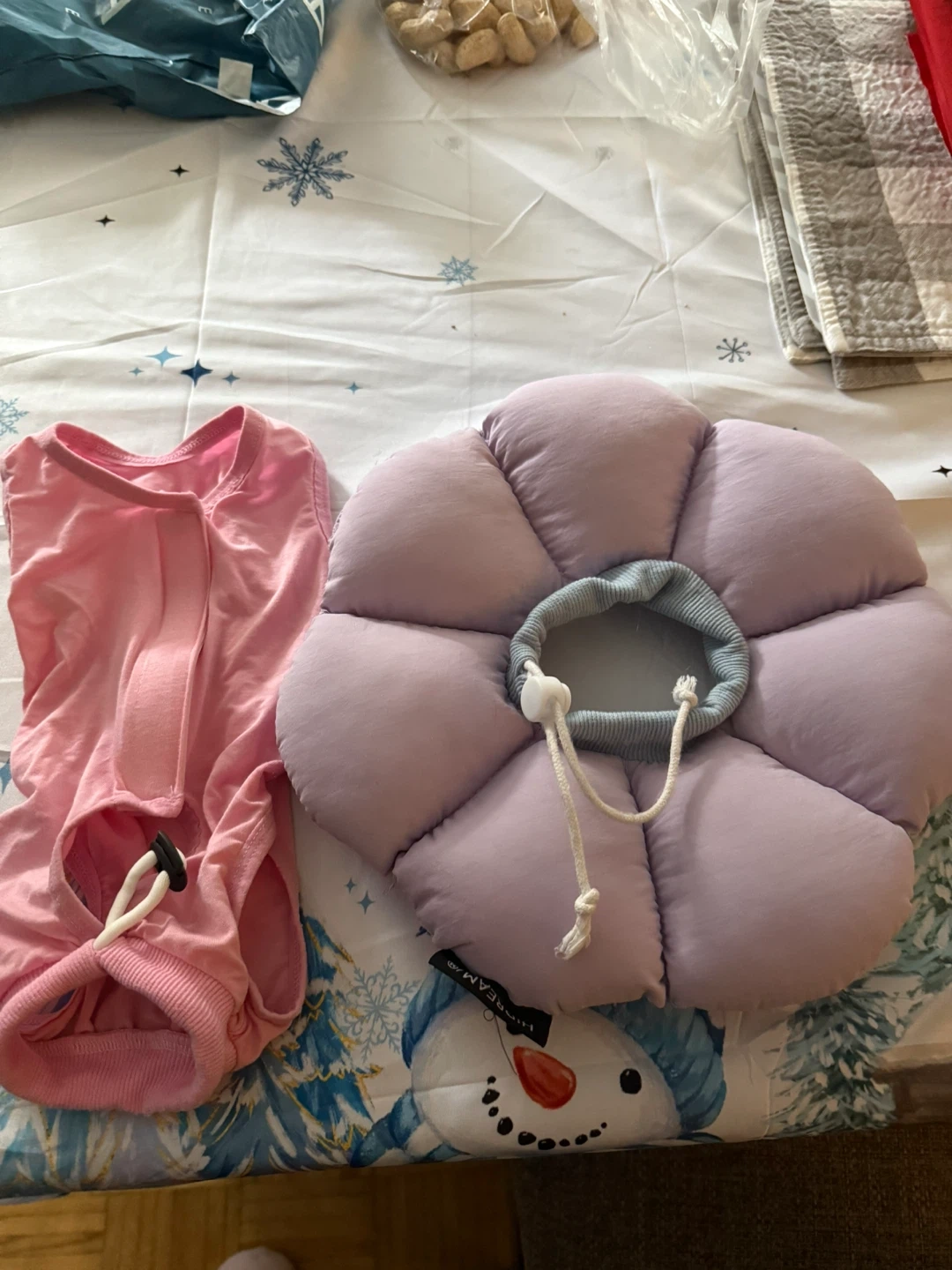 Selling a pet recovery collar and 2 cat onesies size M. The collar is flower-shaped and lavender in colour. The clothes are pink. Both are in good condition! 20$ for everything