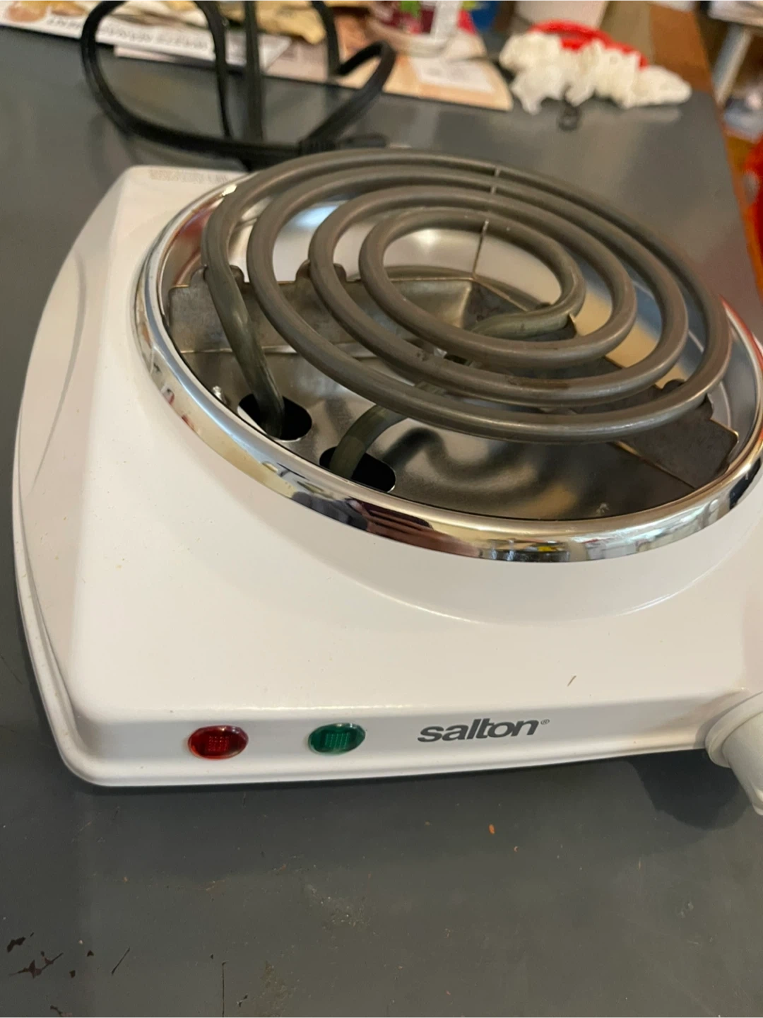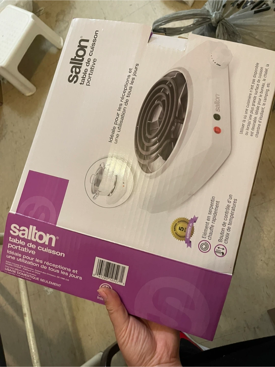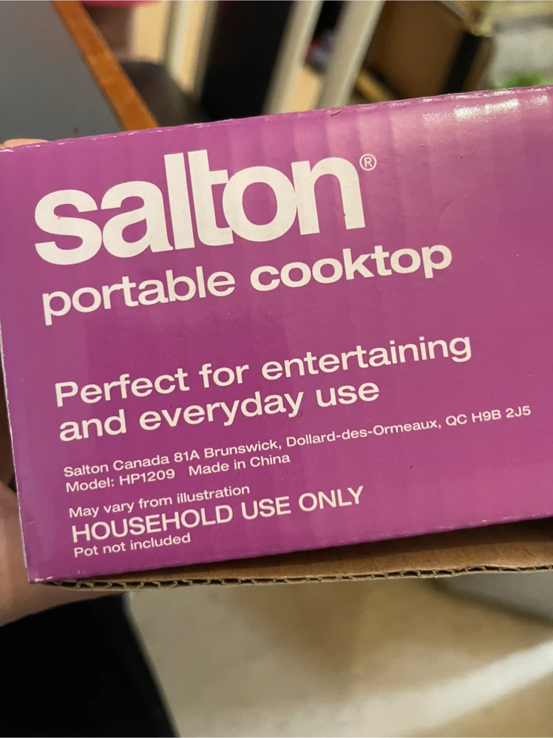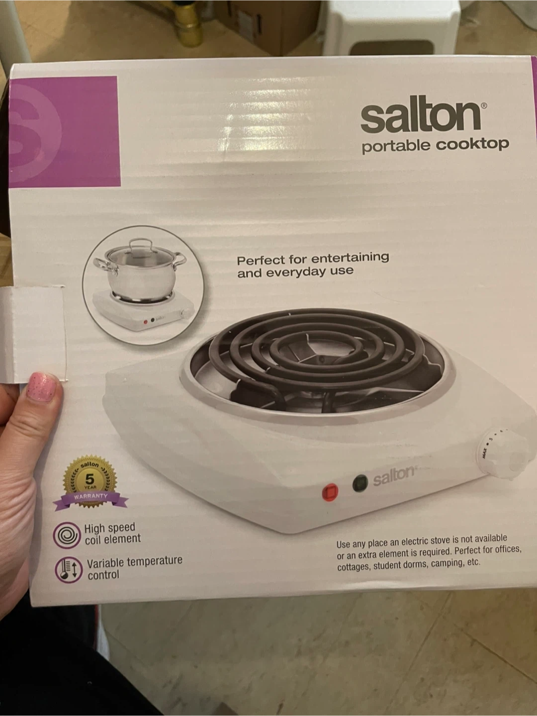 Selling a Salton portable cooktop. It's perfect for entertaining and everyday use, especially where a regular stove isn't available, like offices, cottages, student dorms, or camping! It features a high-speed coil element and variable temperature control. The box is included!