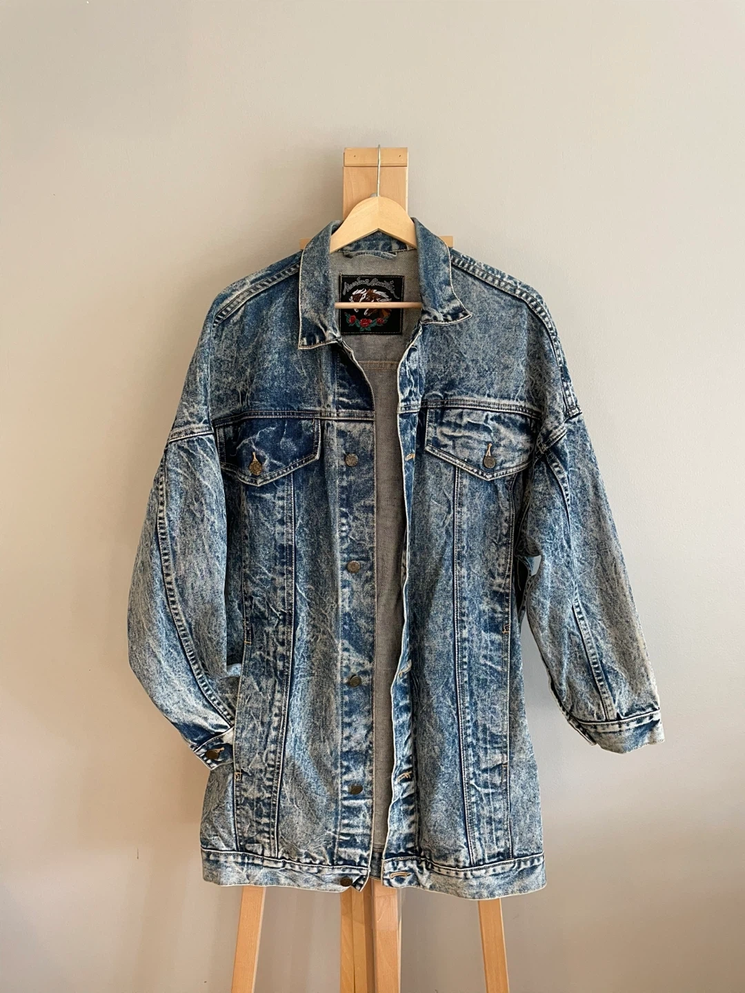 Vintage longline American Beauty denim jacket in a size small (oversized fit). It's got a unique acid wash and some really great details like the horse logo on the buttons and the embroidered patch on the inside. It’s in great shape and has inner and outer storage pockets as well as functional chest flap pockets