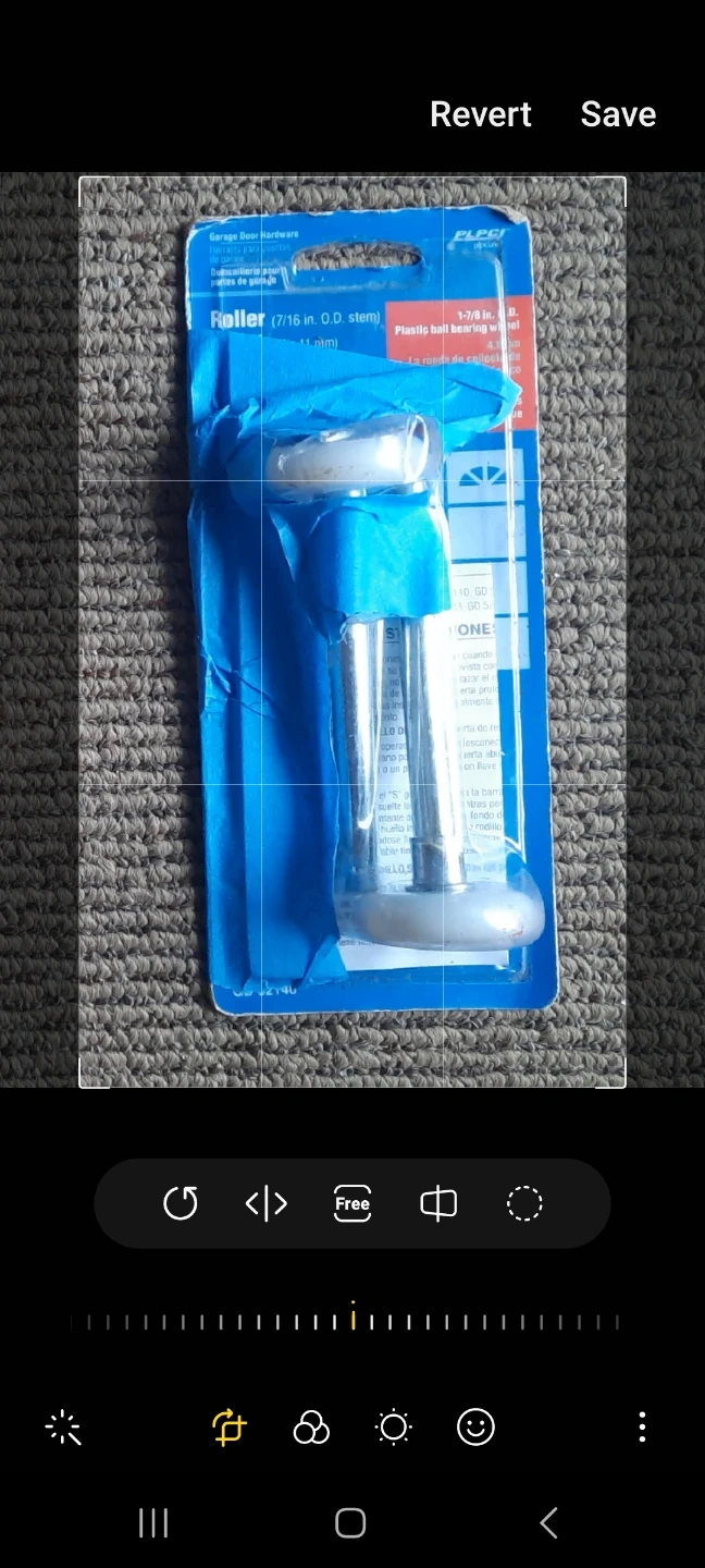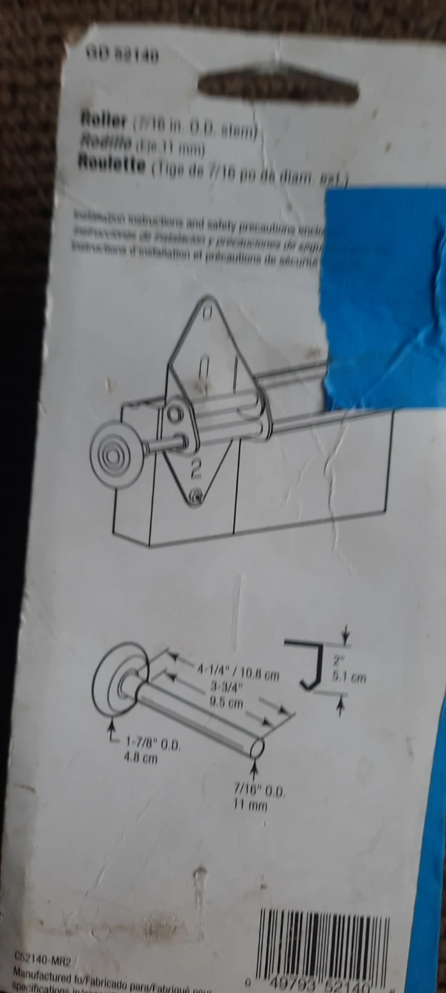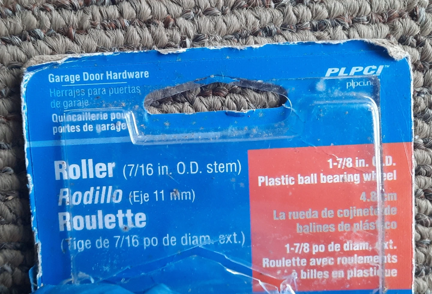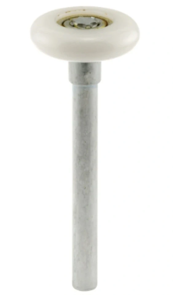 PLPCI garage door roller. New. It has a 7/16 inch O.D. stem and a plastic ball bearing wheel. The roller measures 1-7/8 inches O.D. (4.8 cm).
