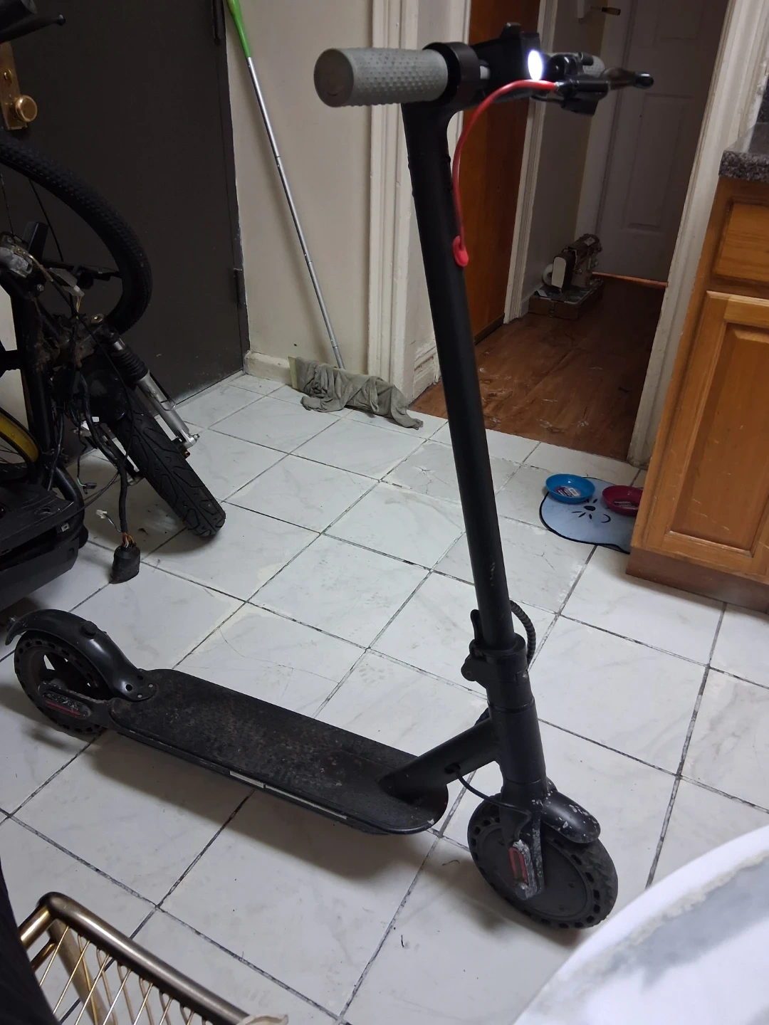 Selling a used black electric scooter. It shows signs of use, but is still in working condition. Perfect for getting around town!
