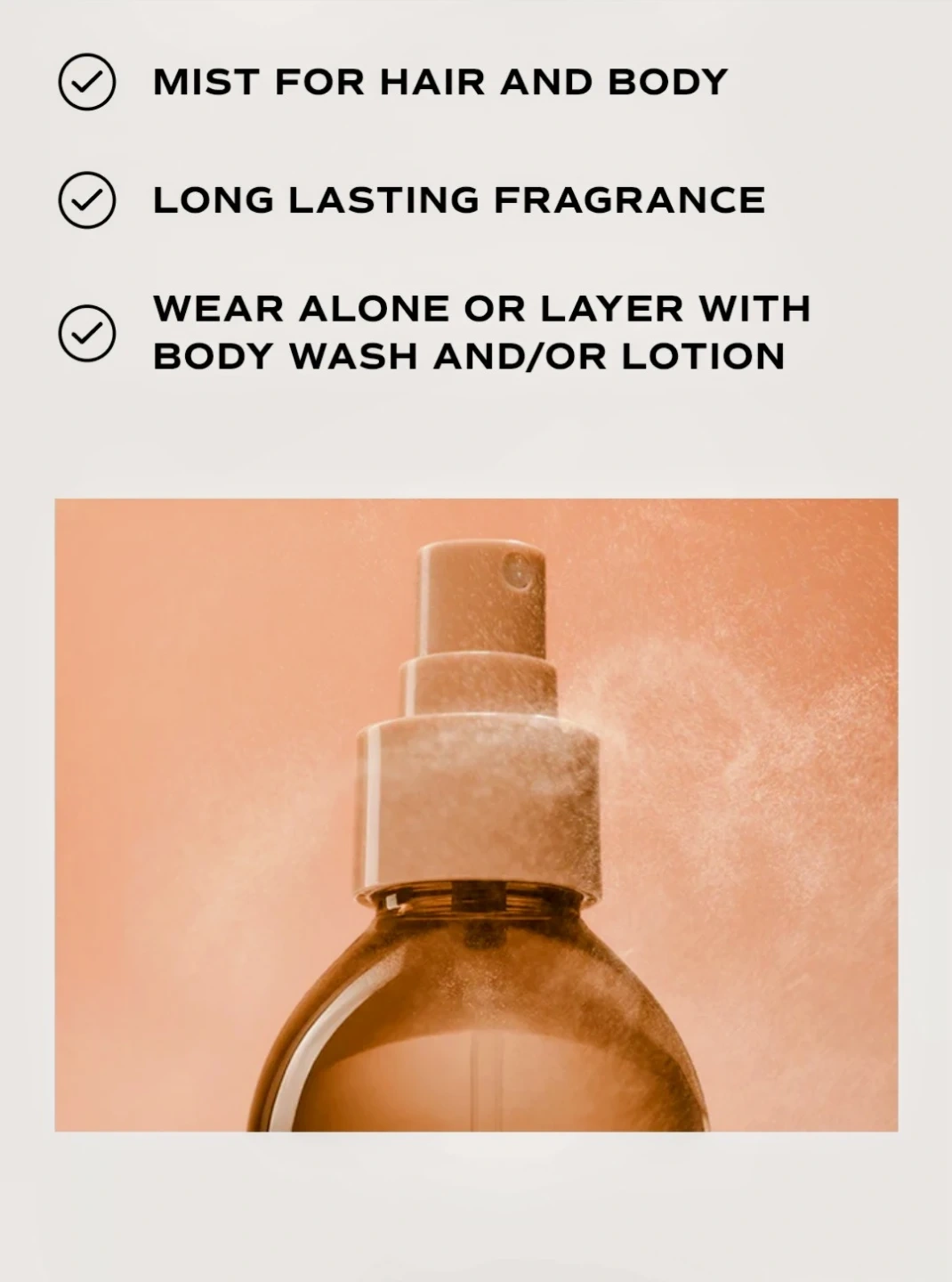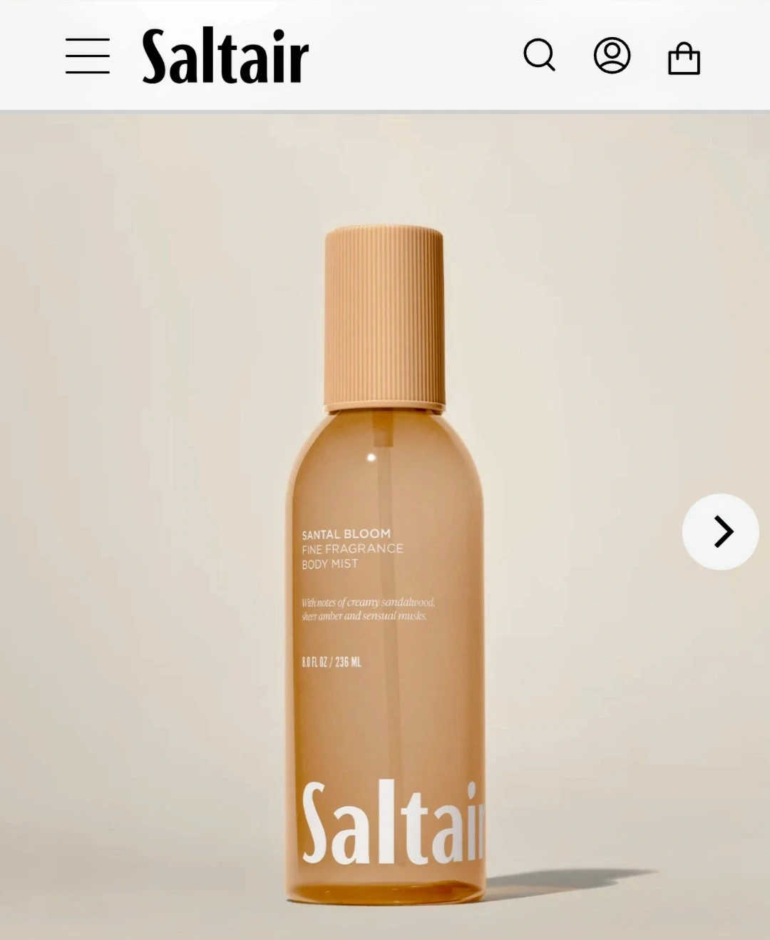 This is a Saltair Santal Bloom Fine Fragrance Body Mist. It is a mist for hair and body with a long-lasting fragrance. You can wear it alone or layer it with body wash and/or lotion. It has notes of creamy sandalwood, sheer amber, and sensual musks. It is also dermatologist tested, cruelty-free, paraben-free, gluten-free, and vegan. Net weight: 8.0 fl oz / 236 mL