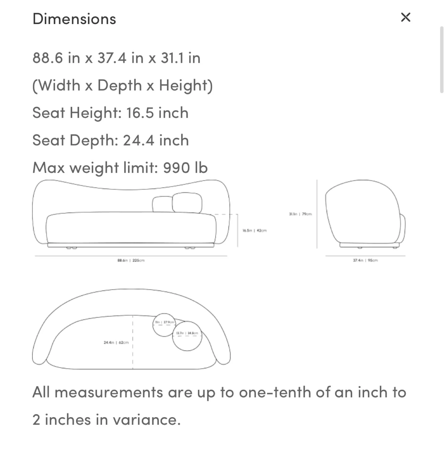 Dimensions: 88.6 Width × 37.4 Depth × 31.1 Height (in)