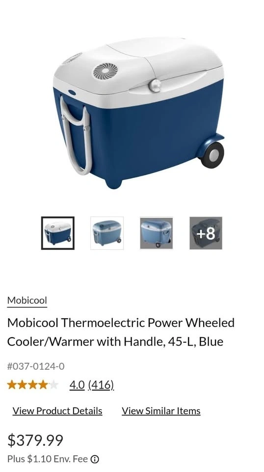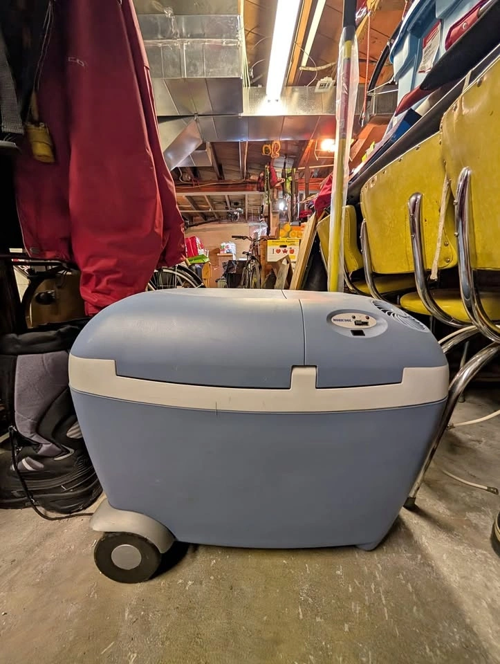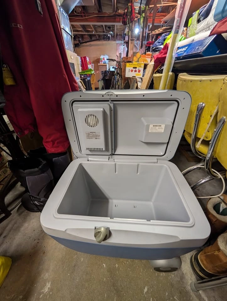 Has all cords. No issues with wheels, lock or fan. Keeps food hot or cold depending on use. Few cosmetic scratches in the lid.