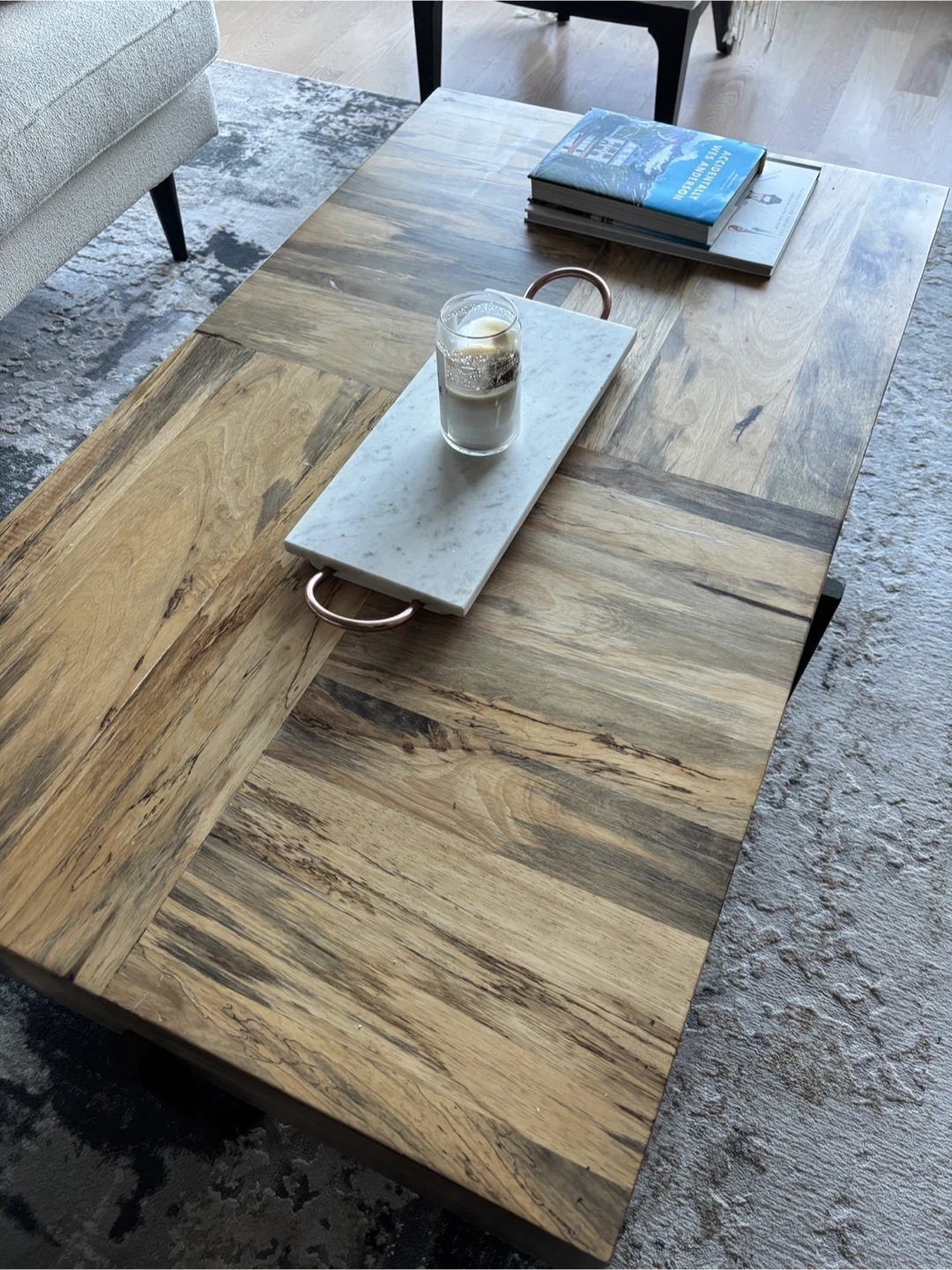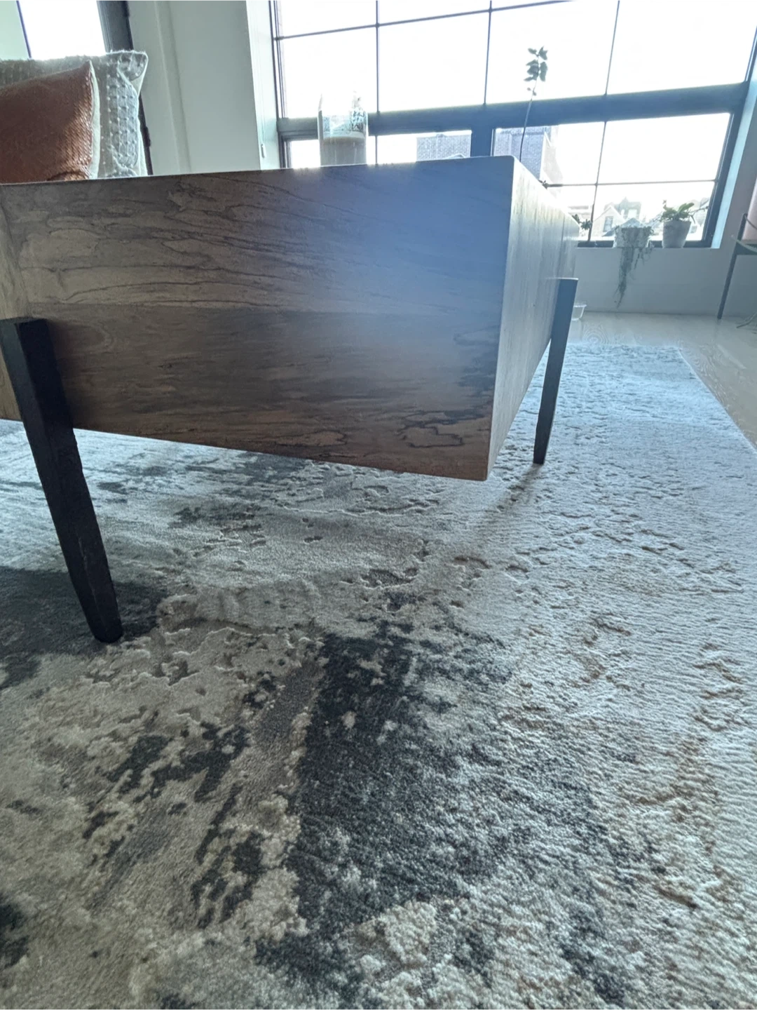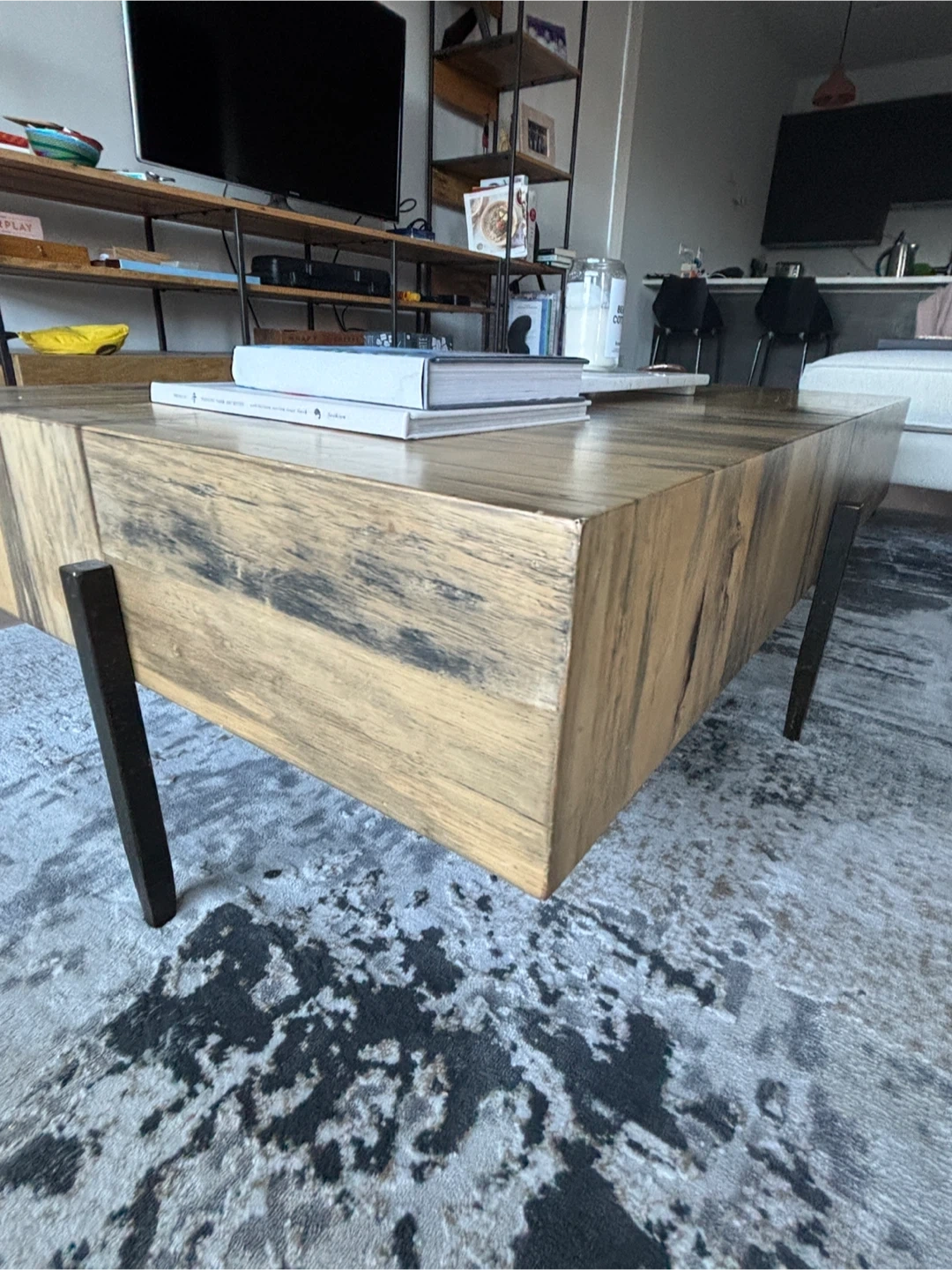 West Elm industrial style square wood coffee table with black metal legs. Shows some signs of wear and scratches on the surface as pictured, but is still sturdy and functional.