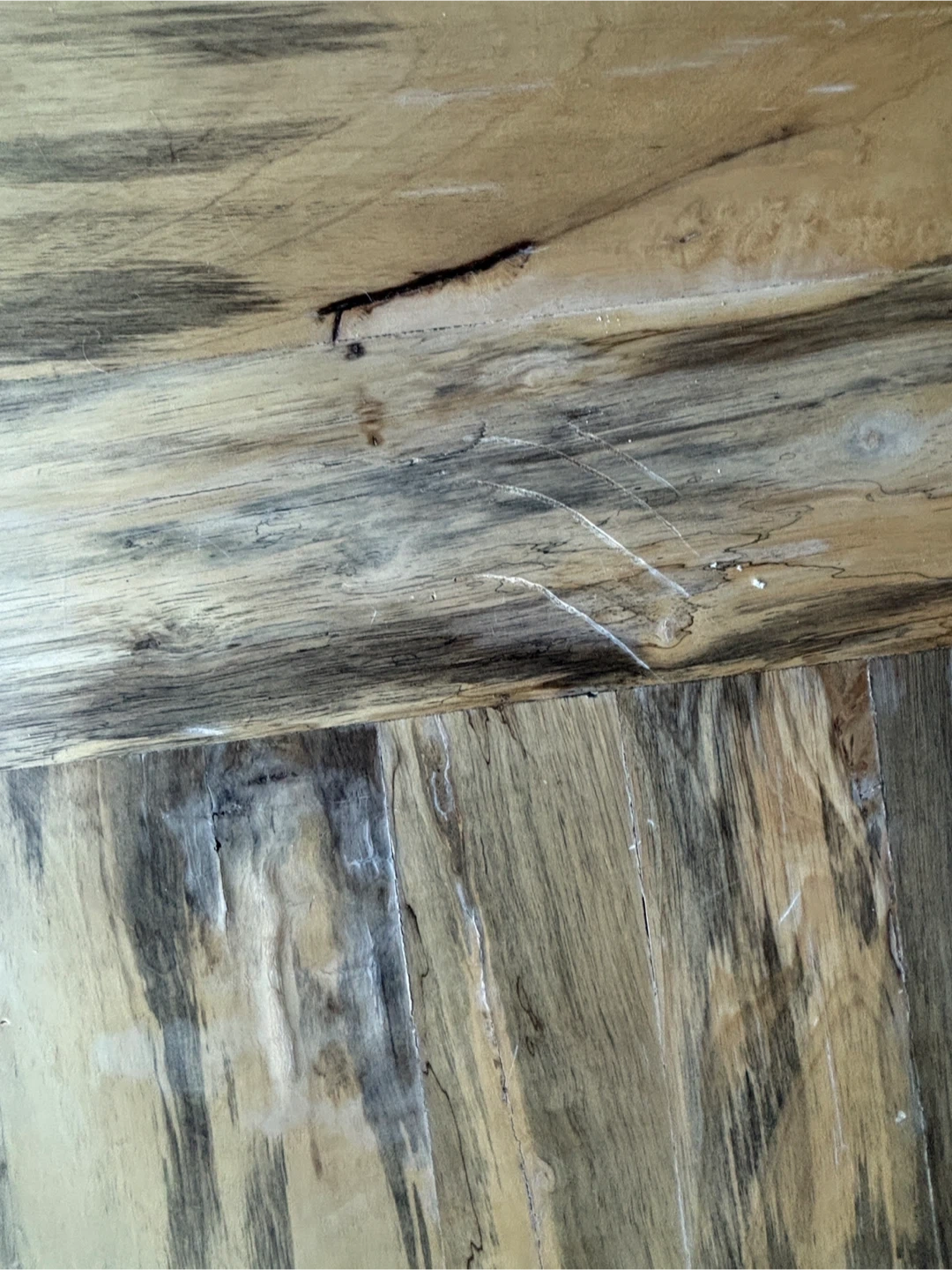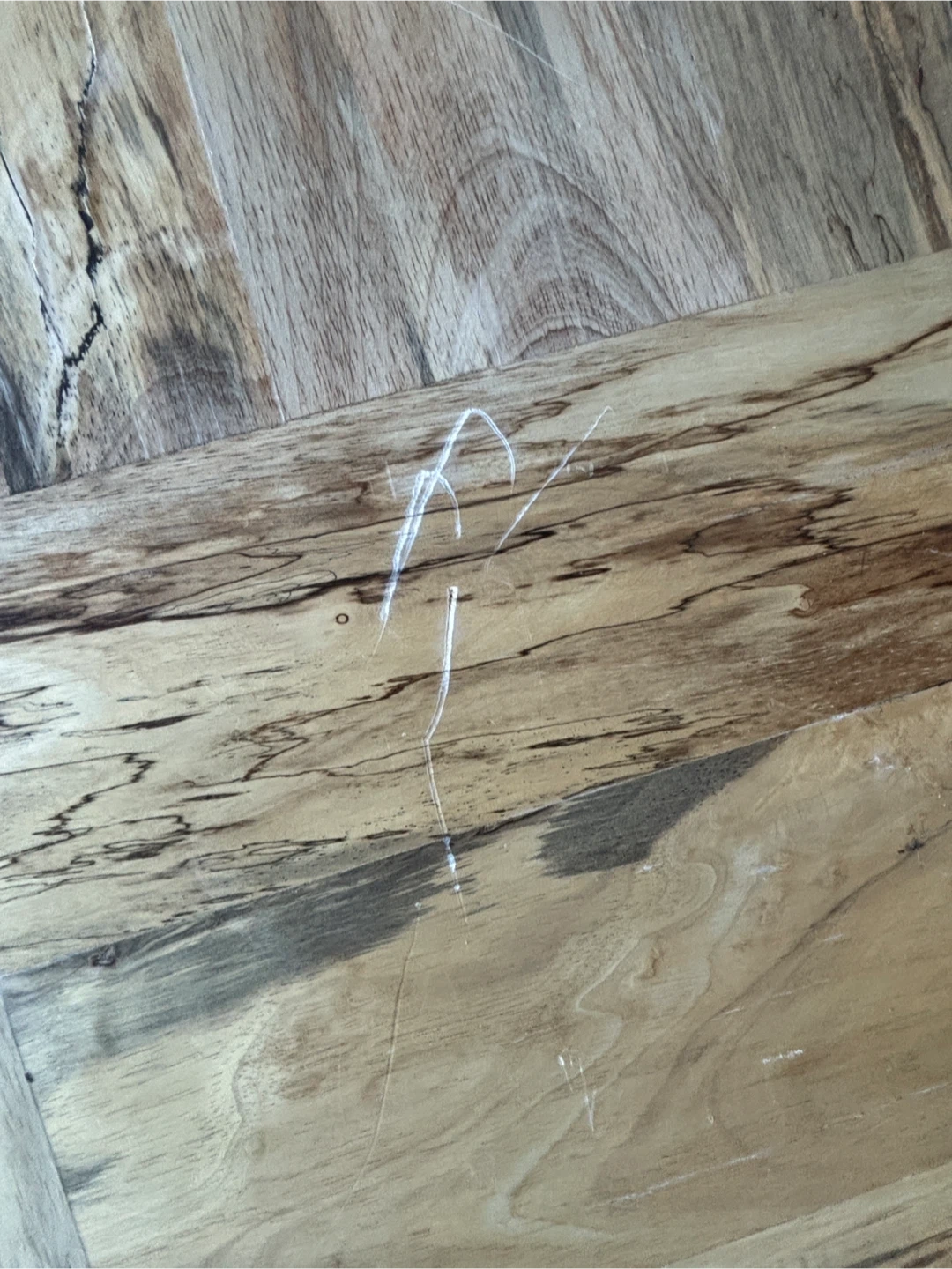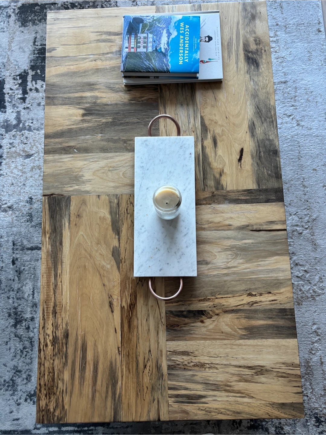 West Elm industrial style square wood coffee table with black metal legs. Shows some signs of wear and scratches on the surface as pictured, but is still sturdy and functional.