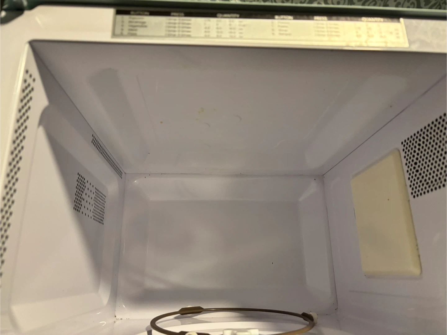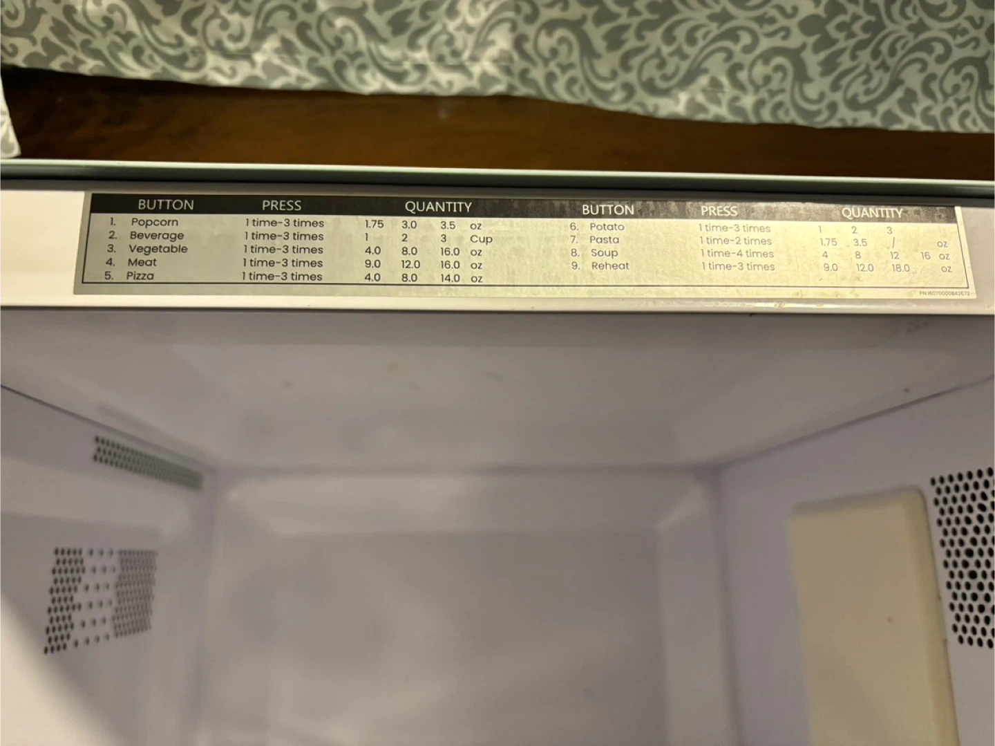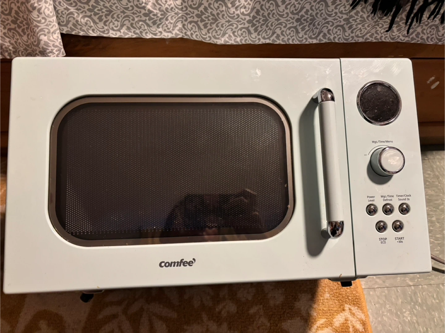 This is a light green Comfee microwave oven. It includes various preset cooking options for popcorn, beverages, vegetables, meat, pizza, potato, soup, and pasta. The microwave has a rotating turntable and multiple power levels.