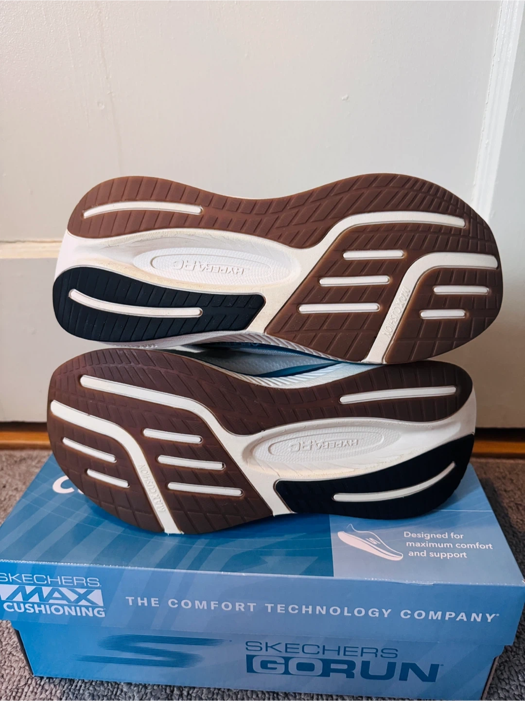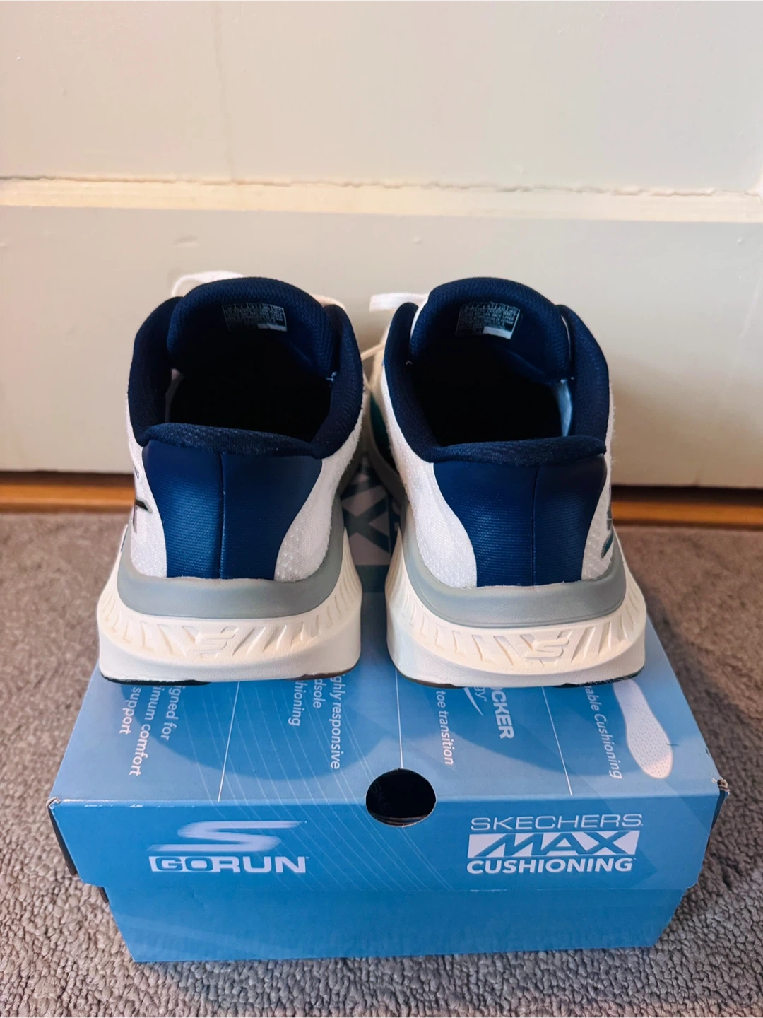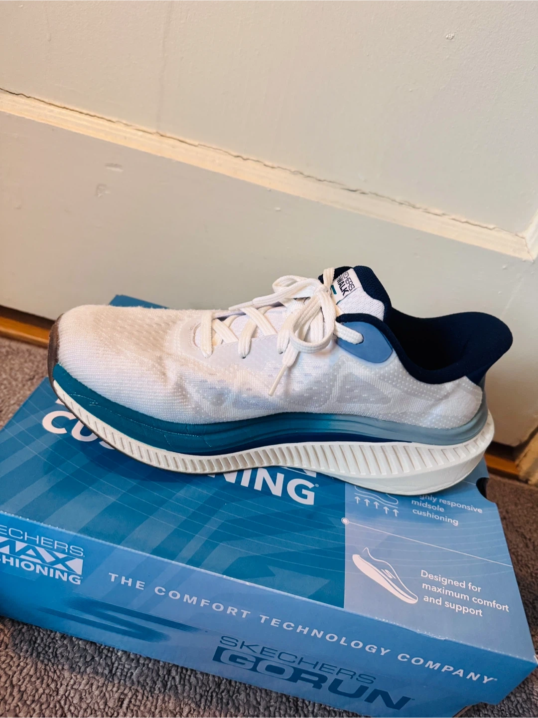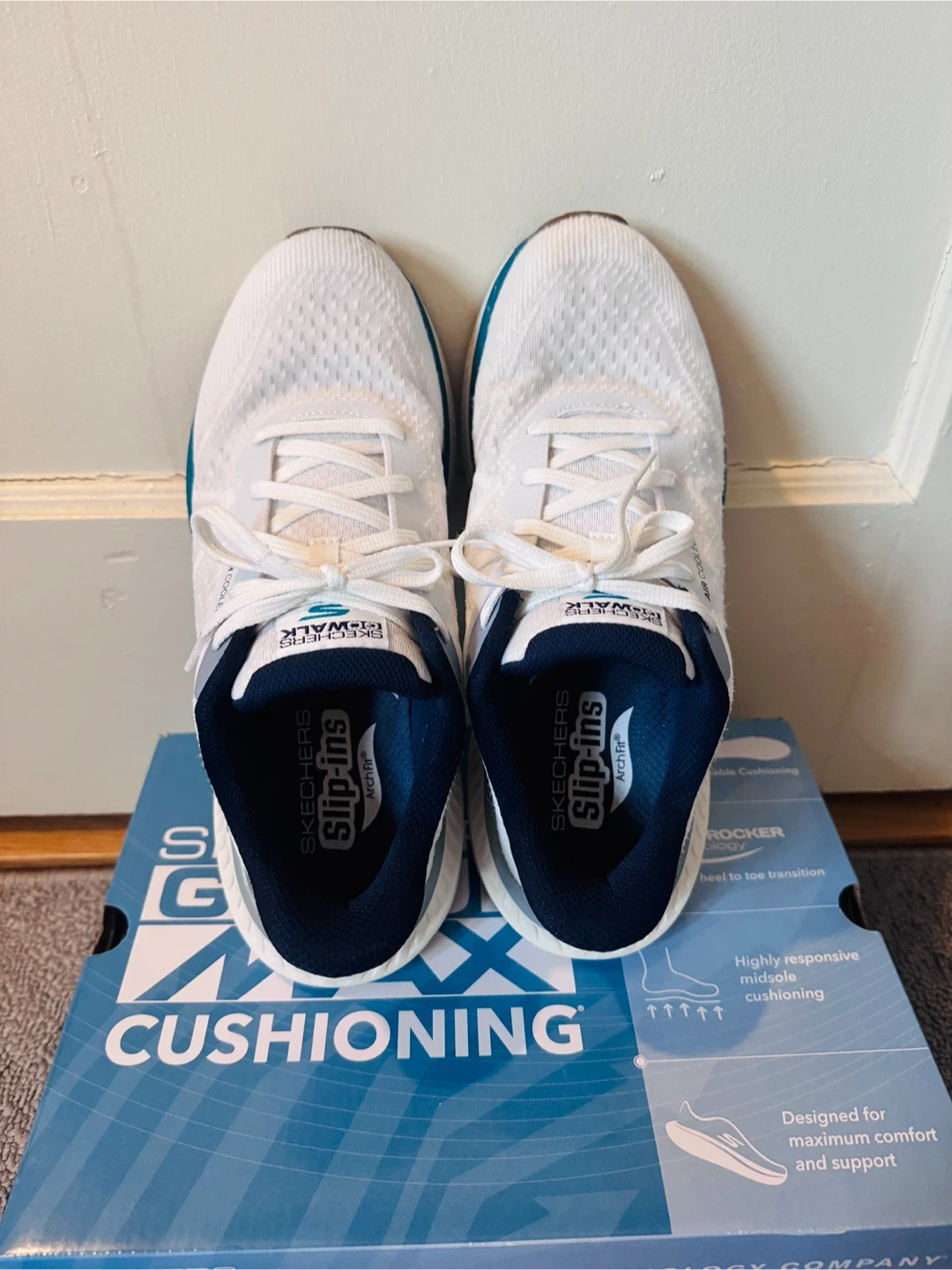 Skechers Go Walk Max Cushioning Slip-Ins Walking shoes in white and blue. Air cooled and designed for maximum comfort and support. Features highly responsive midsoles and slip-ins.