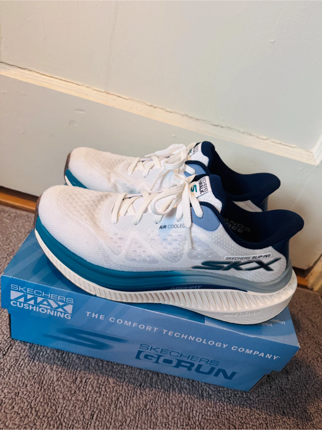 Skechers Go Walk Max Cushioning Slip-Ins Walking shoes in white and blue. Air cooled and designed for maximum comfort and support. Features highly responsive midsoles and slip-ins.