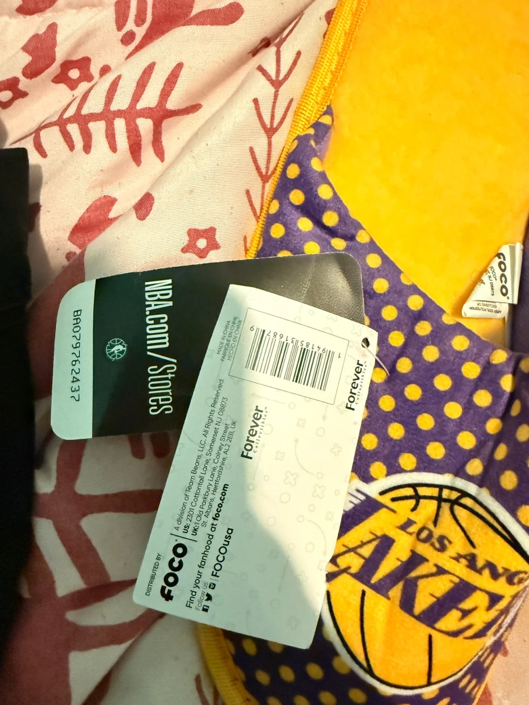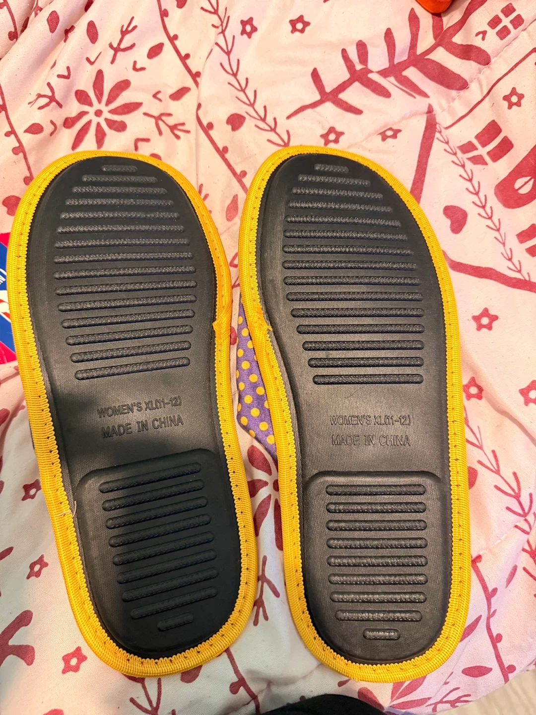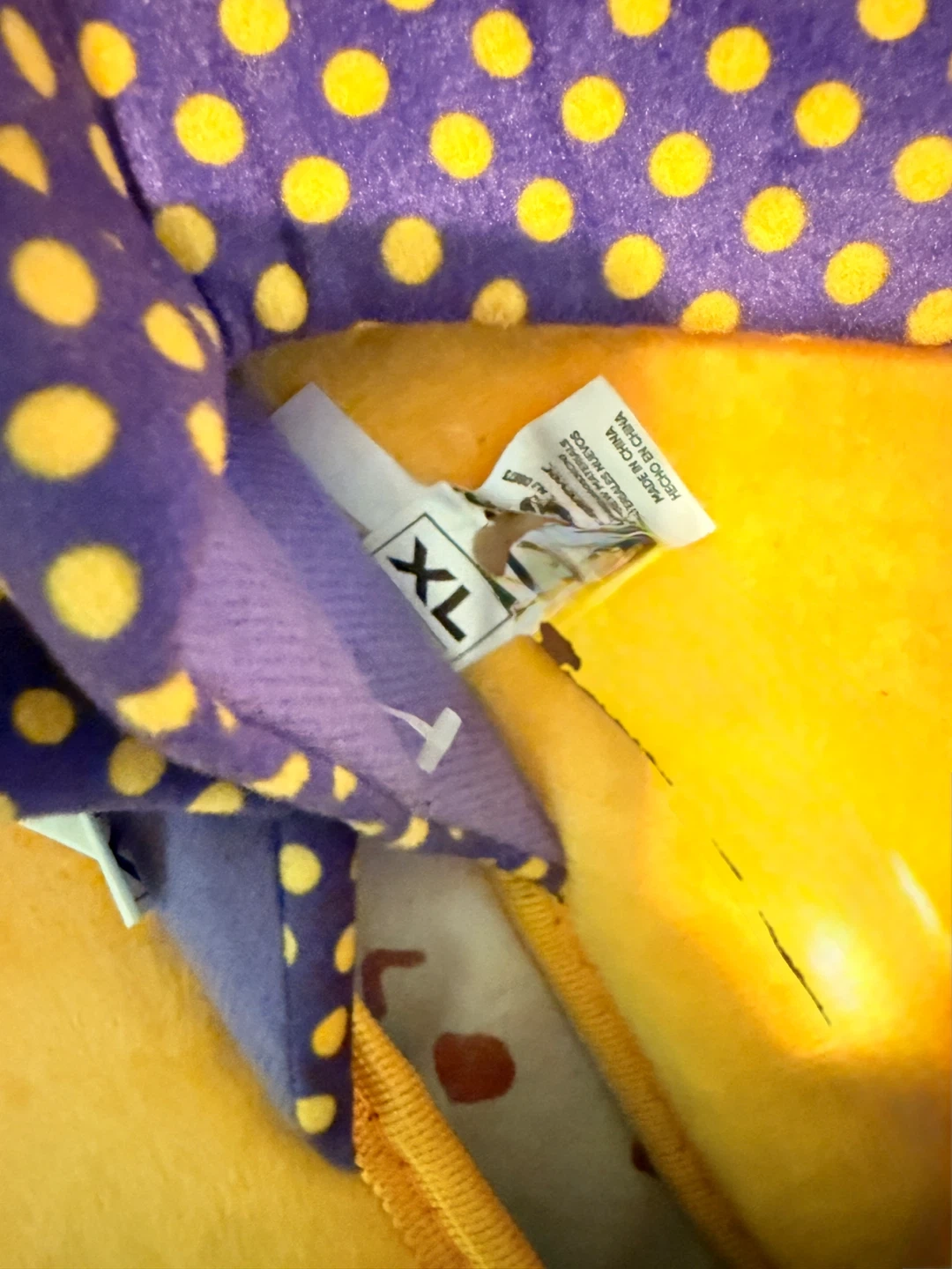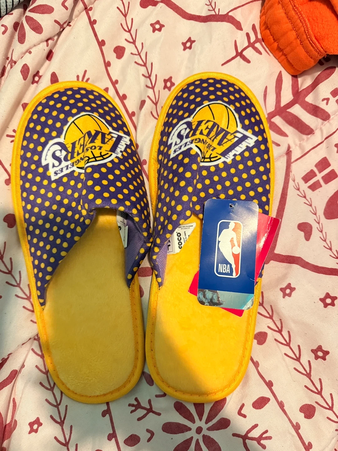 These Los Angeles Lakers slippers are purple with yellow polka dots and feature the team logo. They are made in China and are size XL. These would be great for any Lakers fan!