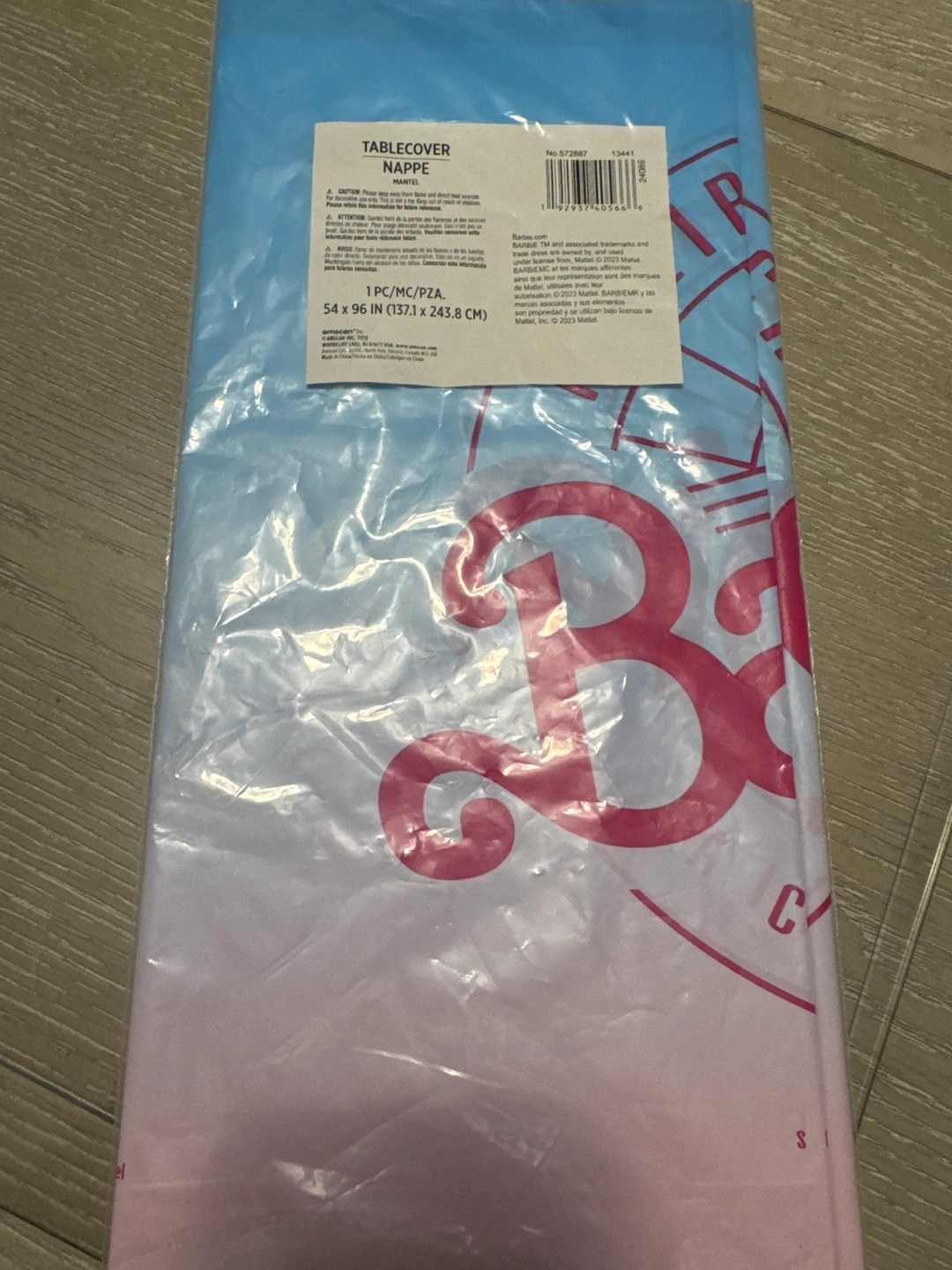I'm selling a new Barbie tablecover still in its original packaging! This tablecover measures 54 x 96 inches (137.1 x 243.8 cm). It's perfect for a Barbie themed party or just to add a fun touch to your dining area