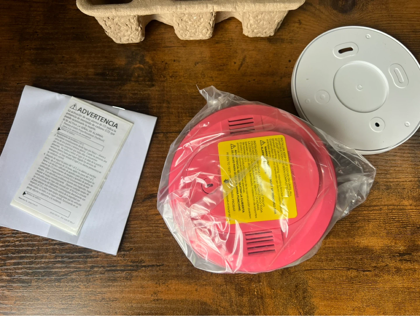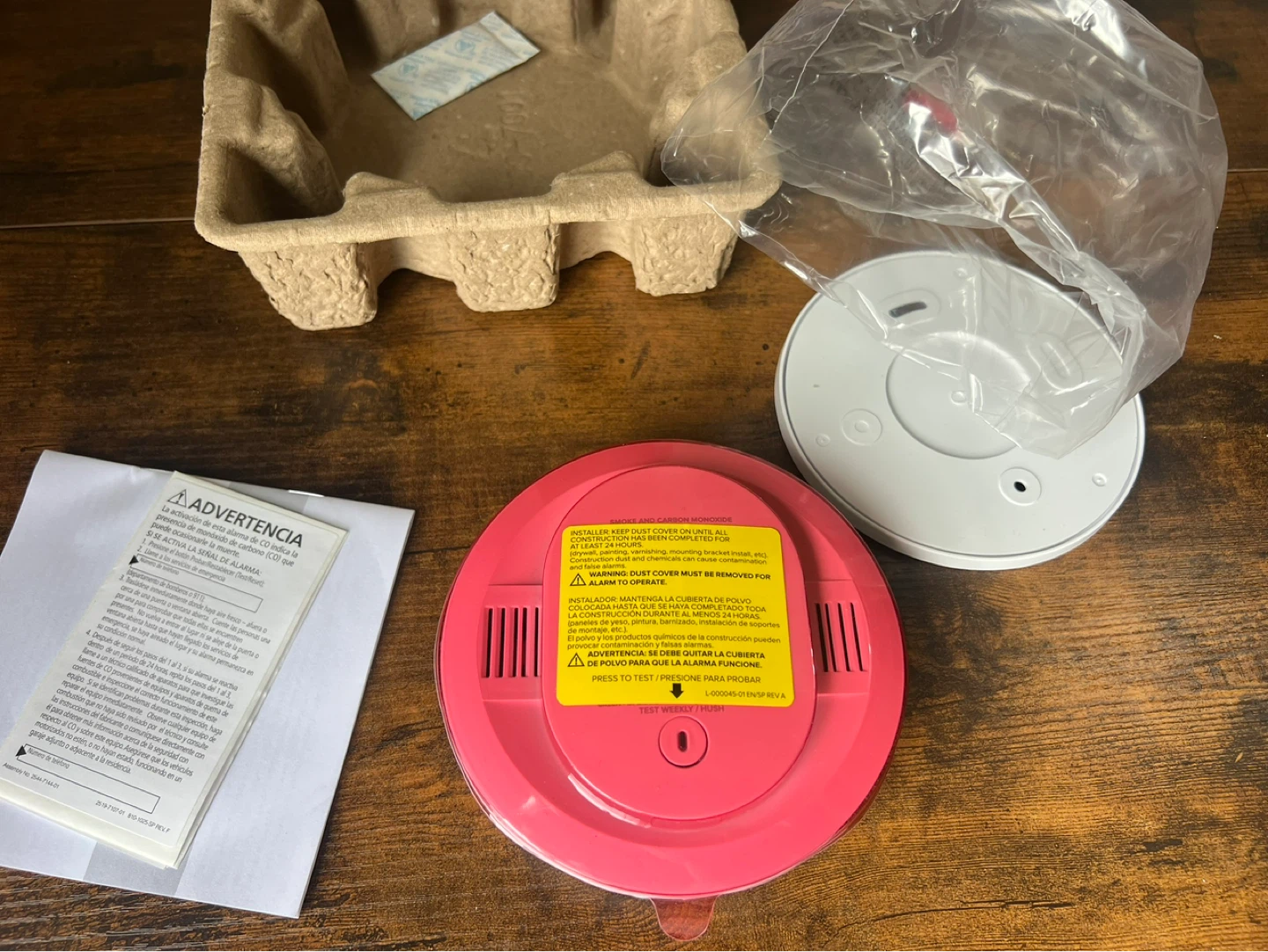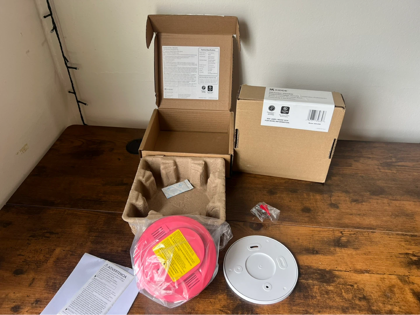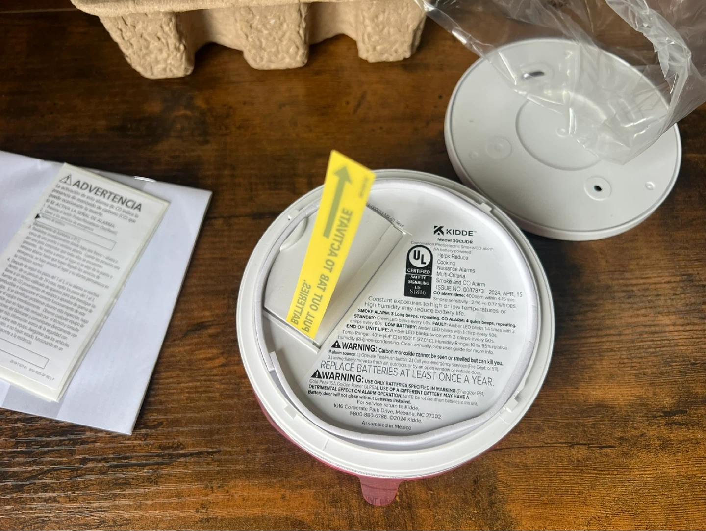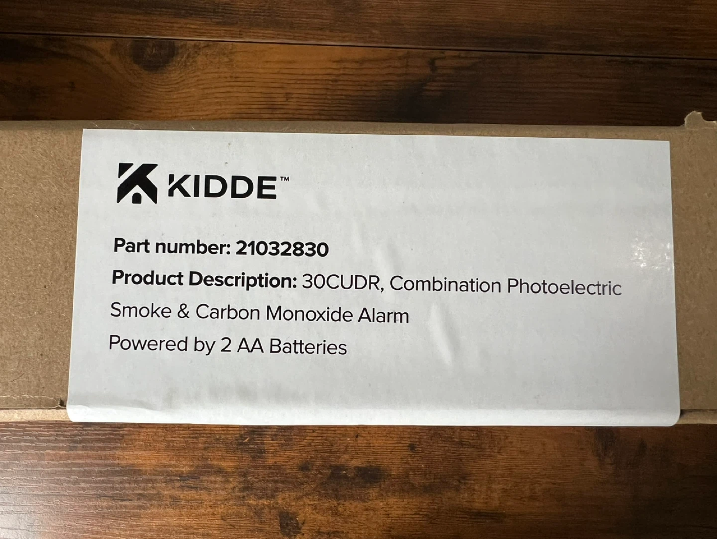 This Kidde alarm detects both smoke and carbon monoxide. It's powered by 2 AA batteries and includes the mounting bracket and screws. Comes in original packaging.