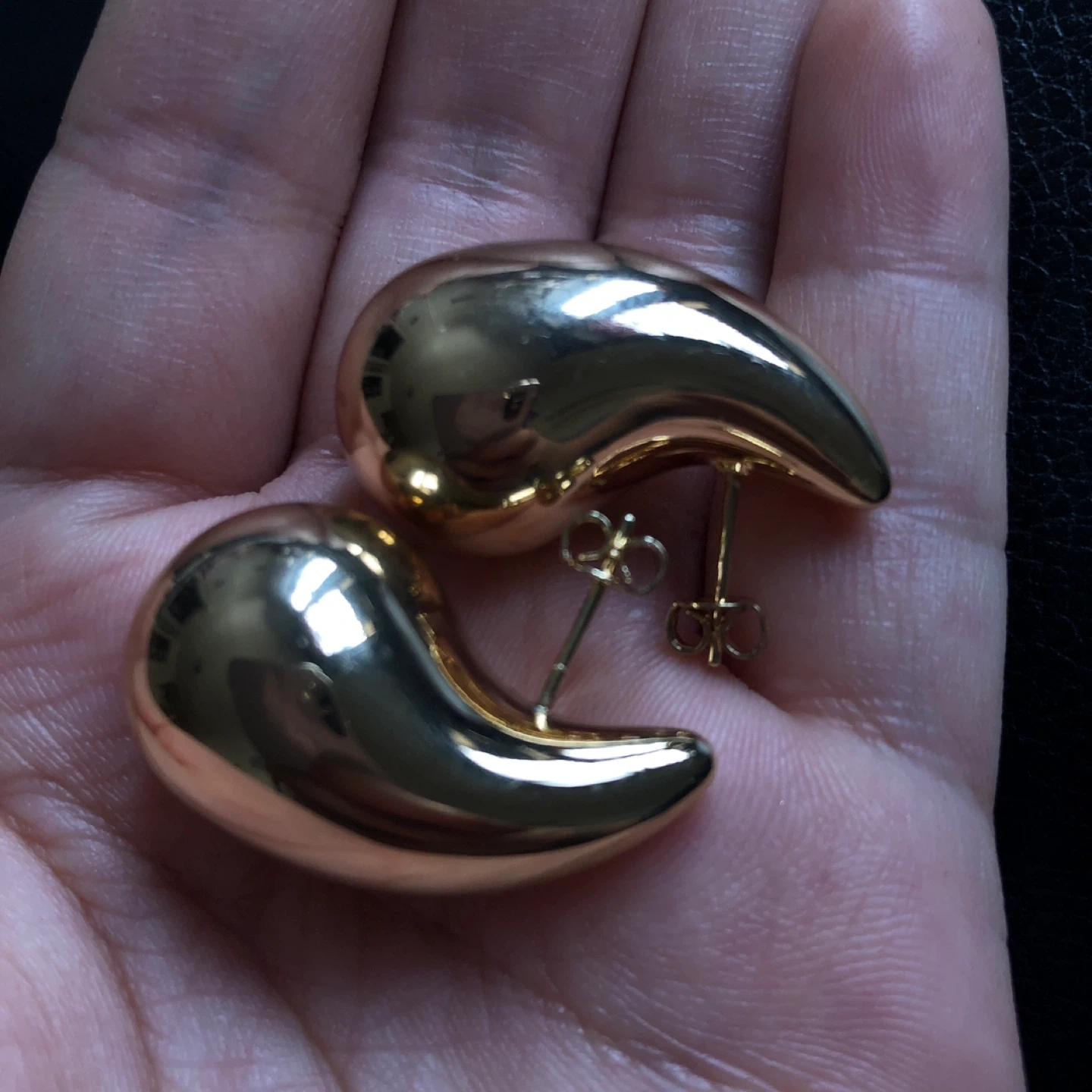 A pair of shiny gold tone teardrop stud earrings. These are a stylish accessory for everyday wear. They have a high-polish finish.