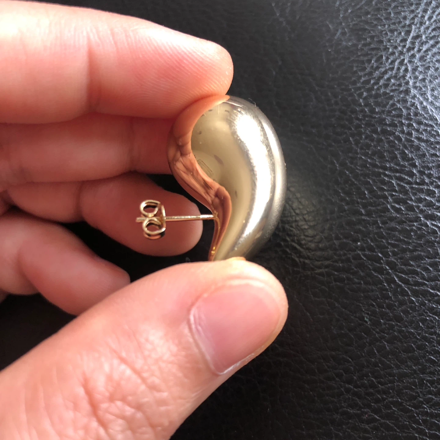 A pair of shiny gold tone teardrop stud earrings. These are a stylish accessory for everyday wear. They have a high-polish finish.