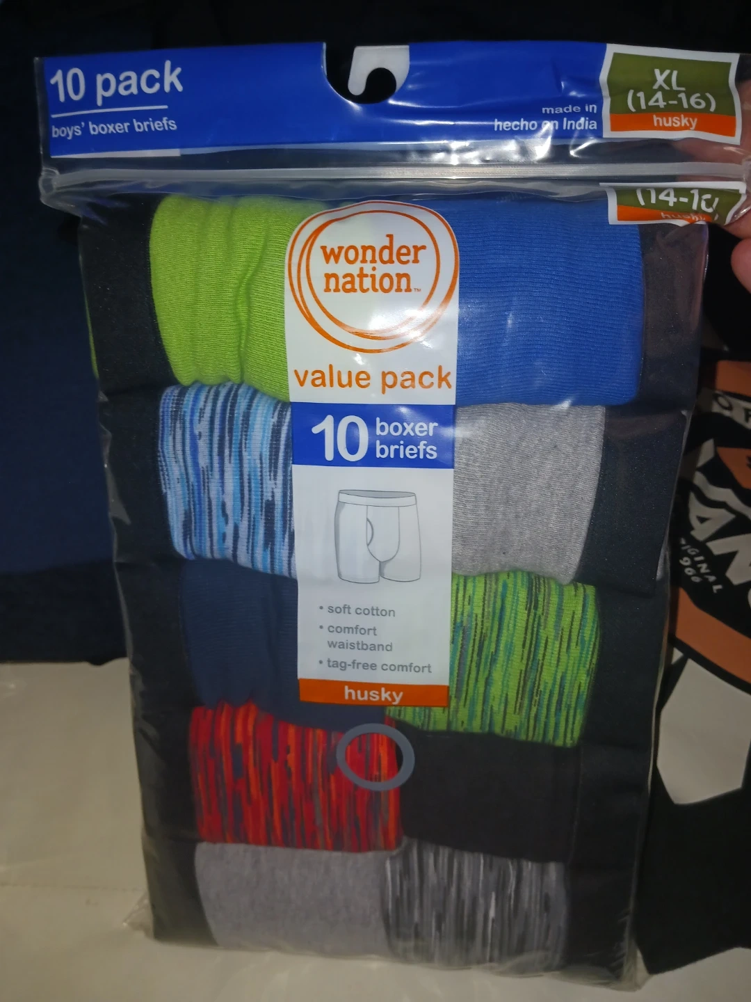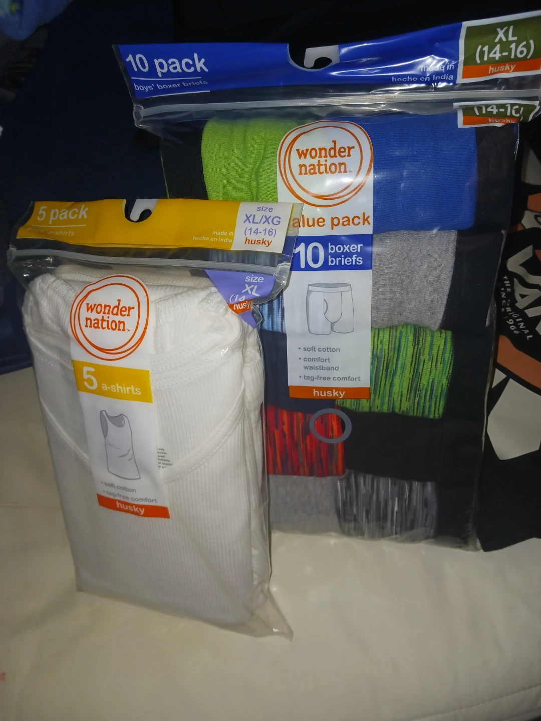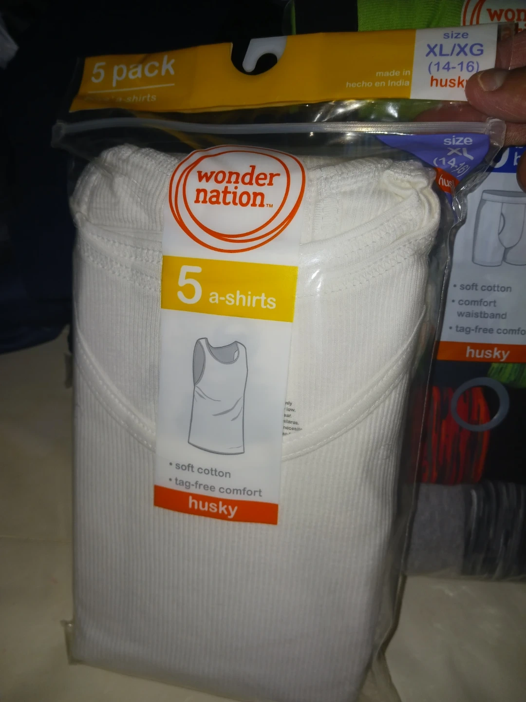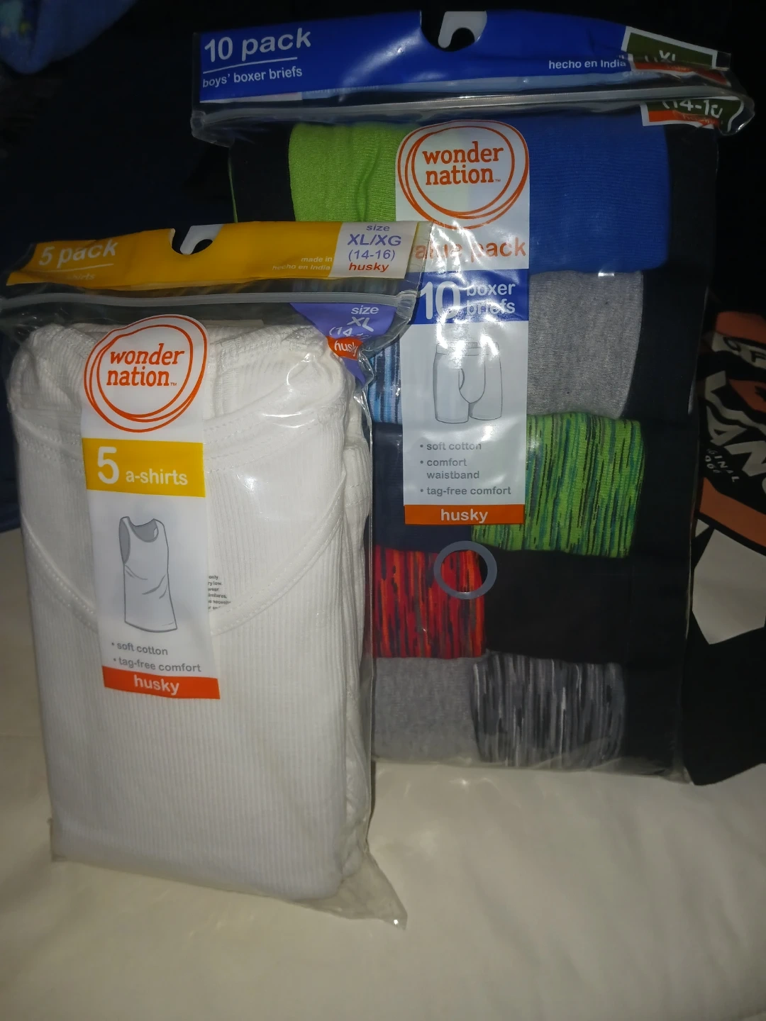 This bundle includes a 5-pack of white "a-shirts" (tank tops) and a 10-pack of boys' boxer briefs. Both are from Wonder Nation in size XL/Husky. They are made with soft cotton for comfort. The boxer briefs feature a tag-free design. These are great for everyday wear!