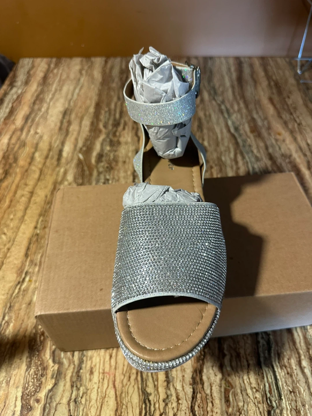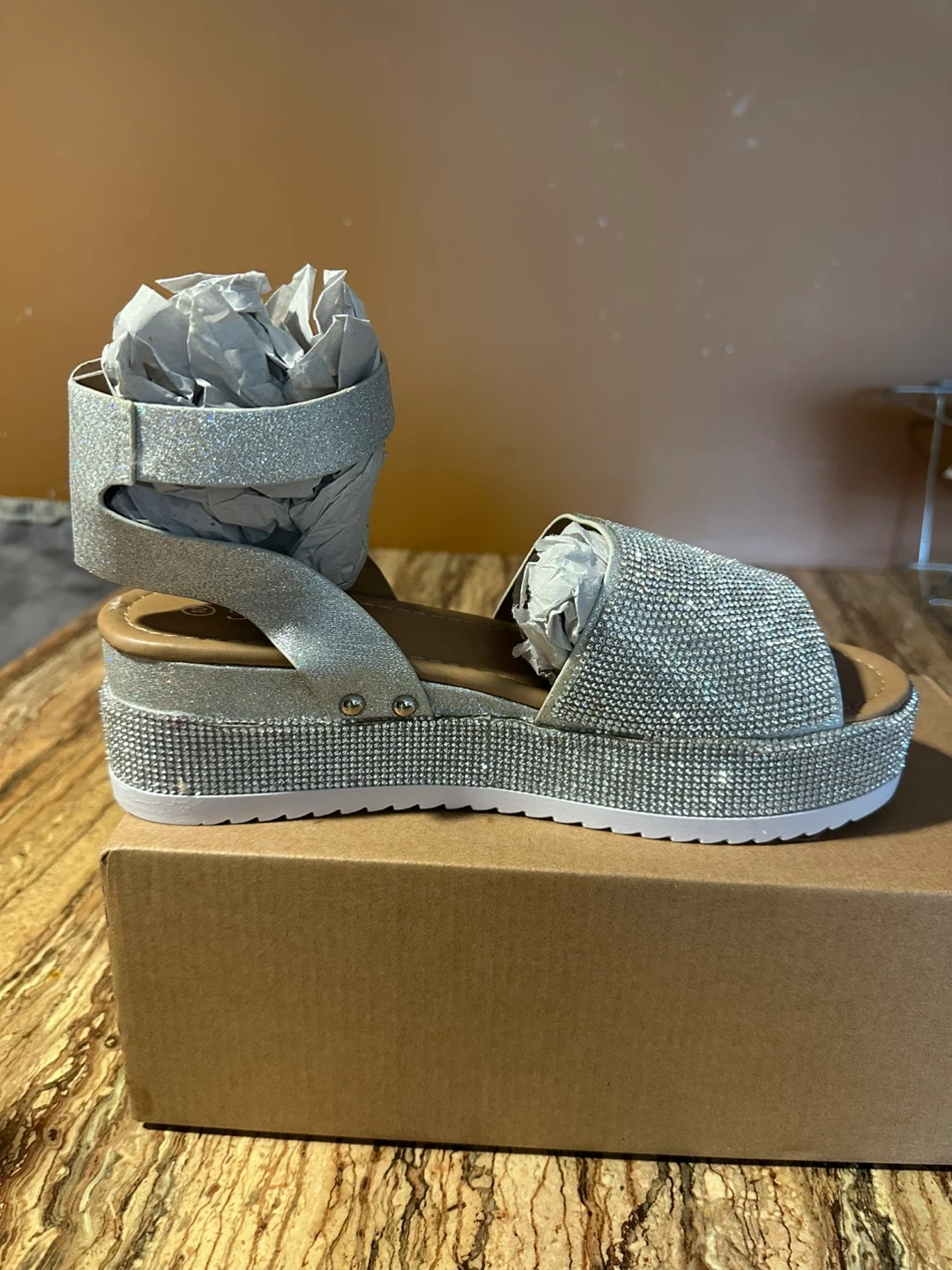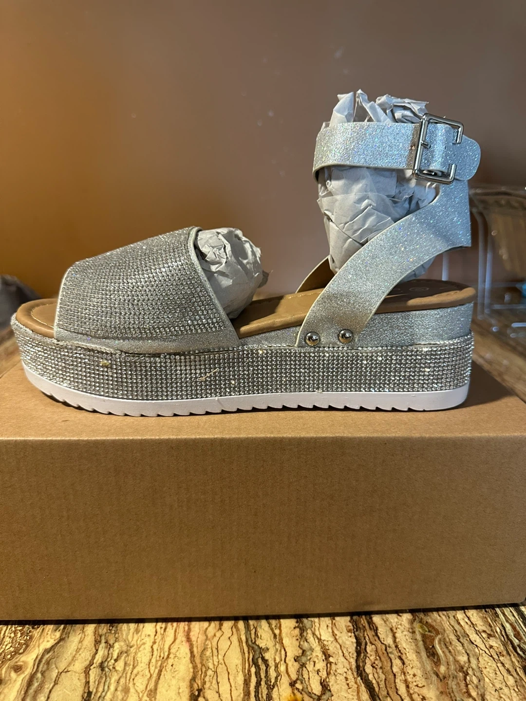 These stylish platform sandals feature a dazzling silver rhinestone embellishment. They have an adjustable ankle strap for a secure fit. The platform sole offers added height and comfort. Size 10.