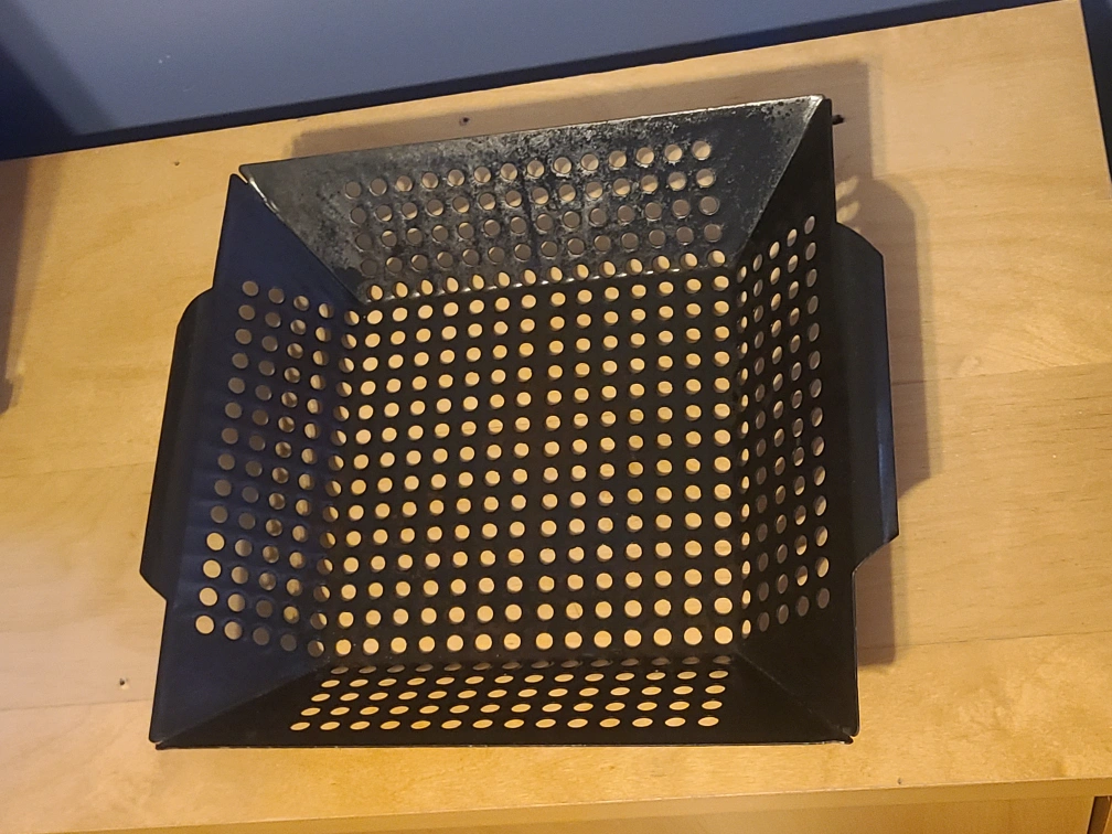 This perforated grill basket is perfect for grilling vegetables, shrimp, and other small items. Its durable metal construction allows for even heat distribution and prevents food from falling through the grates. It's easy to clean and use! 12" x 12"