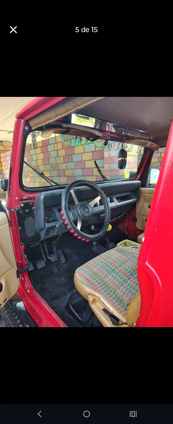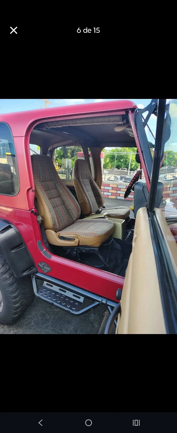This is a lifted, red Jeep Wrangler "Rio Grande" edition 4x4. It features rugged off-road tires and a custom front bumper. The interior has two-tone patterned seats and a standard shifter. A light bar is mounted on the roof.