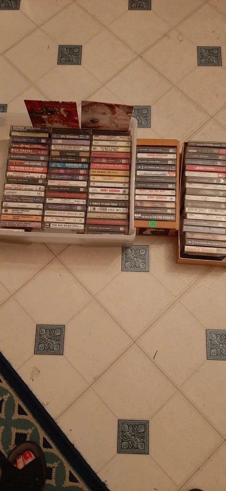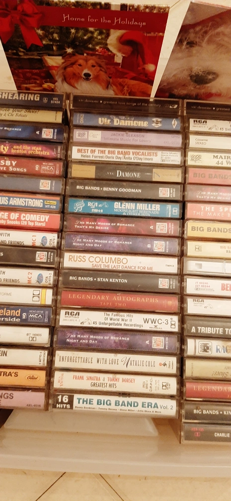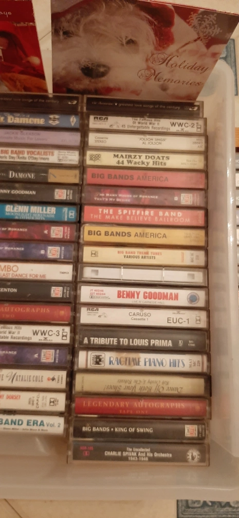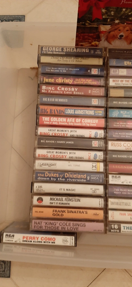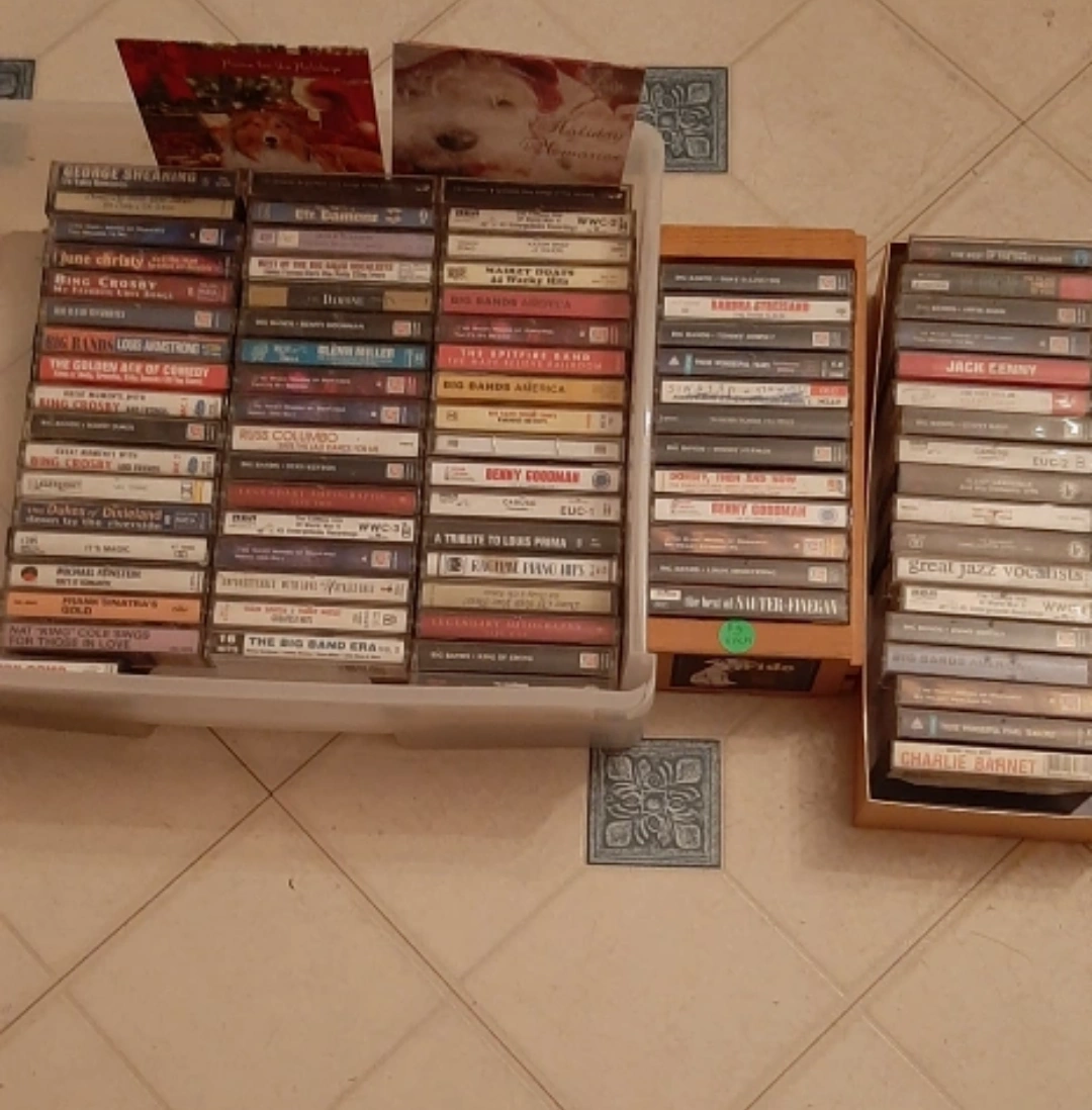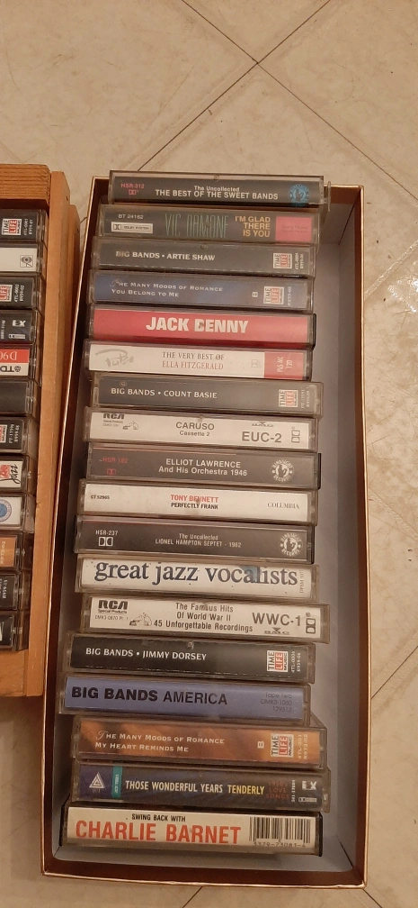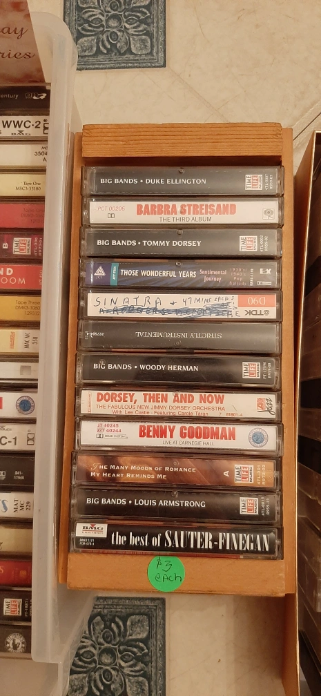 Vintage cassette tapes! There's a variety of genres, including Big Band, Jazz, and classic Crooners. Artists include Frank Sinatra, Bing Crosby, Glenn Miller, Louis Armstrong, and many more. Perfect for collectors or anyone looking to enjoy some classic tunes!
