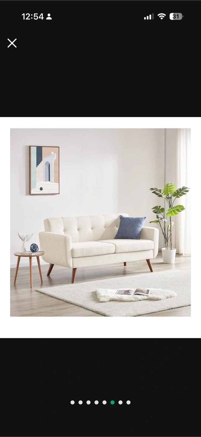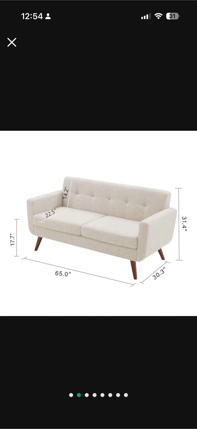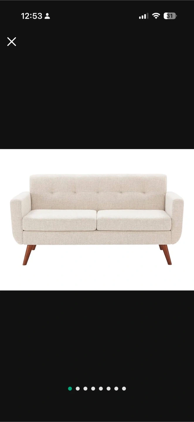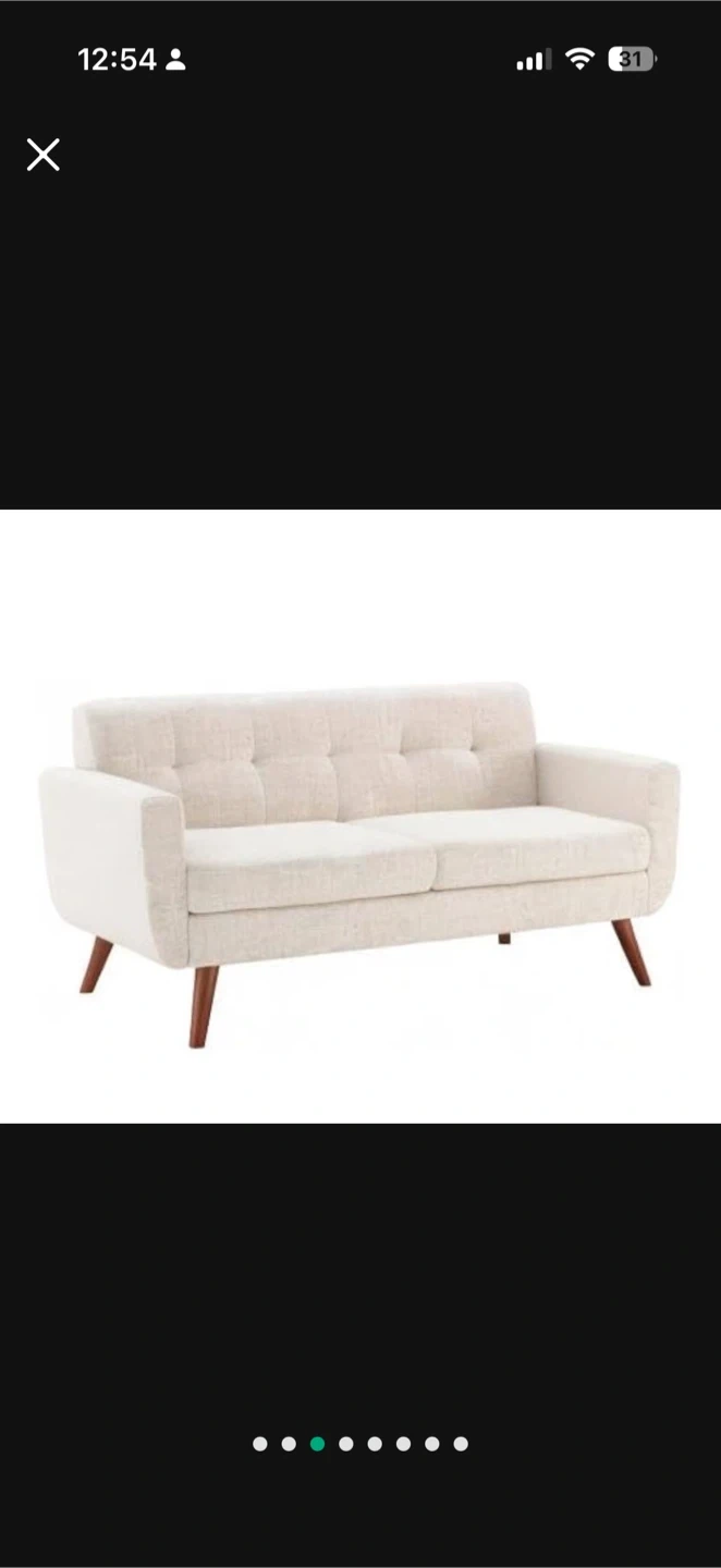 This cream upholstered loveseat features a tufted backrest and comfortable cushions. It has solid wood legs and a sturdy wooden frame. This piece adds a touch of mid-century modern style to any living space.