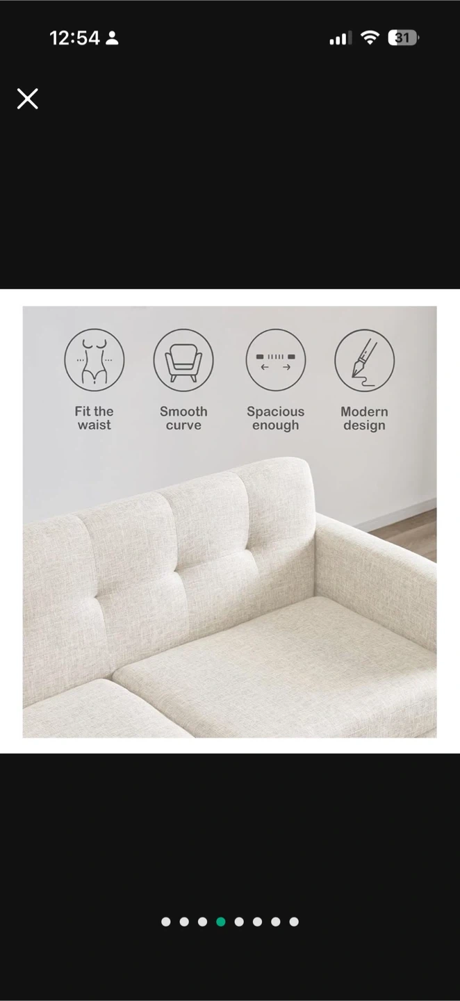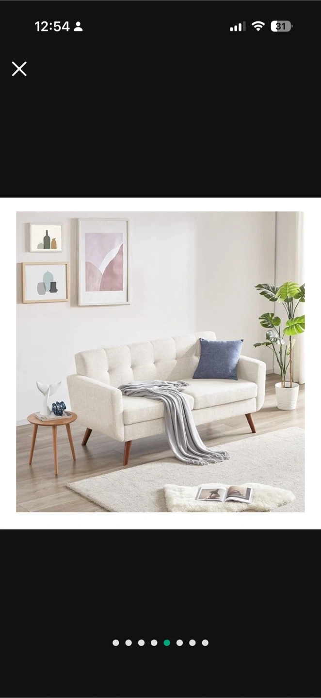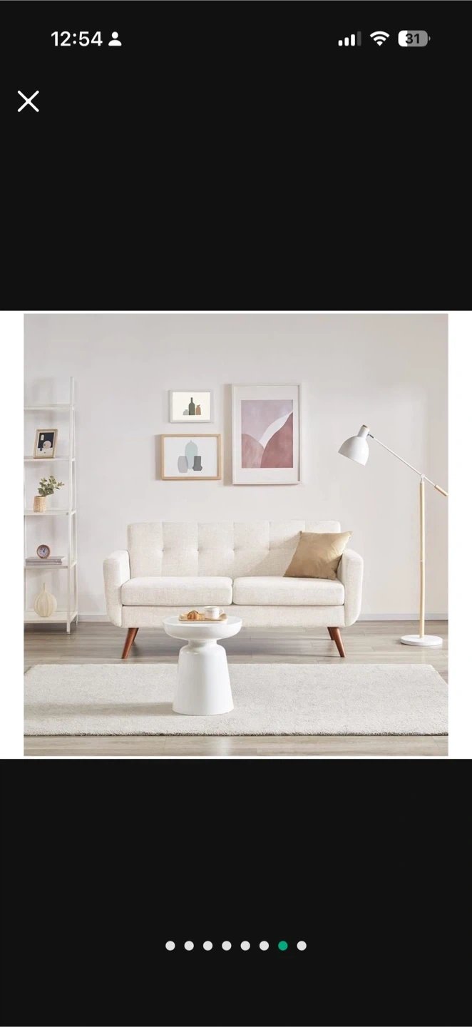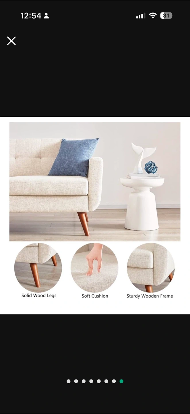 This cream upholstered loveseat features a tufted backrest and comfortable cushions. It has solid wood legs and a sturdy wooden frame. This piece adds a touch of mid-century modern style to any living space.
