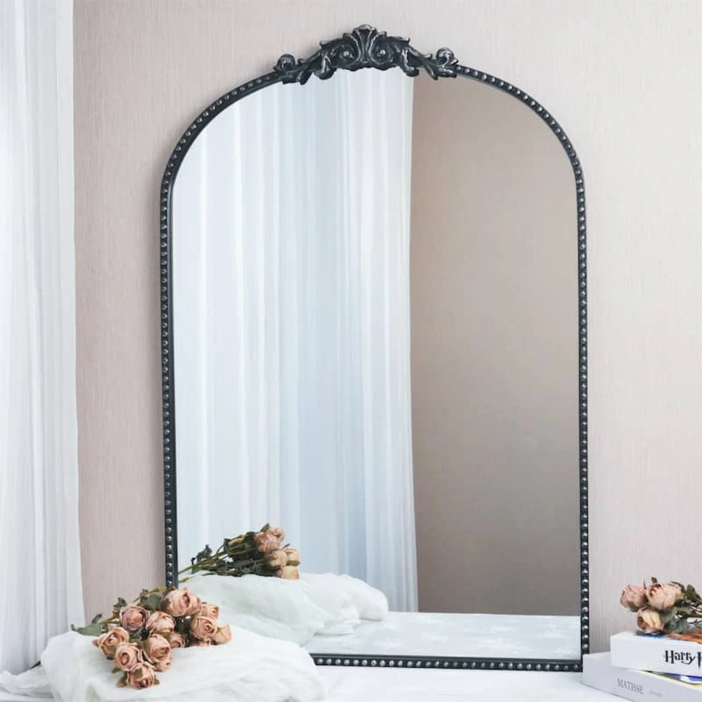 This mirror features a beautiful arch shape with an ornate, dark-colored frame. Its decorative beaded edge adds a touch of elegance. It's perfect for adding a stylish accent to any room!
