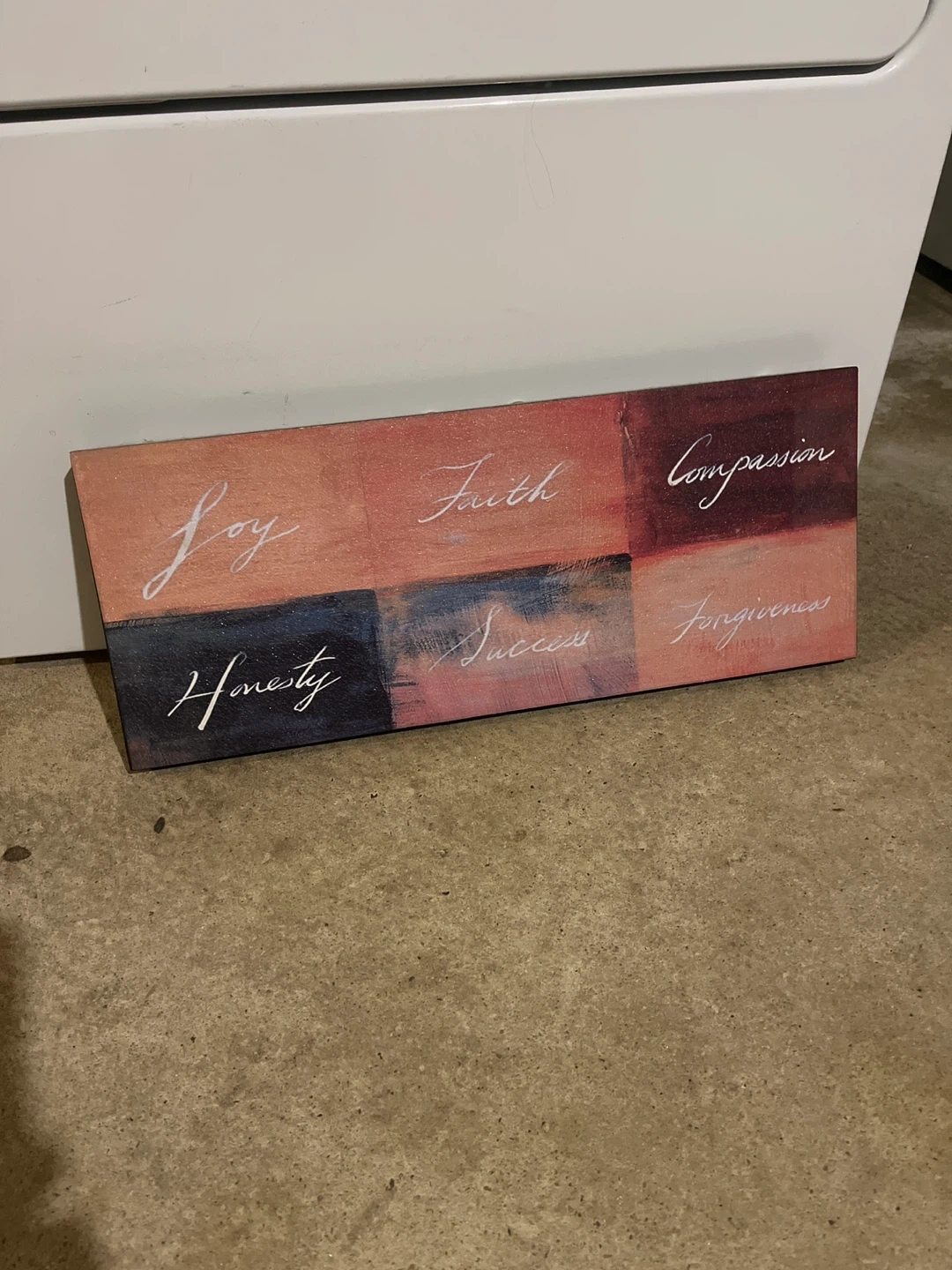 This canvas art piece features inspirational words like Joy, Faith, Compassion, Honesty, Success, and Forgiveness. It's a nice addition to home decor. The canvas is rectangular and designed with color blocks.