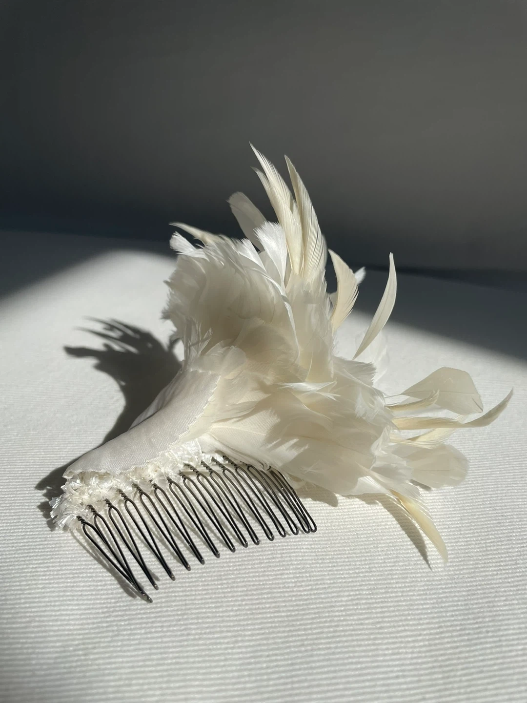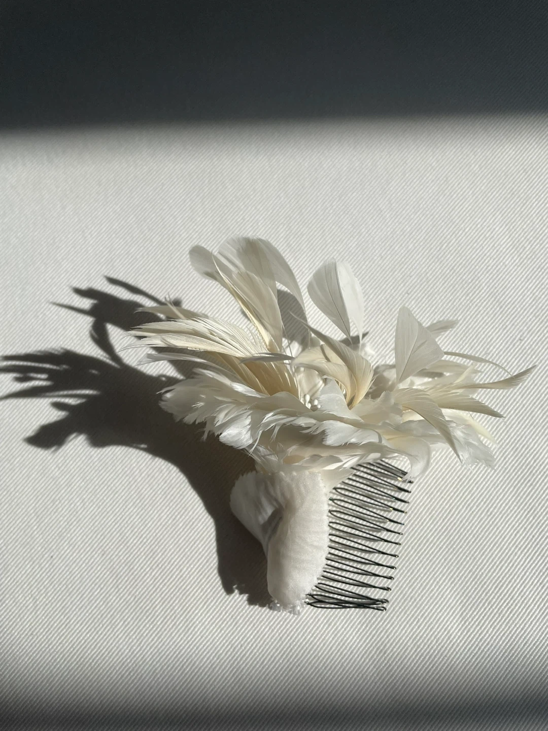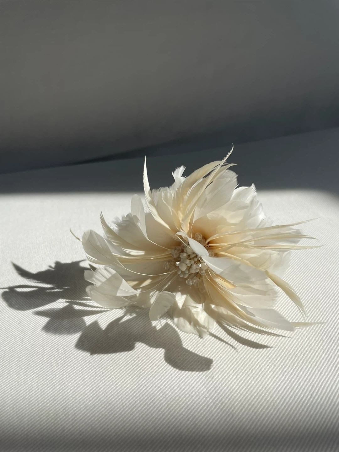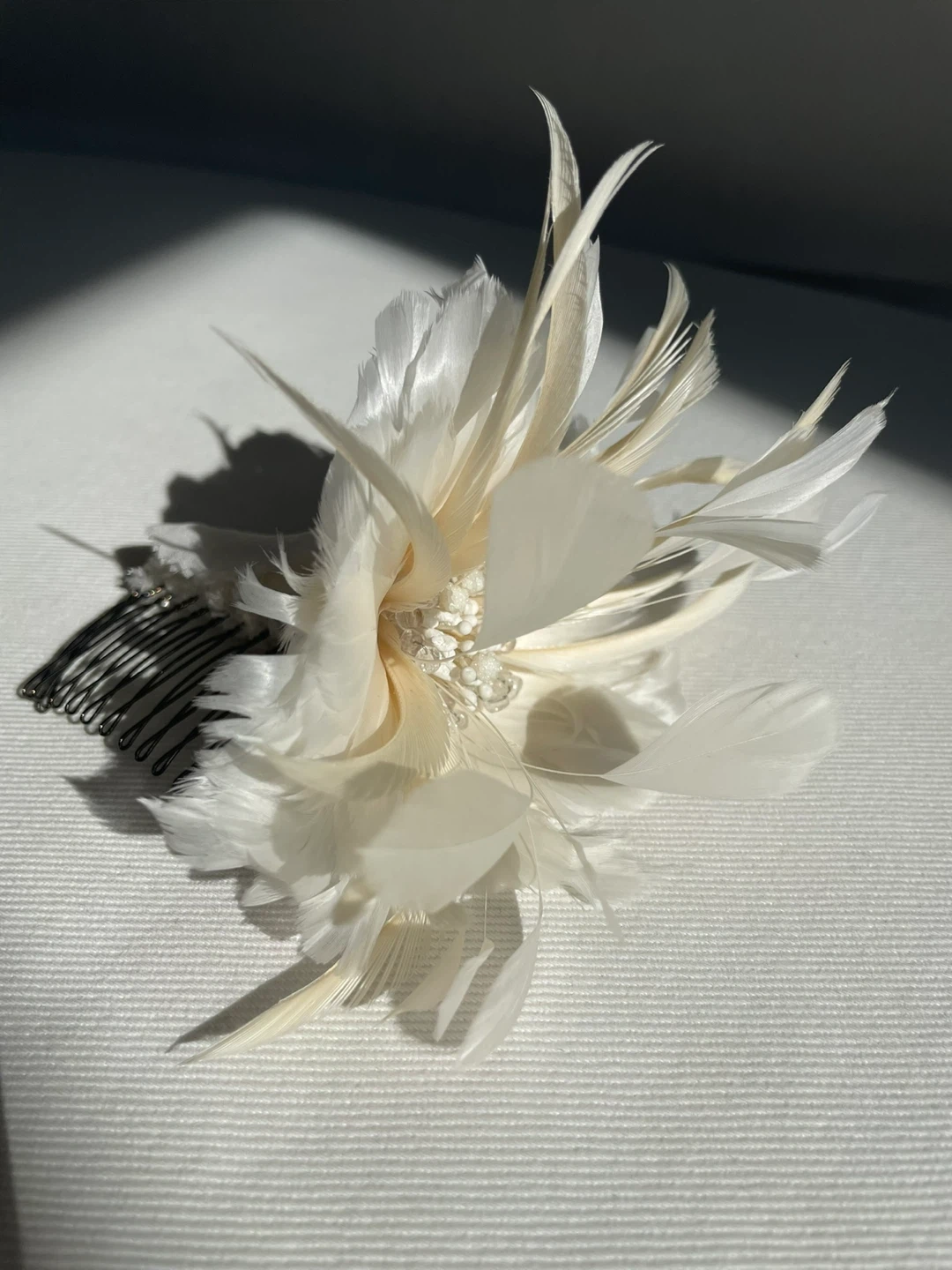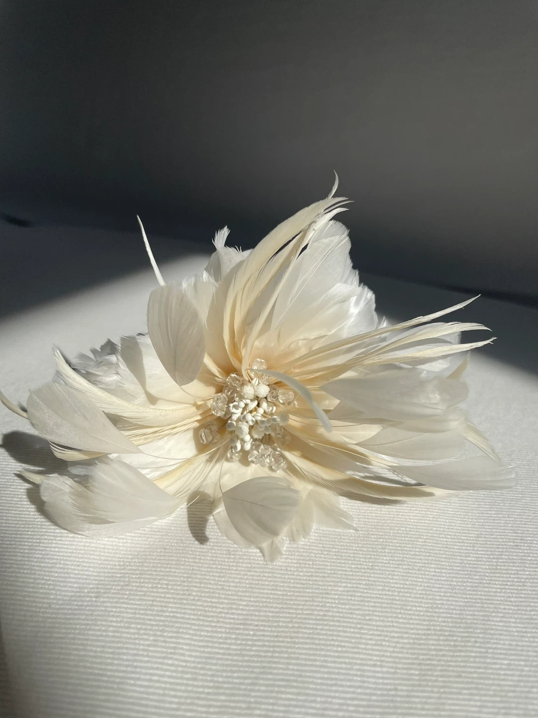 Handmade feather flower hair clip in soft ivory tones. Delicate layered petals with beaded center. Elegant accessory for weddings and special occasions.