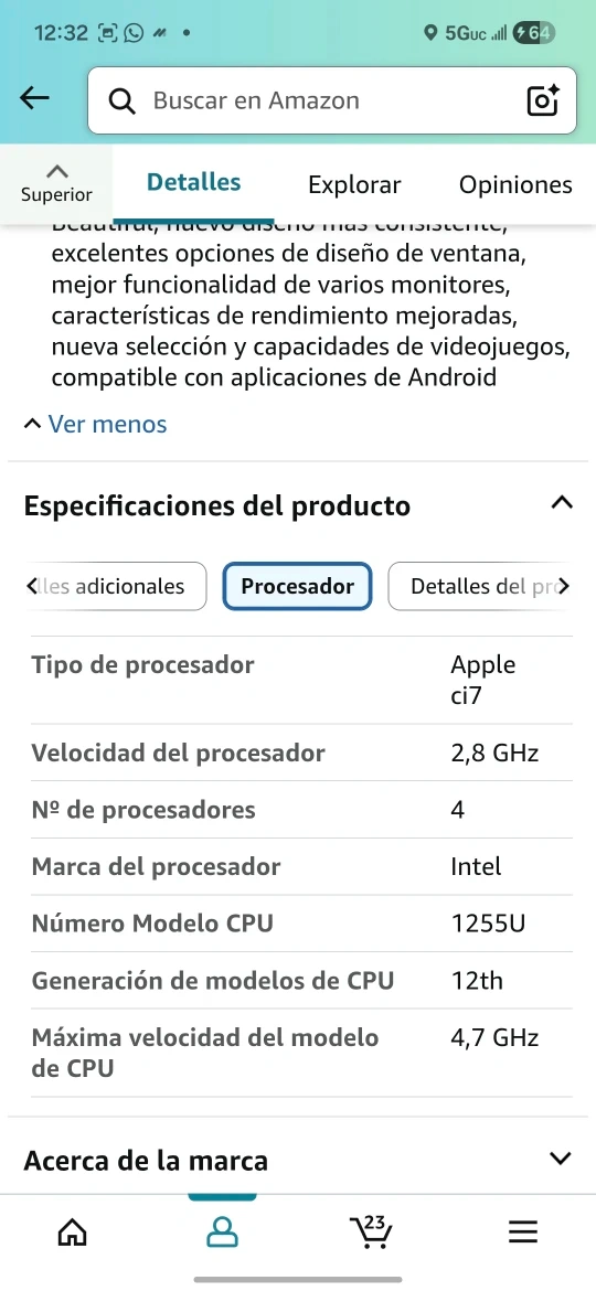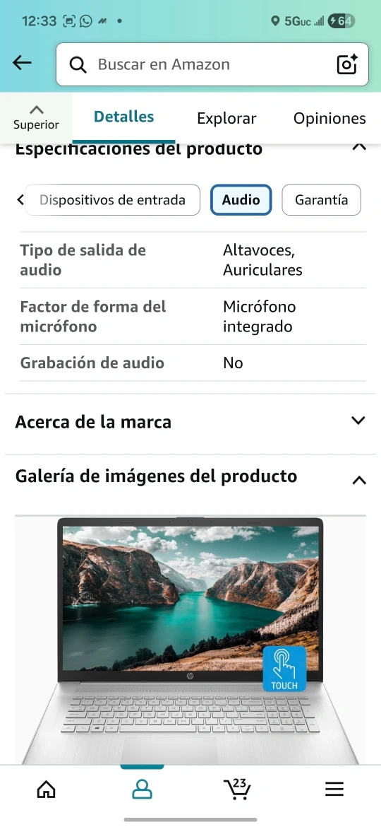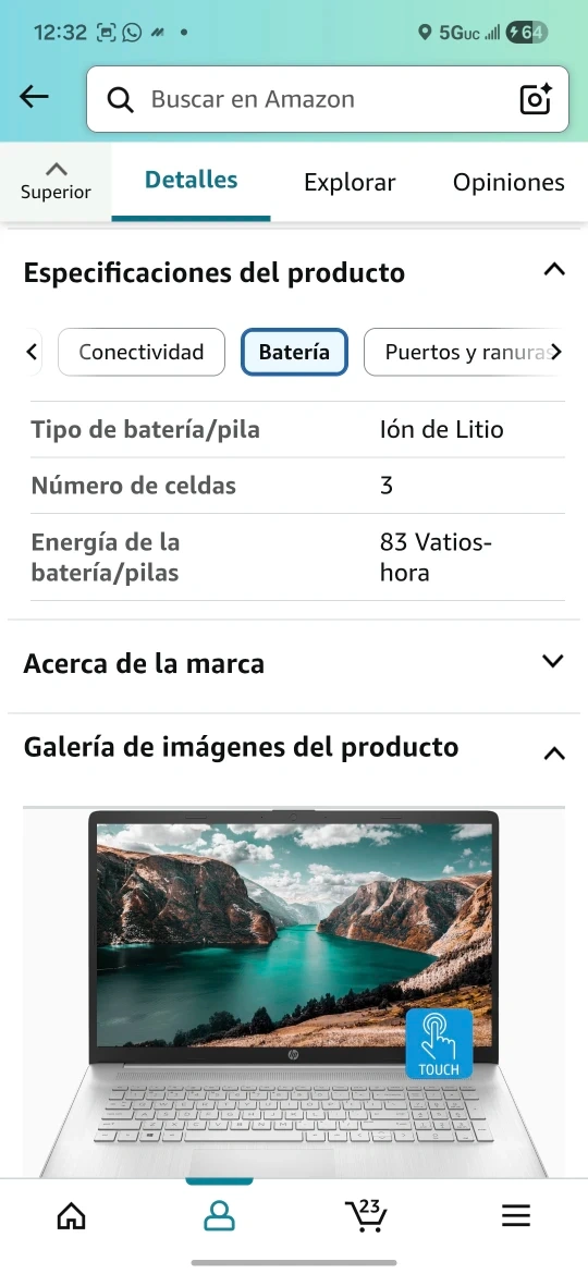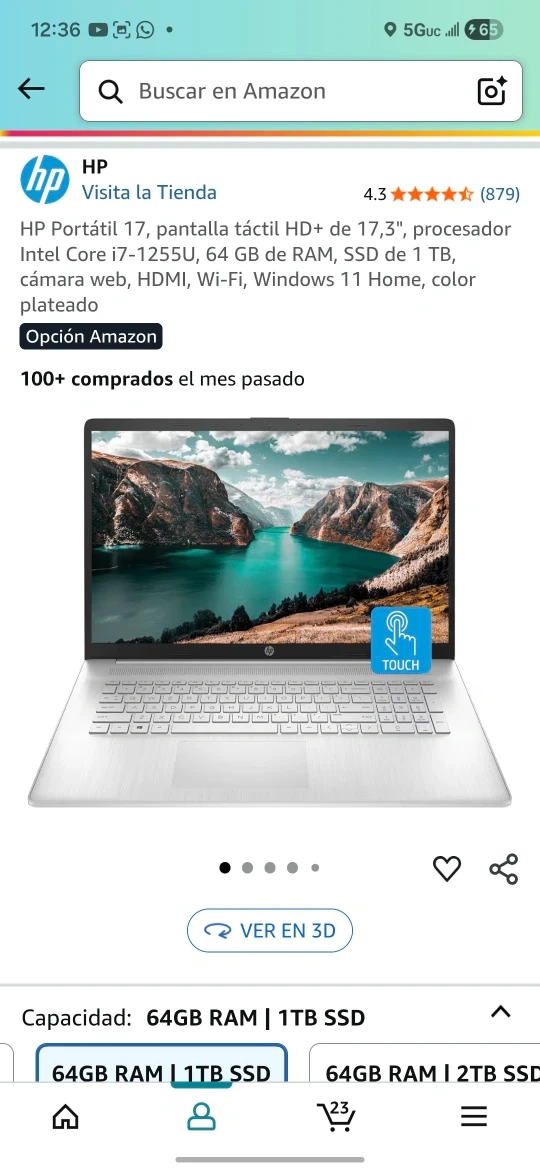 Selling an HP Portátil 17 laptop. It features a 17.3" HD+ touch screen, Intel Core i7-1255U processor, 64 GB of RAM, and a 1 TB SSD. It also has a webcam, HDMI, Wi-Fi, and Windows 11 Home. The laptop comes in a sleek silver color.