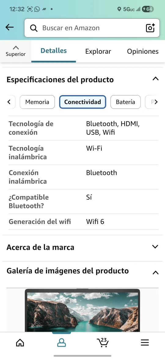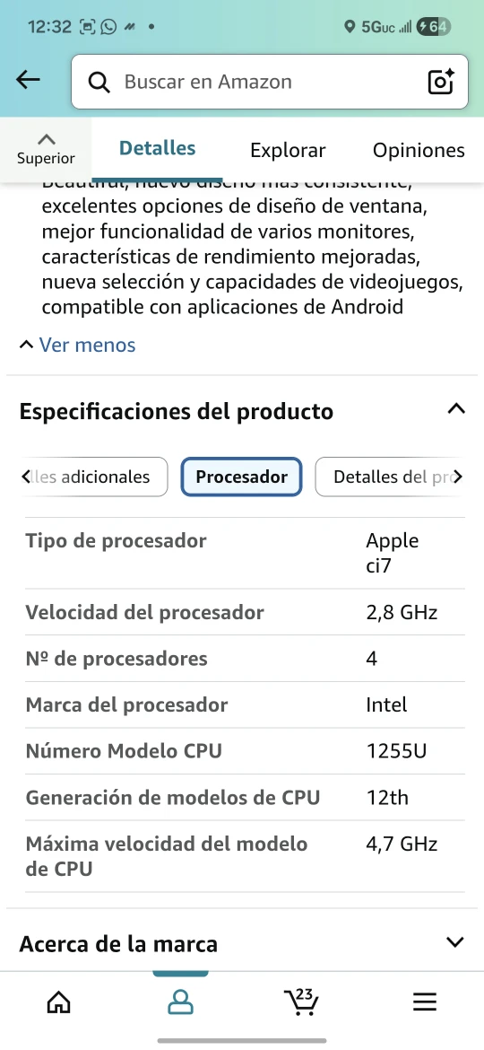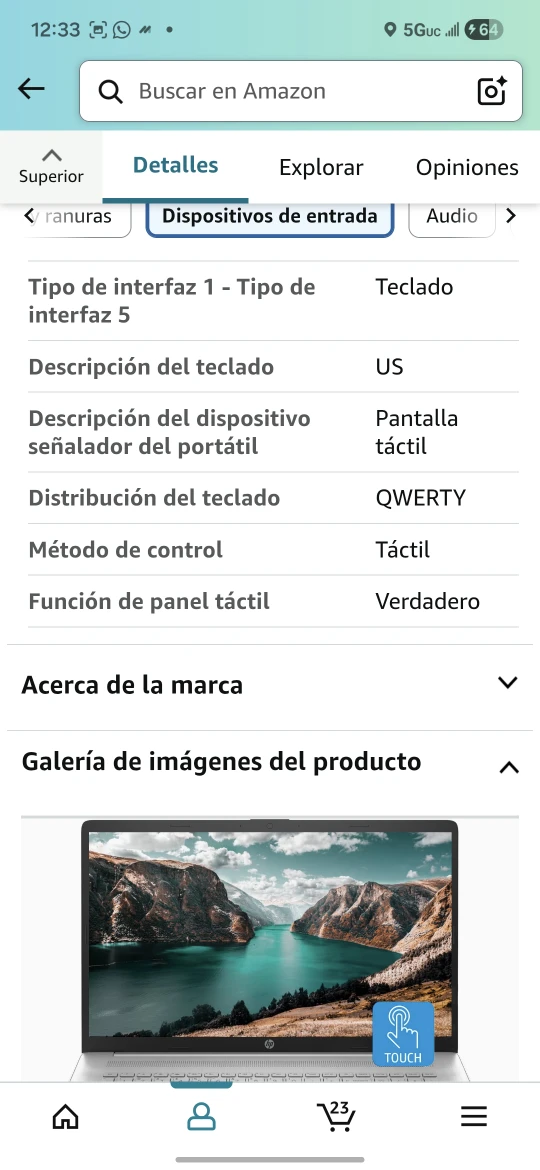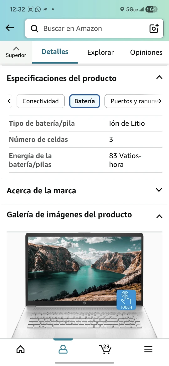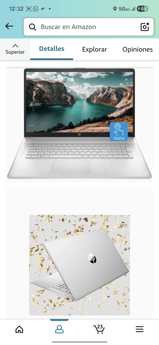 Selling an HP Portátil 17 laptop. It features a 17.3" HD+ touch screen, Intel Core i7-1255U processor, 64 GB of RAM, and a 1 TB SSD. It also has a webcam, HDMI, Wi-Fi, and Windows 11 Home. The laptop comes in a sleek silver color.