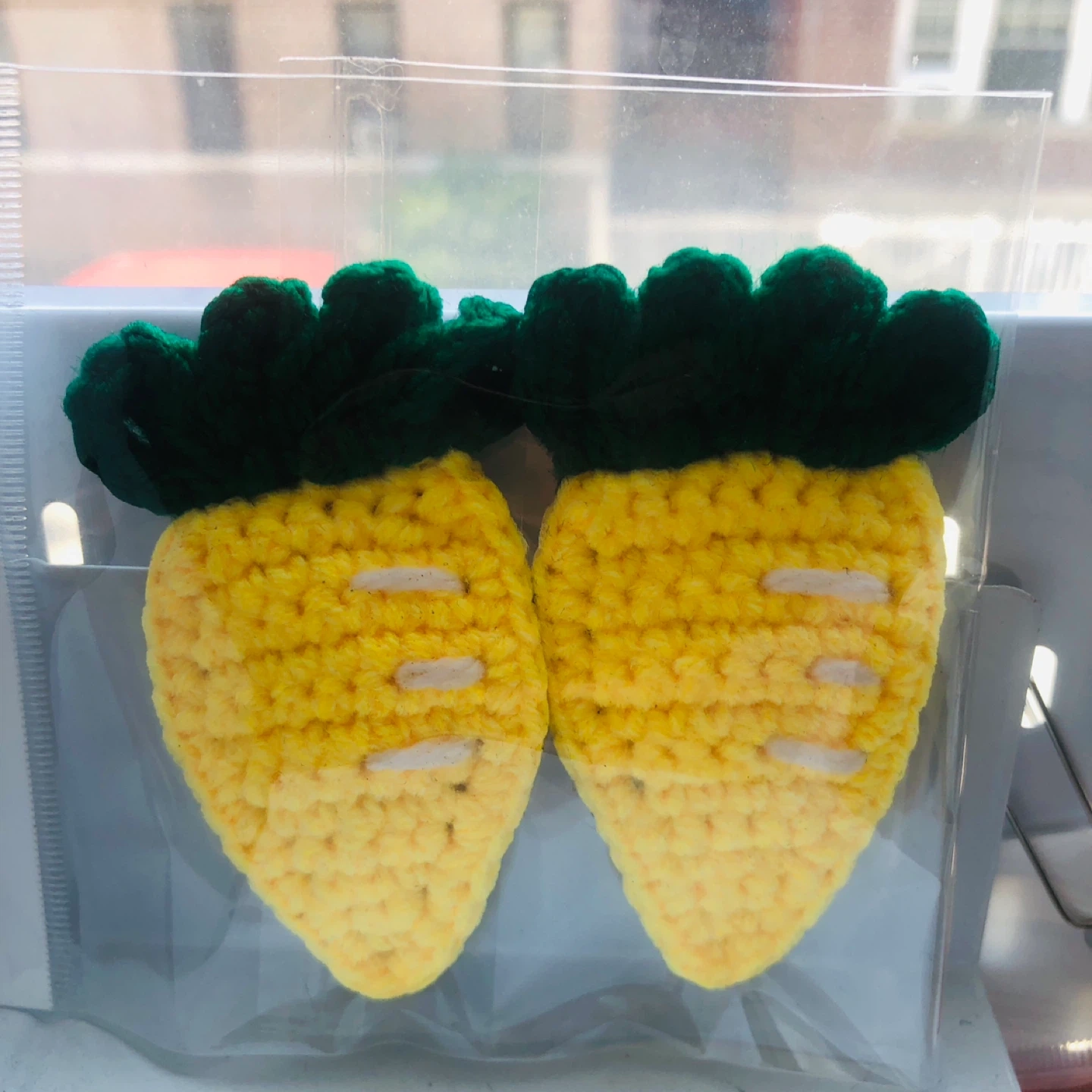 Adorable handmade hair clips shaped like carrots! These charming clips are perfect for adding a fun touch to any hairstyle. Made with crochet yarn, they're a delightful accessory for kids and adults alike.