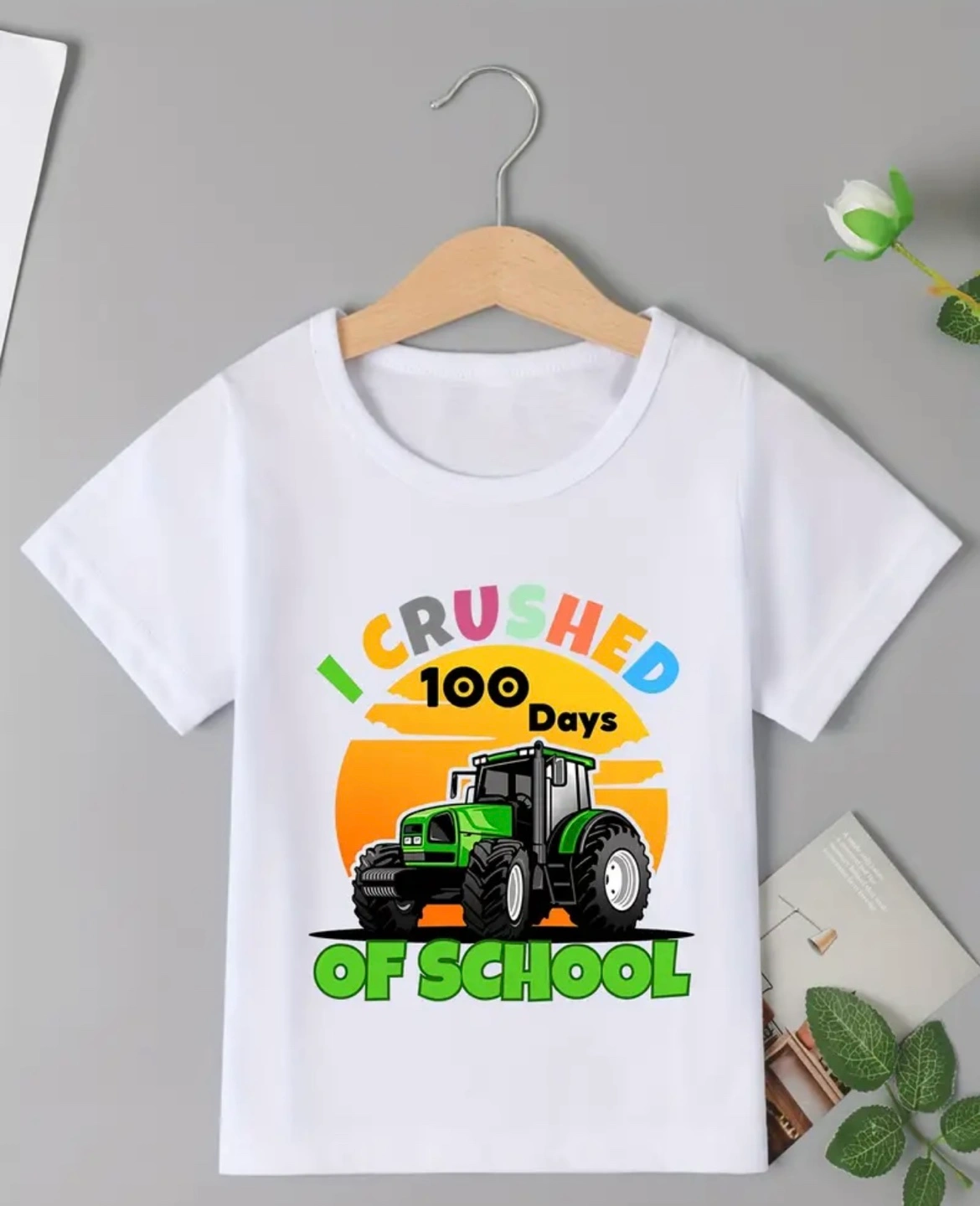 White short-sleeved t-shirt with a graphic of a tractor and the words "I Crushed 100 Days Of School".