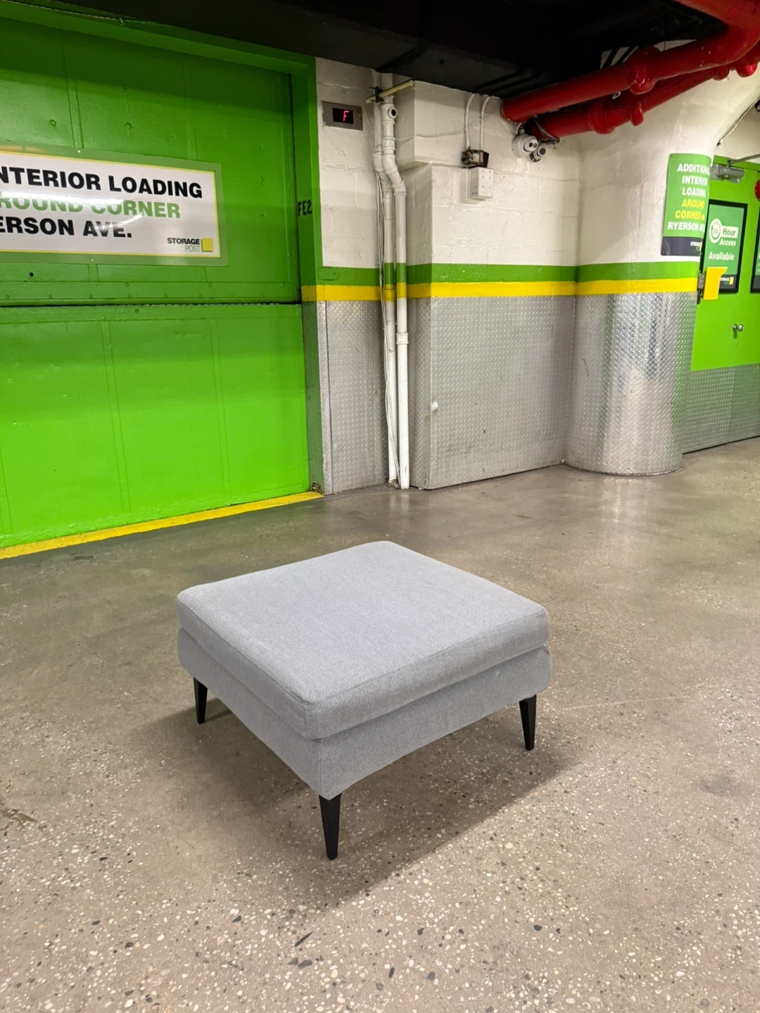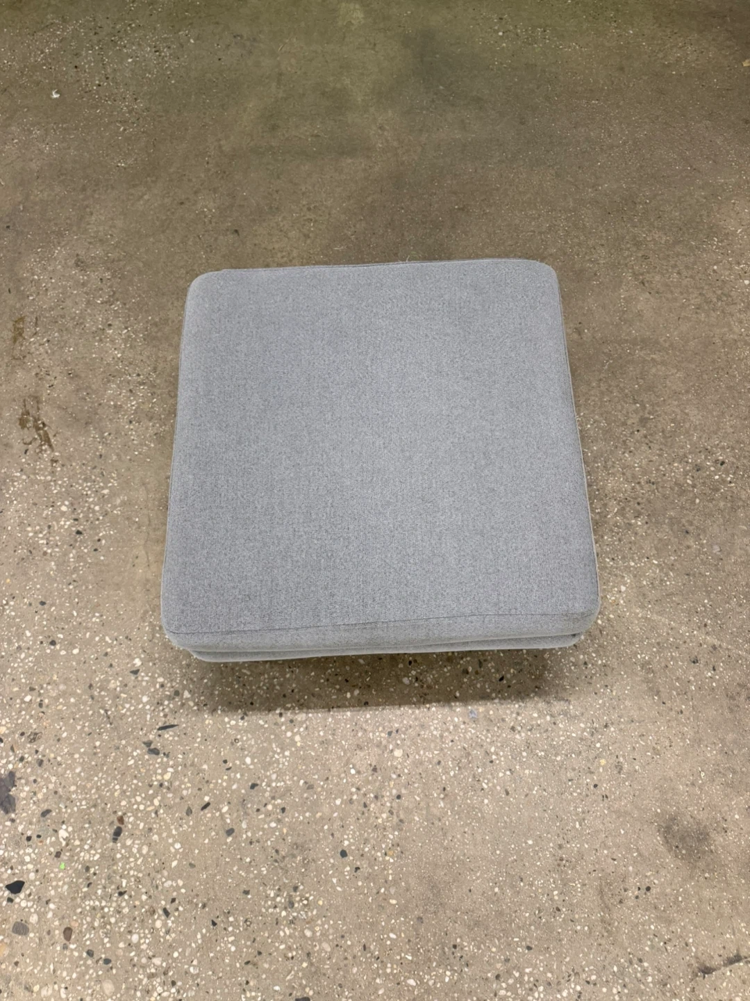 Selling a like-new LUCA Camden small grey fabric ottoman that offers both style and versatility. This modern piece features a durable polyester blend fabric, a solid timber frame, and sleek matte black alloy legs. It's perfect as a comfy footrest, extra seating.