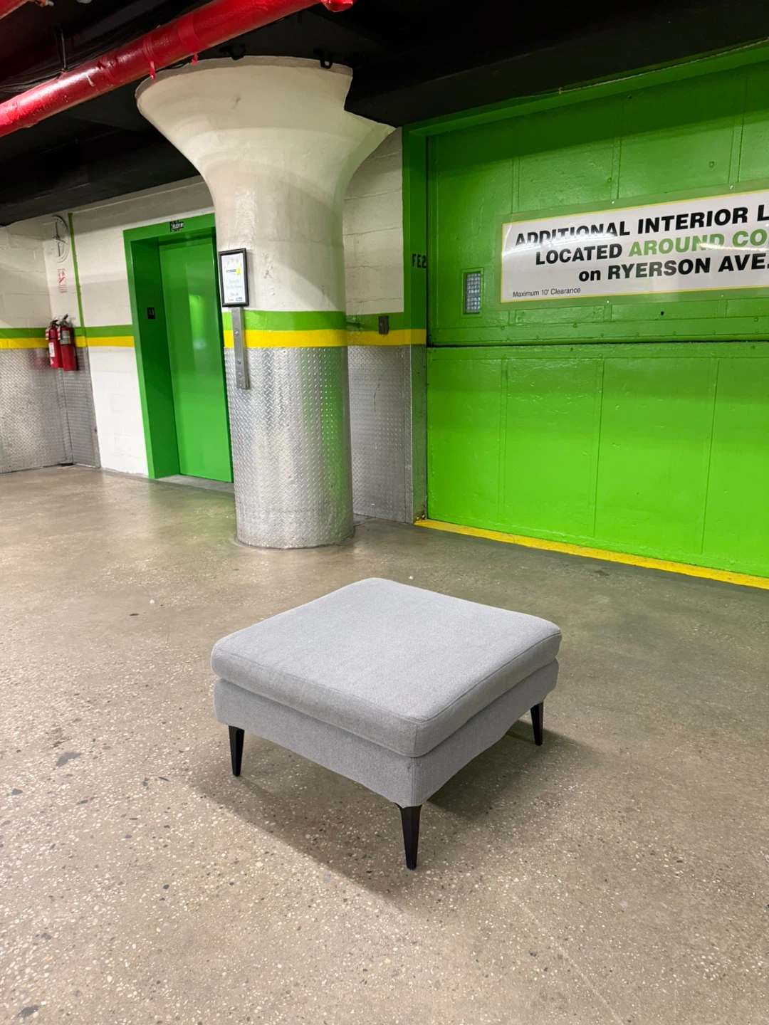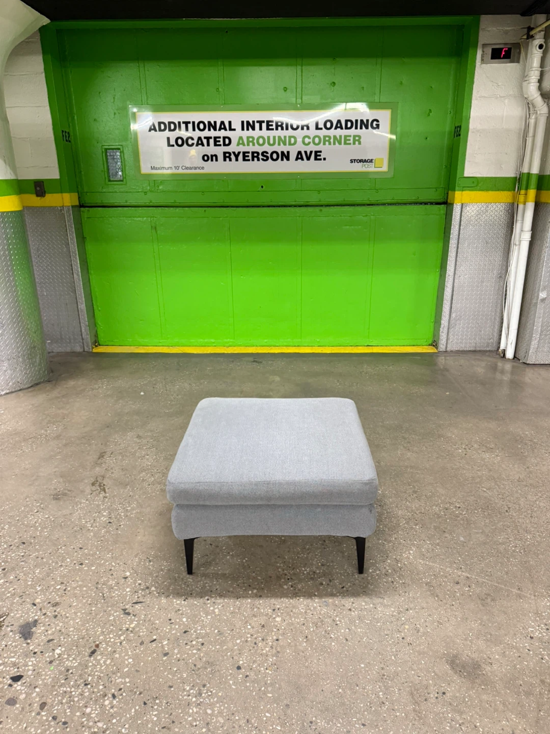 Selling a like-new LUCA Camden small grey fabric ottoman that offers both style and versatility. This modern piece features a durable polyester blend fabric, a solid timber frame, and sleek matte black alloy legs. It's perfect as a comfy footrest, extra seating.