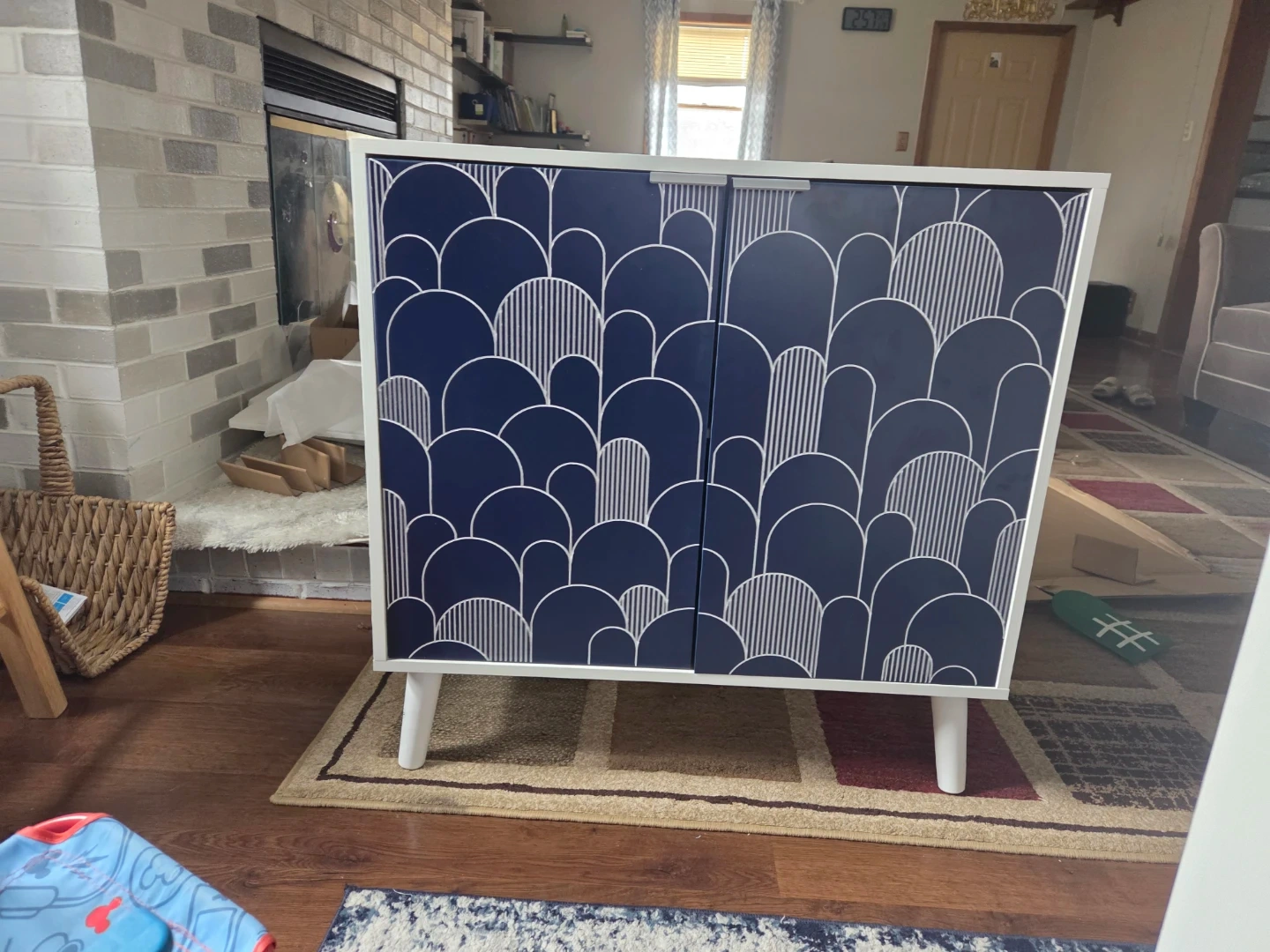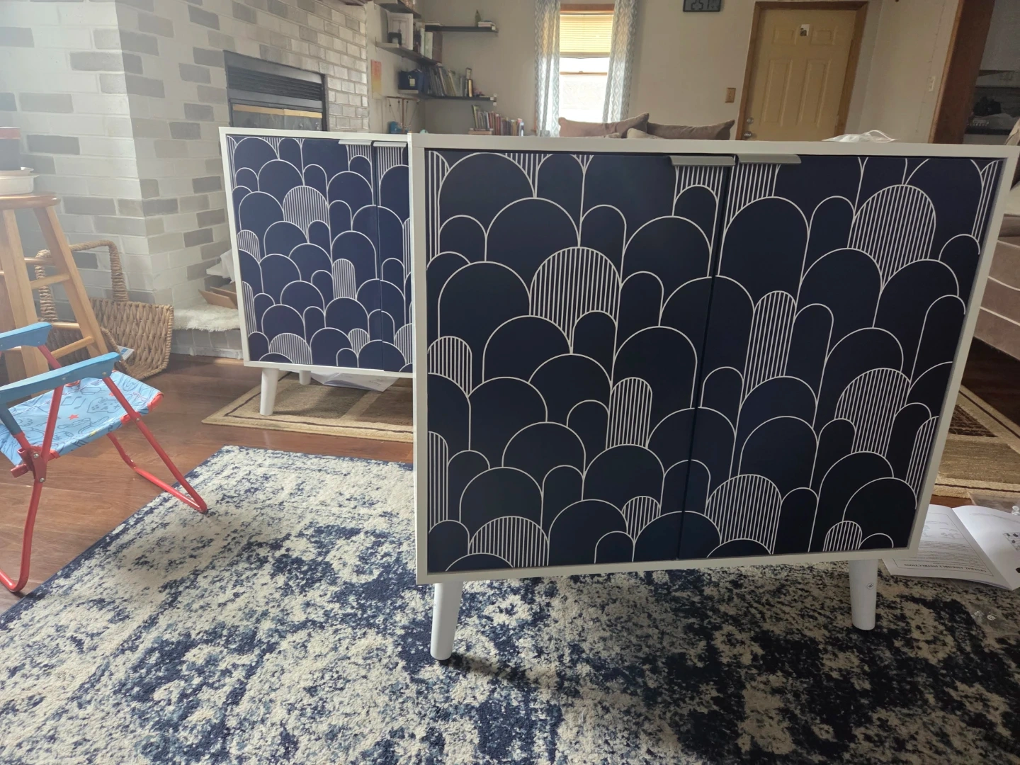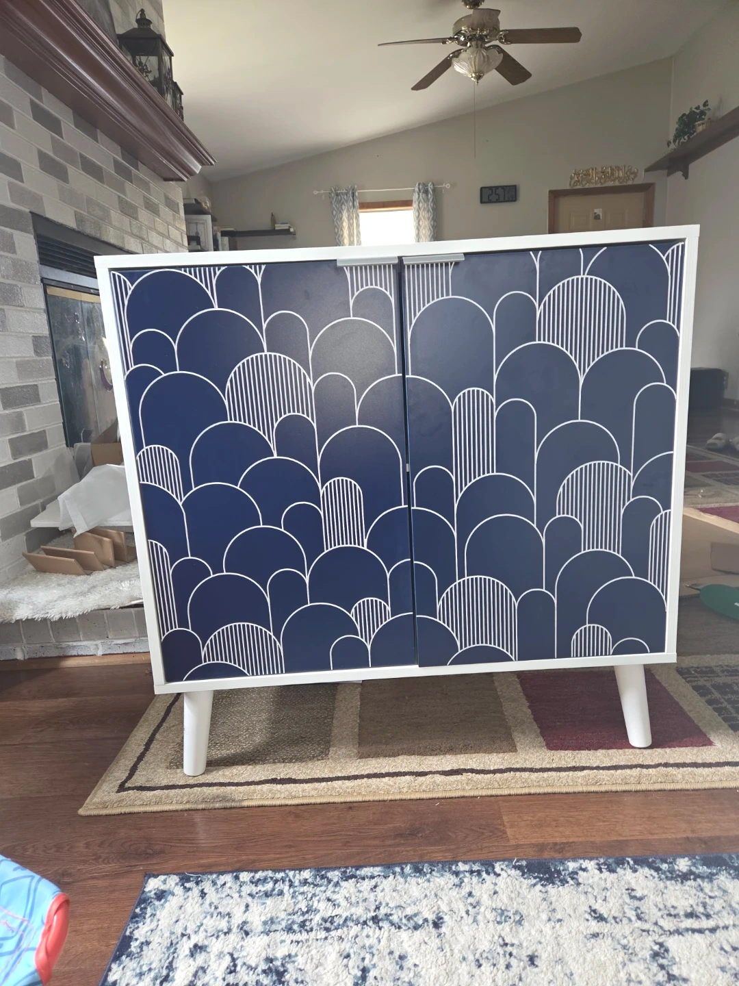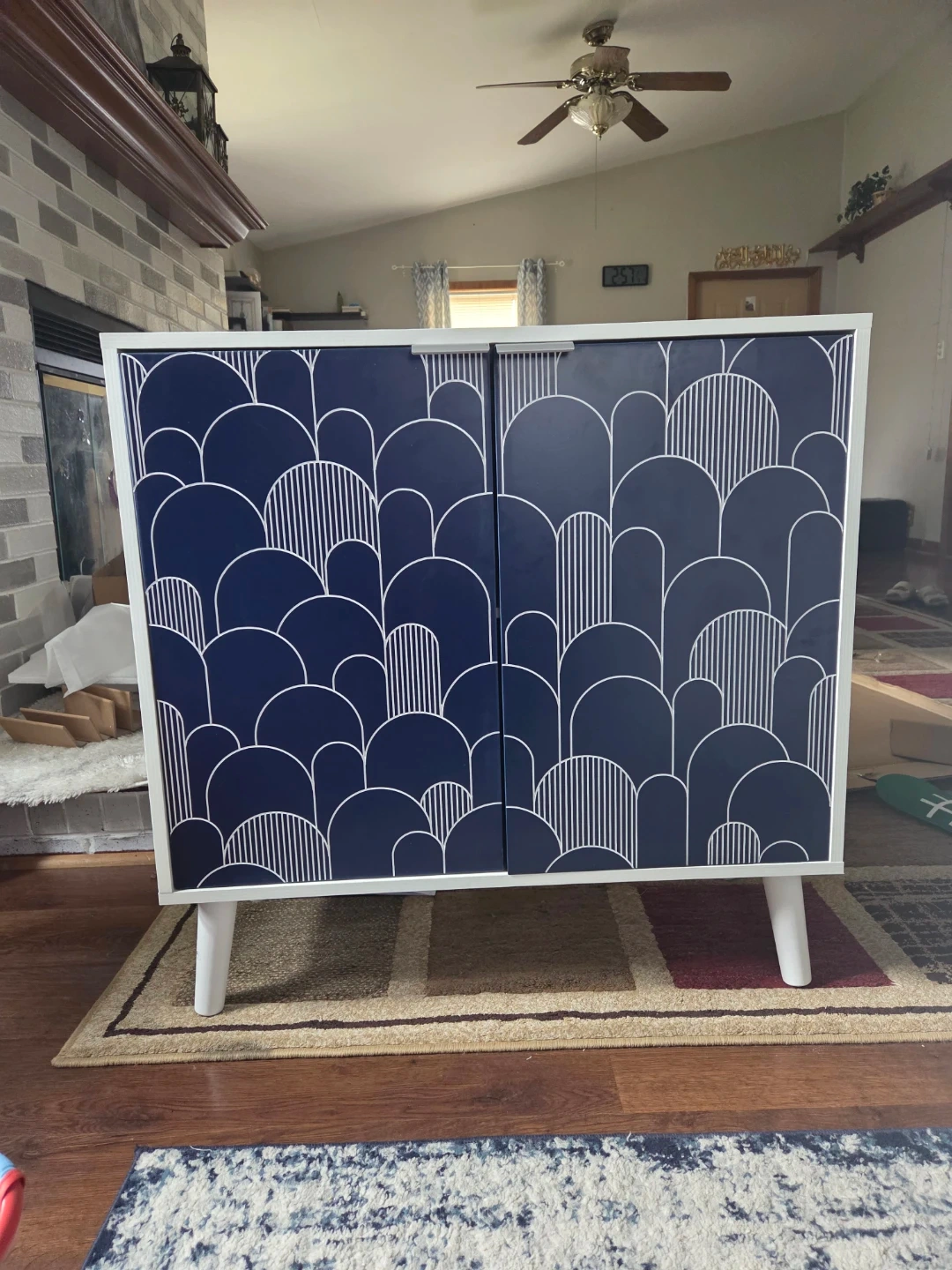This two-door cabinet features a navy blue finish with a white art deco-inspired pattern. It stands on four white legs for a modern look.